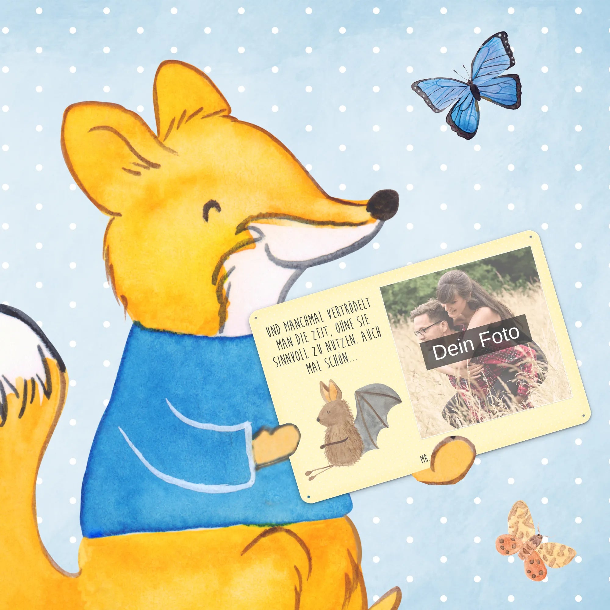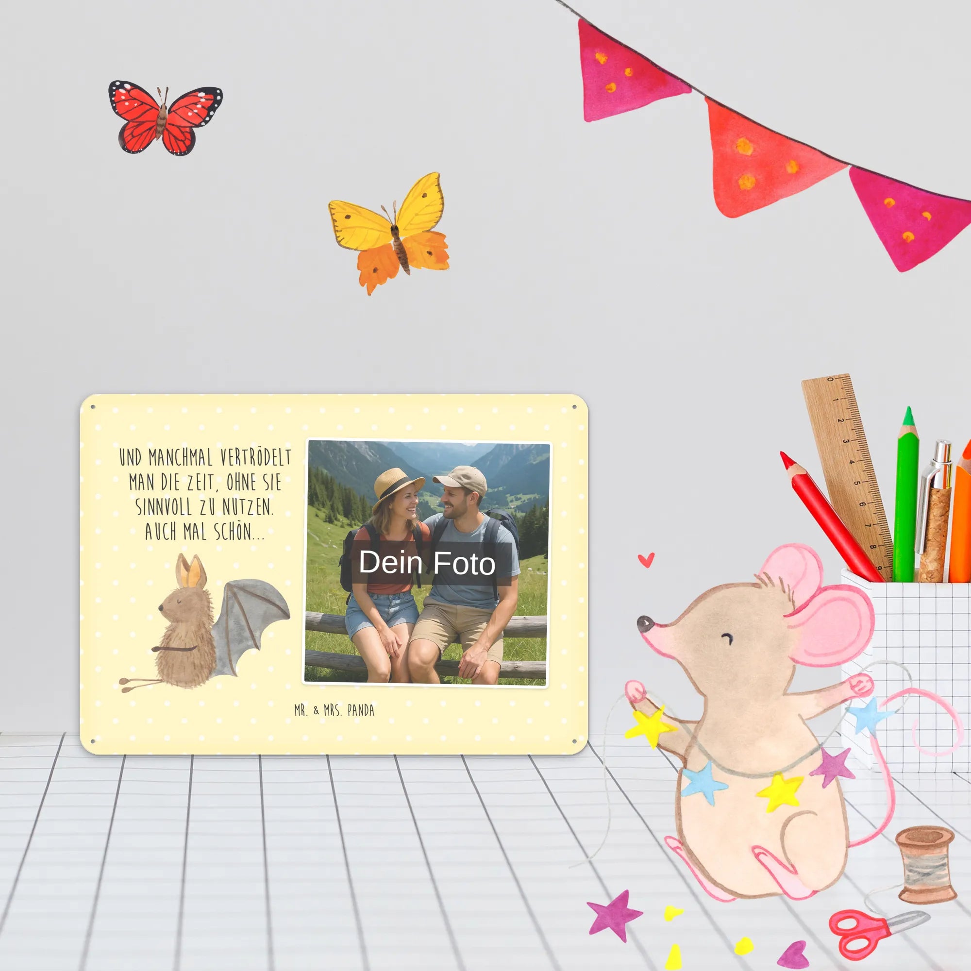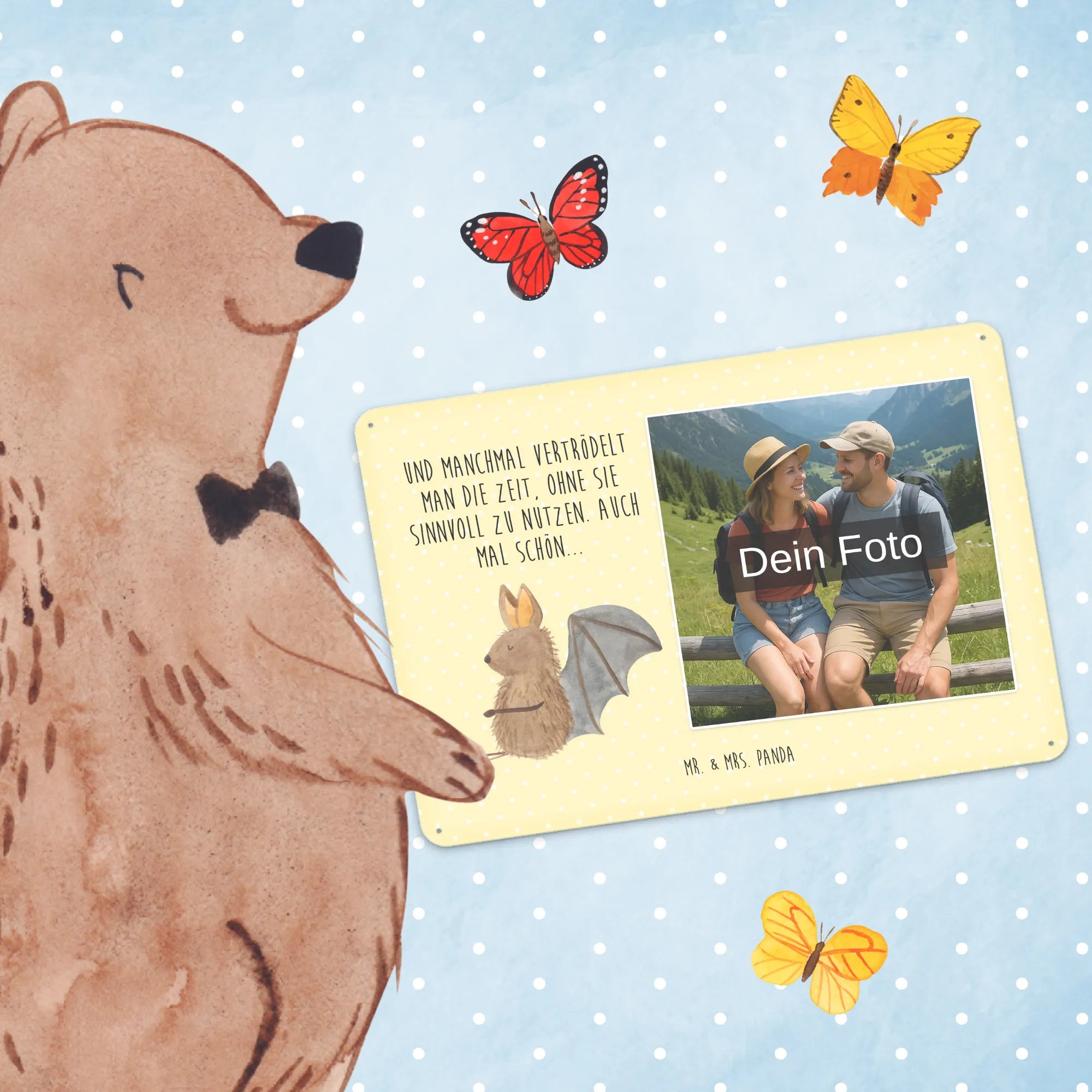 Gestalte dein persönliches Blechschild: Lade dein Foto hoch und kreiere ein einzigartiges Geschenk mit Mr. & Mrs. Panda – schnell gefertigt, liebevoll verpackt.