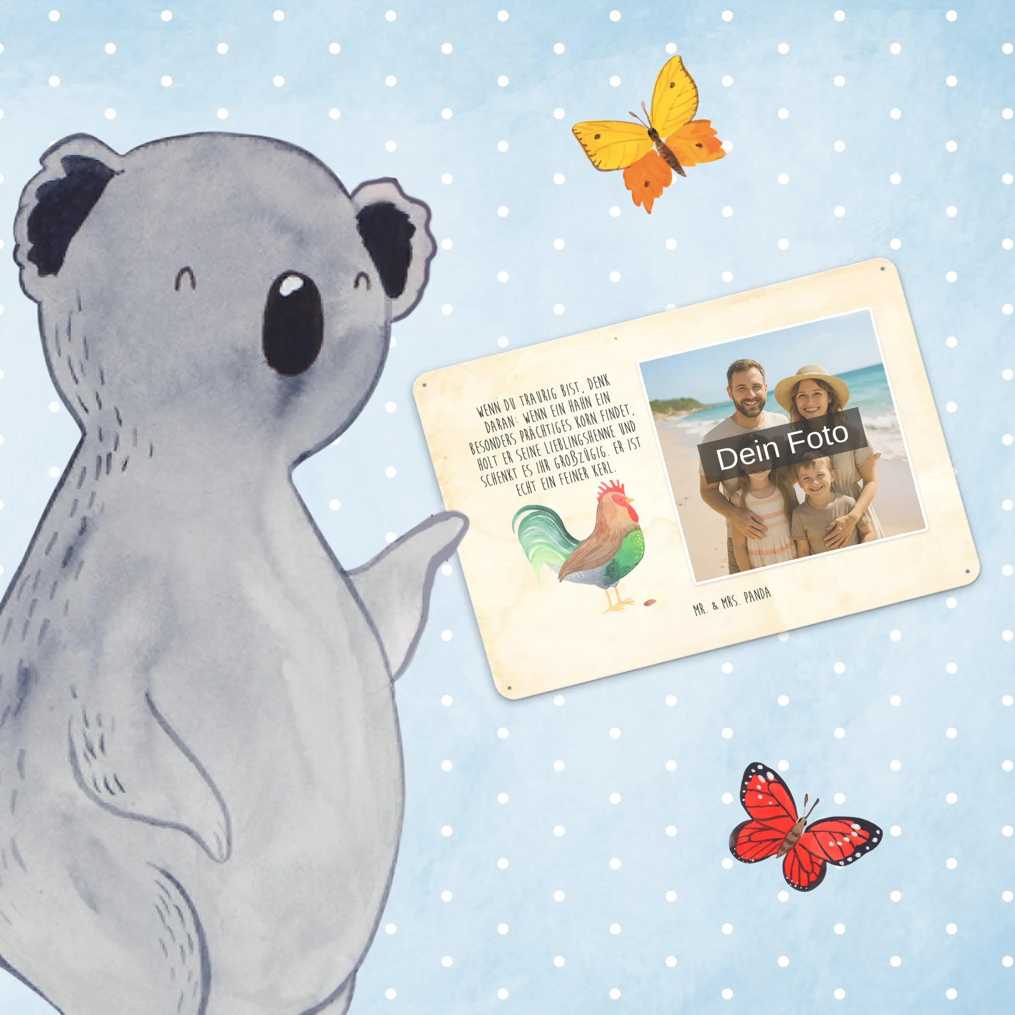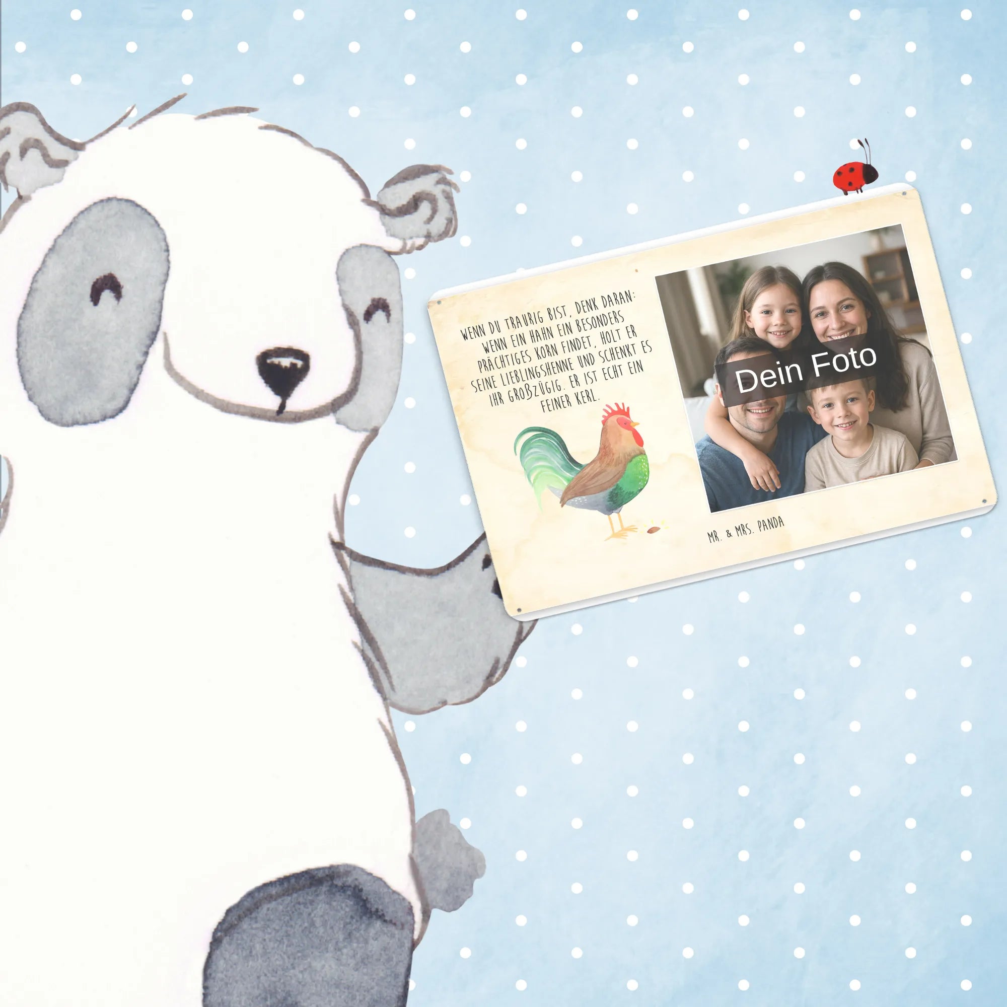 Gestalte dein persönliches Blechschild: Lade dein Foto hoch und kreiere ein einzigartiges Geschenk mit Mr. & Mrs. Panda – schnell gefertigt, liebevoll verpackt.