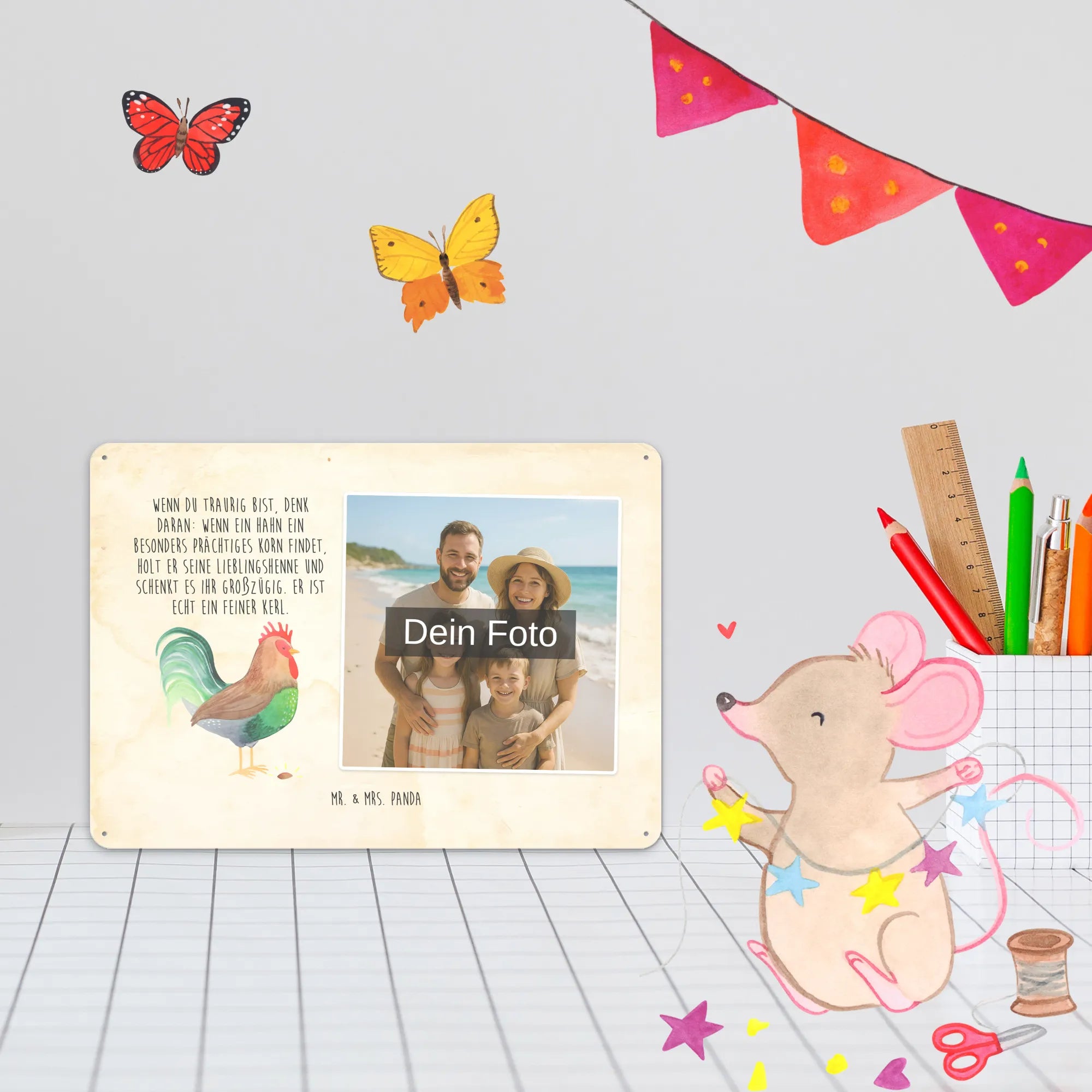 Blechschild mit eigenem Foto personalisiert – liebevoll gestaltet von Mr. & Mrs. Panda. Dieses edle Schild wird mit deinem Foto und unseren niedlichen Illustrationen bedruckt, sodass ein individuelles Dekostück entsteht. Achte unbedingt auf gute Bildqualität und geeigneten Bildausschnitt, damit das Motiv klar und harmonisch wirkt. Bitte nur eigene Bilder oder solche mit Nutzungsrecht hochladen. Gefertigt aus hochwertigem Stahlblech ohne Wölbung mit seidenmatter Oberfläche, bietet das Schild eine edle Optik. Maße: 70 mm x 297 mm x 210 mm. Der Druck ist langlebig und hochwertig verarbeitet. Für sicheren Halt gibt es vier Bohrungen, umgefalzte Kanten und abgerundete Ecken. Ideal für Innenräume, ob an der Tür, im Eingangsbereich oder an der Wohnzimmerwand. Pflegeleicht: einfach mit einem feuchten Tuch abwischen. In mehreren Größen erhältlich, so findest du garantiert die passende Variante. Verschenke Erinnerungen oder gestalte dein Zuhause persönlich — mit dem Blechschild mit eigenem Foto personalisiert von Mr. & Mrs. Panda wird jeder Raum ein Stückchen liebevoller.