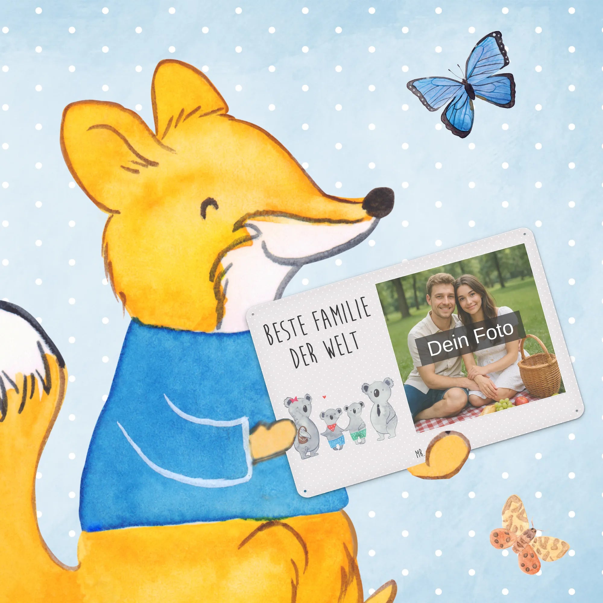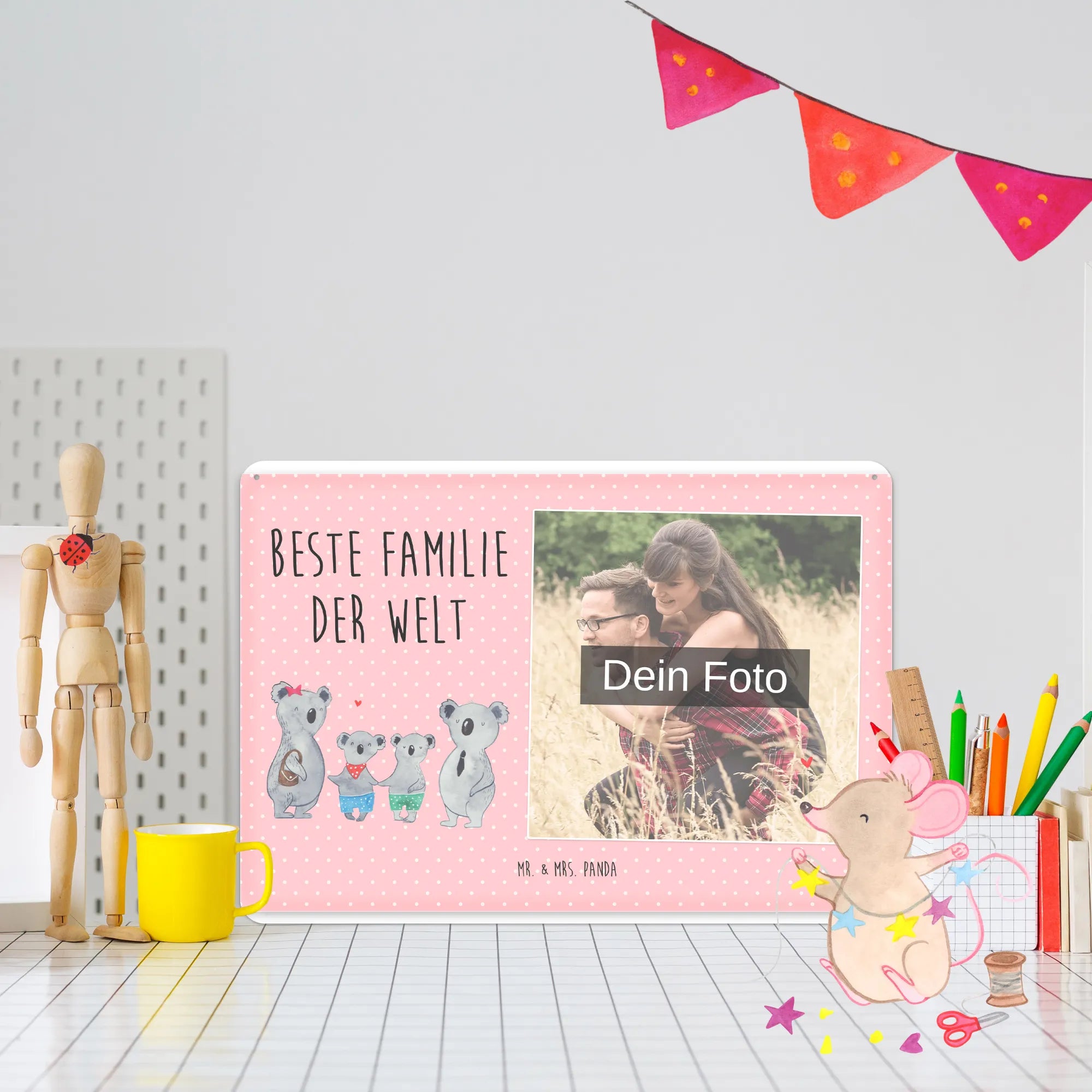 Dieses liebevoll gestaltete Metallschild vereint Persönlichkeit und Design: Die süße Koalafamilie – Mama mit rotem Sternchen, Papa im Anzug und zwei fröhliche Kinder – symbolisiert Nähe, Wärme und Zusammenhalt. Der Slogan „Beste Familie der Welt“ macht das Blechschild mit Foto zur perfekten Botschaft für alle Liebsten.