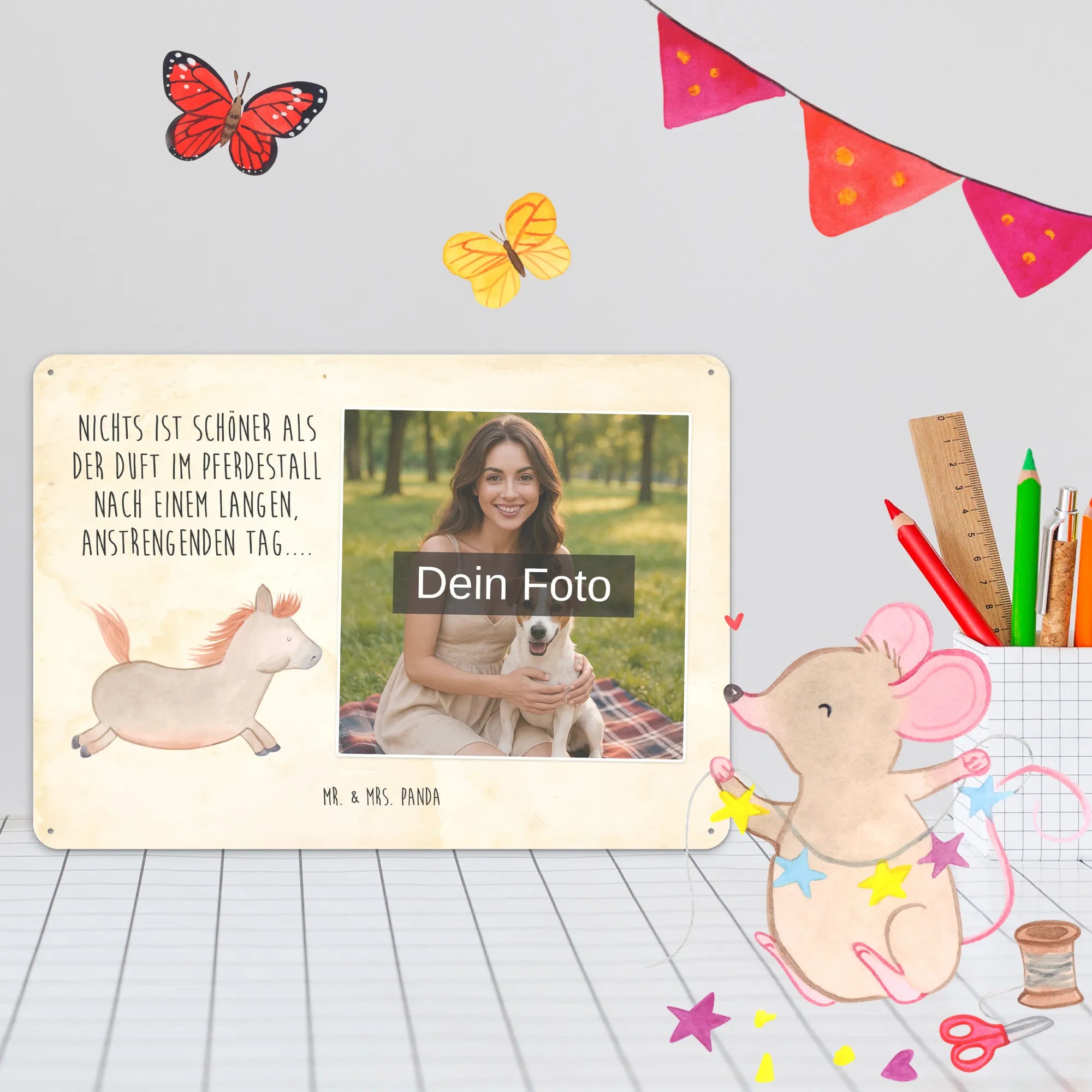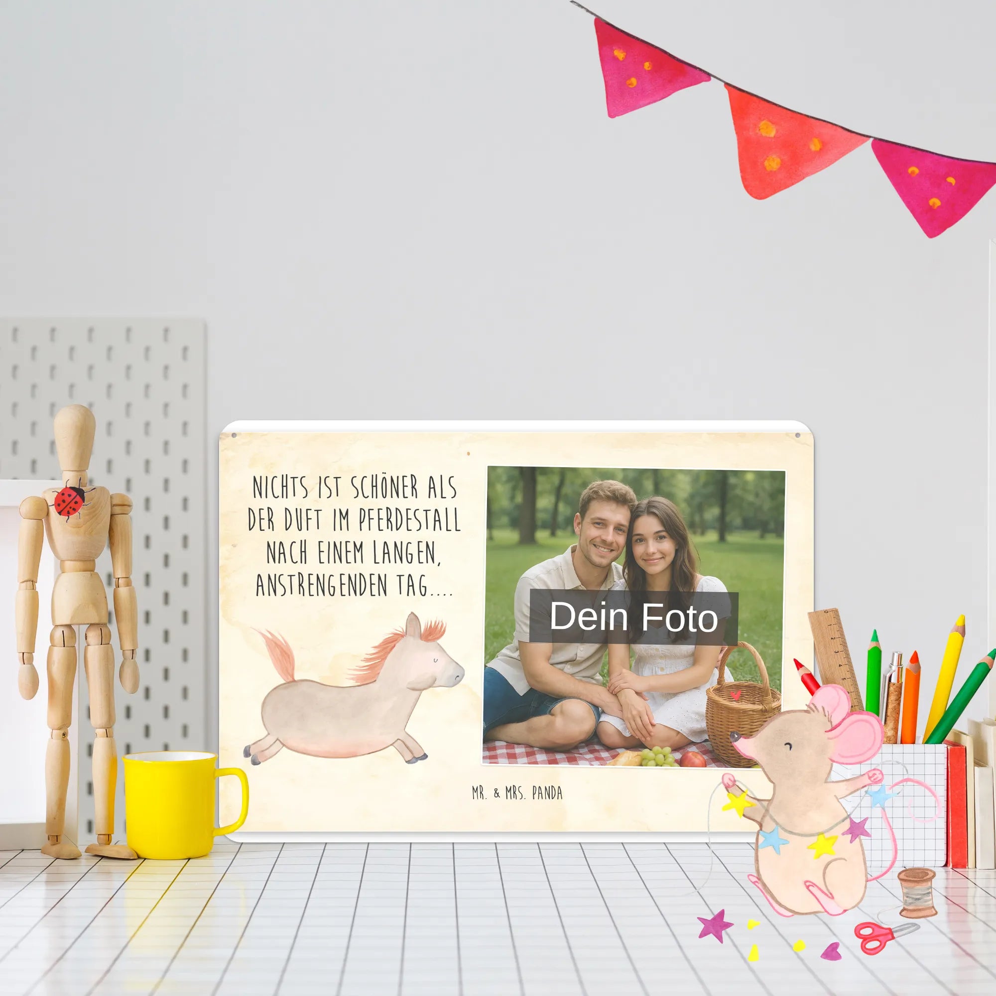 Blechschild mit eigenem Foto personalisiert – liebevoll gestaltet von Mr. & Mrs. Panda. Dieses edle Schild wird mit deinem Foto und unseren niedlichen Illustrationen bedruckt, sodass ein individuelles Dekostück entsteht. Achte unbedingt auf gute Bildqualität und geeigneten Bildausschnitt, damit das Motiv klar und harmonisch wirkt. Bitte nur eigene Bilder oder solche mit Nutzungsrecht hochladen. Gefertigt aus hochwertigem Stahlblech ohne Wölbung mit seidenmatter Oberfläche, bietet das Schild eine edle Optik. Maße: 70 mm x 297 mm x 210 mm. Der Druck ist langlebig und hochwertig verarbeitet. Für sicheren Halt gibt es vier Bohrungen, umgefalzte Kanten und abgerundete Ecken. Ideal für Innenräume, ob an der Tür, im Eingangsbereich oder an der Wohnzimmerwand. Pflegeleicht: einfach mit einem feuchten Tuch abwischen. In mehreren Größen erhältlich, so findest du garantiert die passende Variante. Verschenke Erinnerungen oder gestalte dein Zuhause persönlich — mit dem Blechschild mit eigenem Foto personalisiert von Mr. & Mrs. Panda wird jeder Raum ein Stückchen liebevoller.