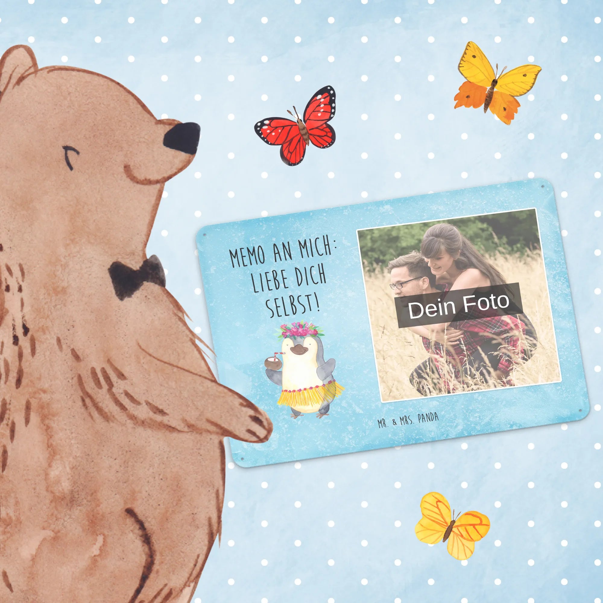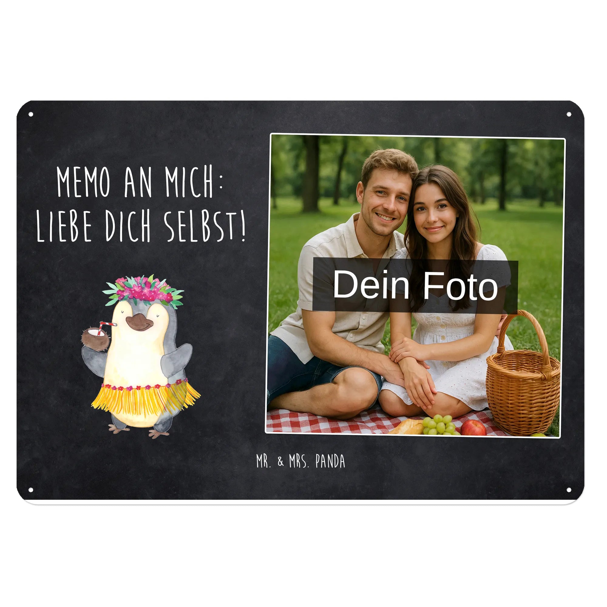Schenke Persönlichkeit: Erstelle jetzt dein personalisierbares Blechschild Foto mit Mr. & Mrs. Panda – Foto hochladen, Text hinzufügen, bestellen und Freude verschenken.