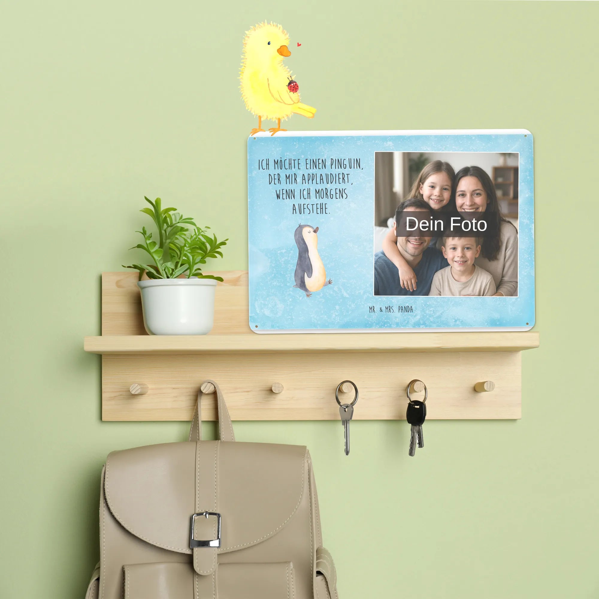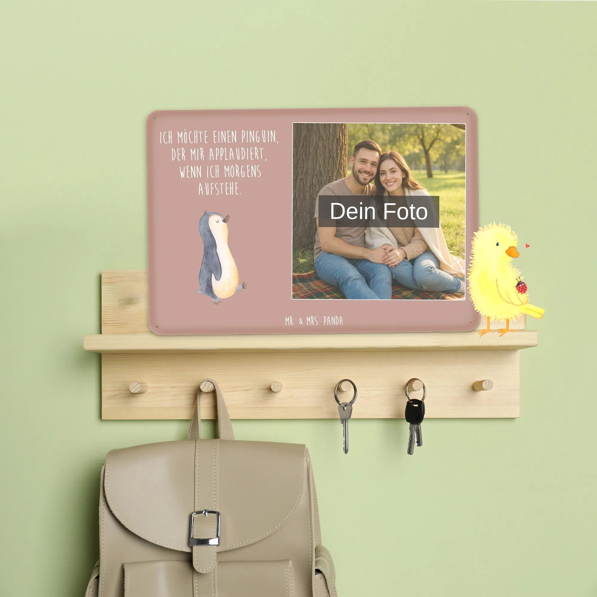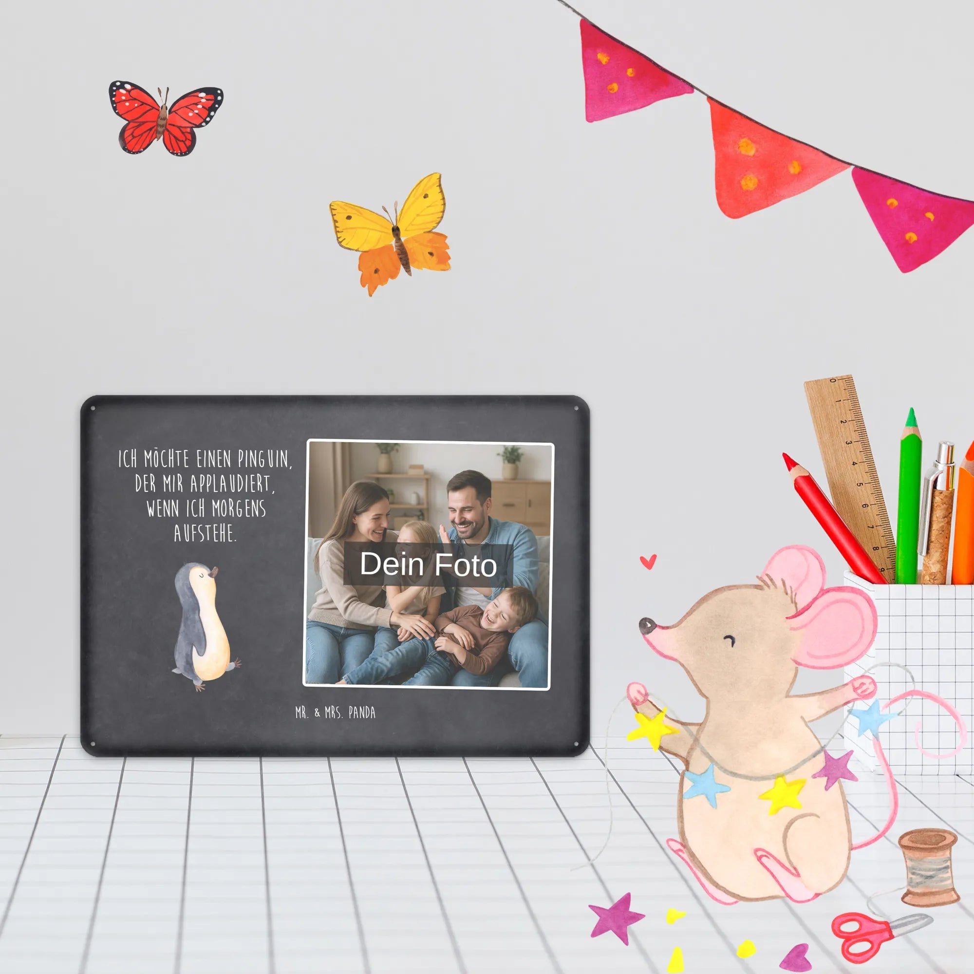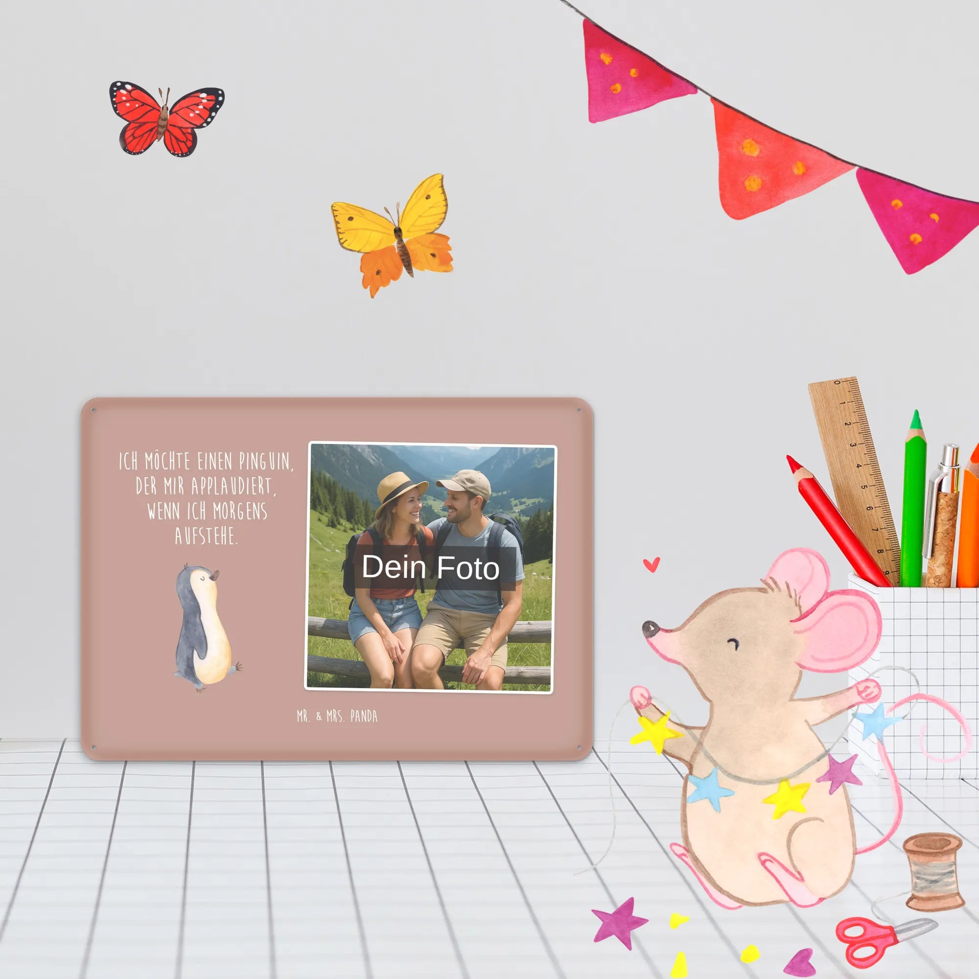 Blechschild mit eigenem Foto personalisiert – liebevoll gestaltet von Mr. & Mrs. Panda. Dieses edle Schild wird mit deinem Foto und unseren niedlichen Illustrationen bedruckt, sodass ein individuelles Dekostück entsteht. Achte unbedingt auf gute Bildqualität und geeigneten Bildausschnitt, damit das Motiv klar und harmonisch wirkt. Bitte nur eigene Bilder oder solche mit Nutzungsrecht hochladen. Gefertigt aus hochwertigem Stahlblech ohne Wölbung mit seidenmatter Oberfläche, bietet das Schild eine edle Optik. Maße: 70 mm x 297 mm x 210 mm. Der Druck ist langlebig und hochwertig verarbeitet. Für sicheren Halt gibt es vier Bohrungen, umgefalzte Kanten und abgerundete Ecken. Ideal für Innenräume, ob an der Tür, im Eingangsbereich oder an der Wohnzimmerwand. Pflegeleicht: einfach mit einem feuchten Tuch abwischen. In mehreren Größen erhältlich, so findest du garantiert die passende Variante. Verschenke Erinnerungen oder gestalte dein Zuhause persönlich — mit dem Blechschild mit eigenem Foto personalisiert von Mr. & Mrs. Panda wird jeder Raum ein Stückchen liebevoller.