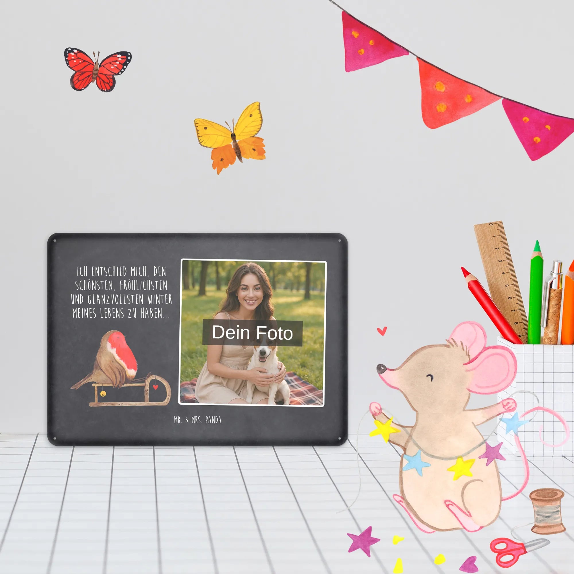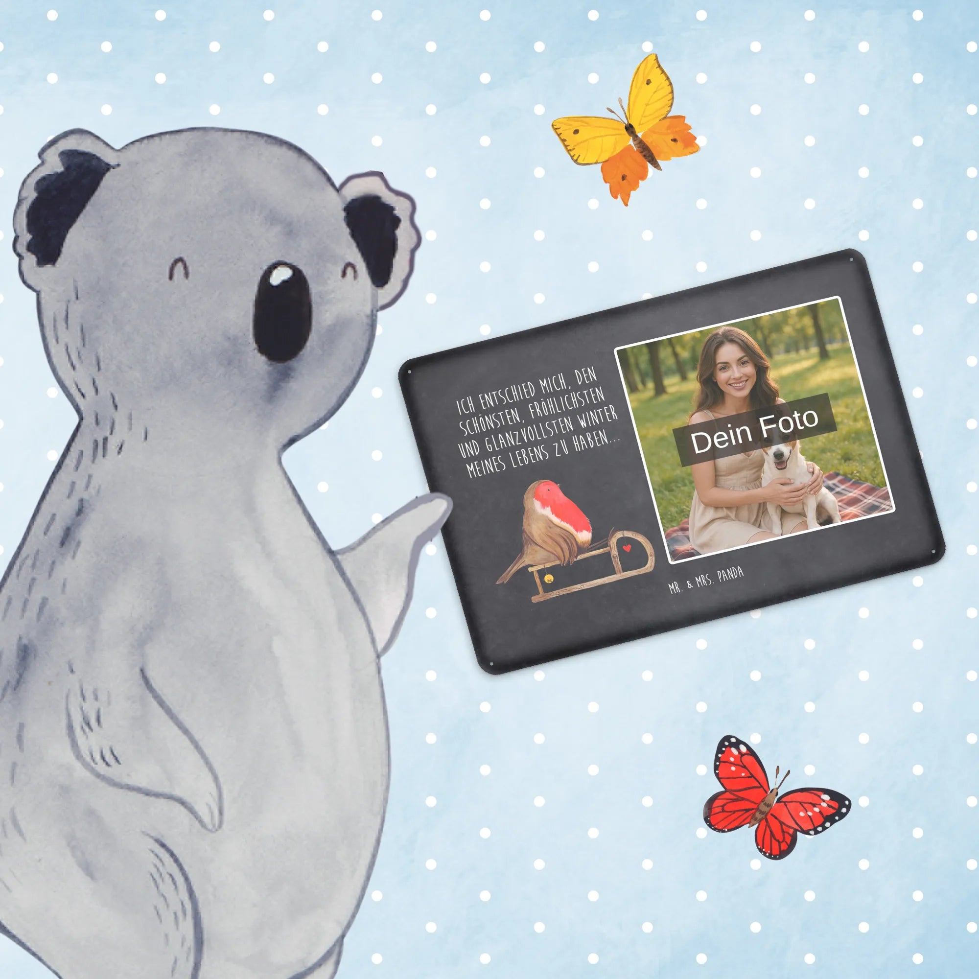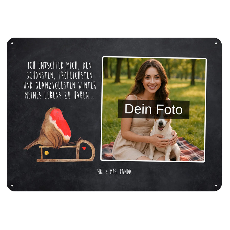 Personalisiertes Foto Blechschild Rotkehlchen Schlitten - DIN A6 - Kreidetafel
