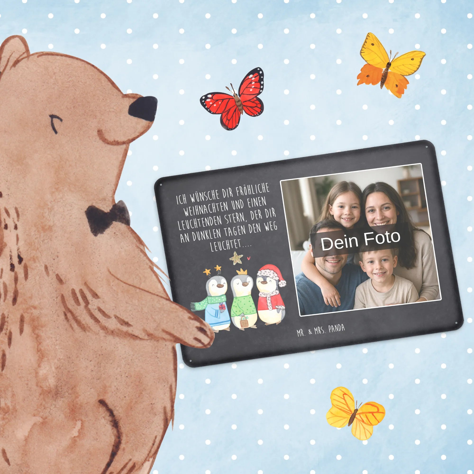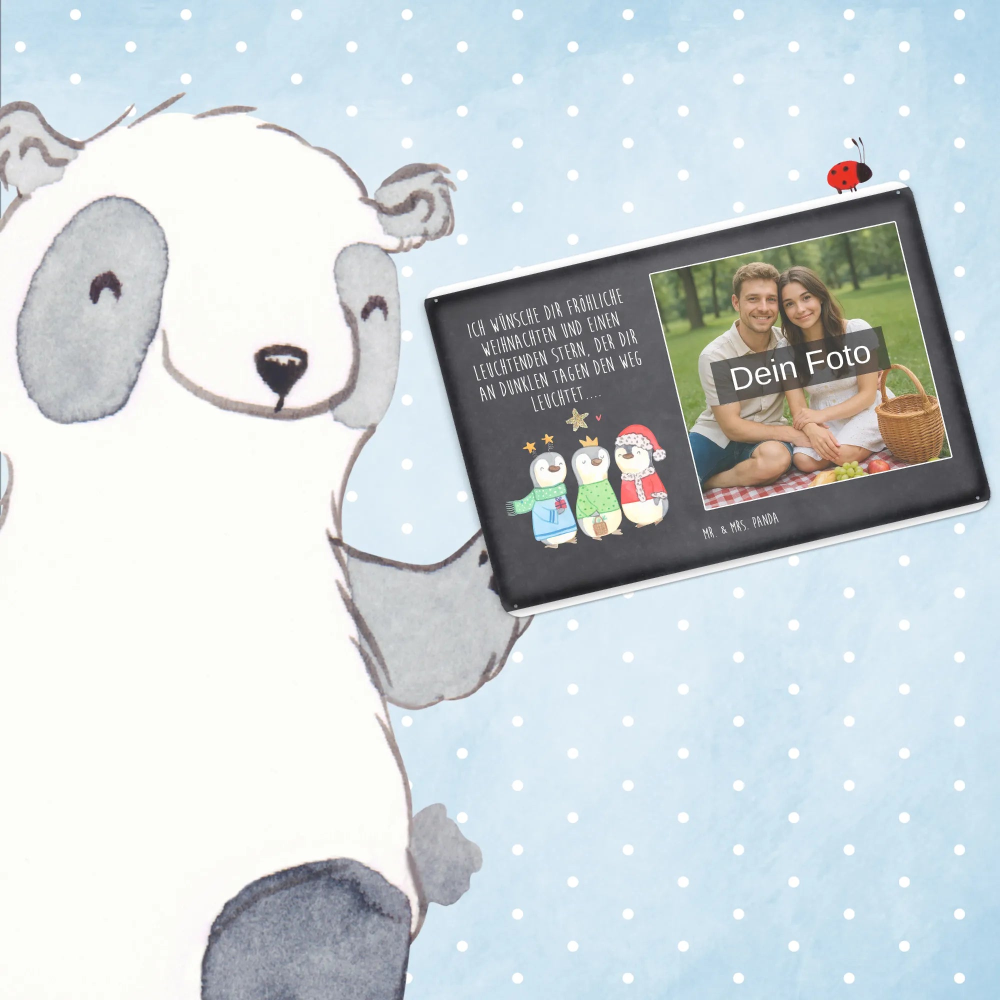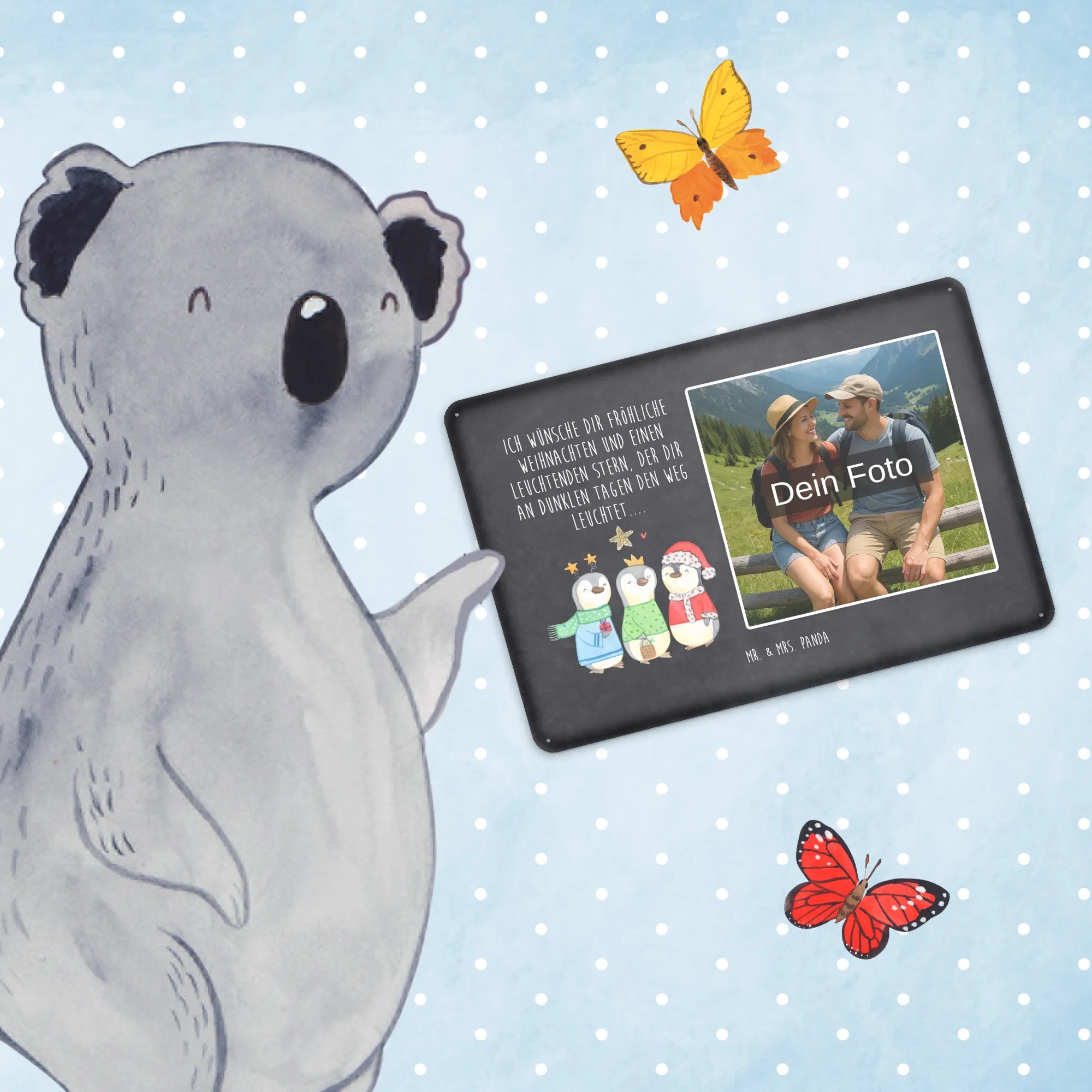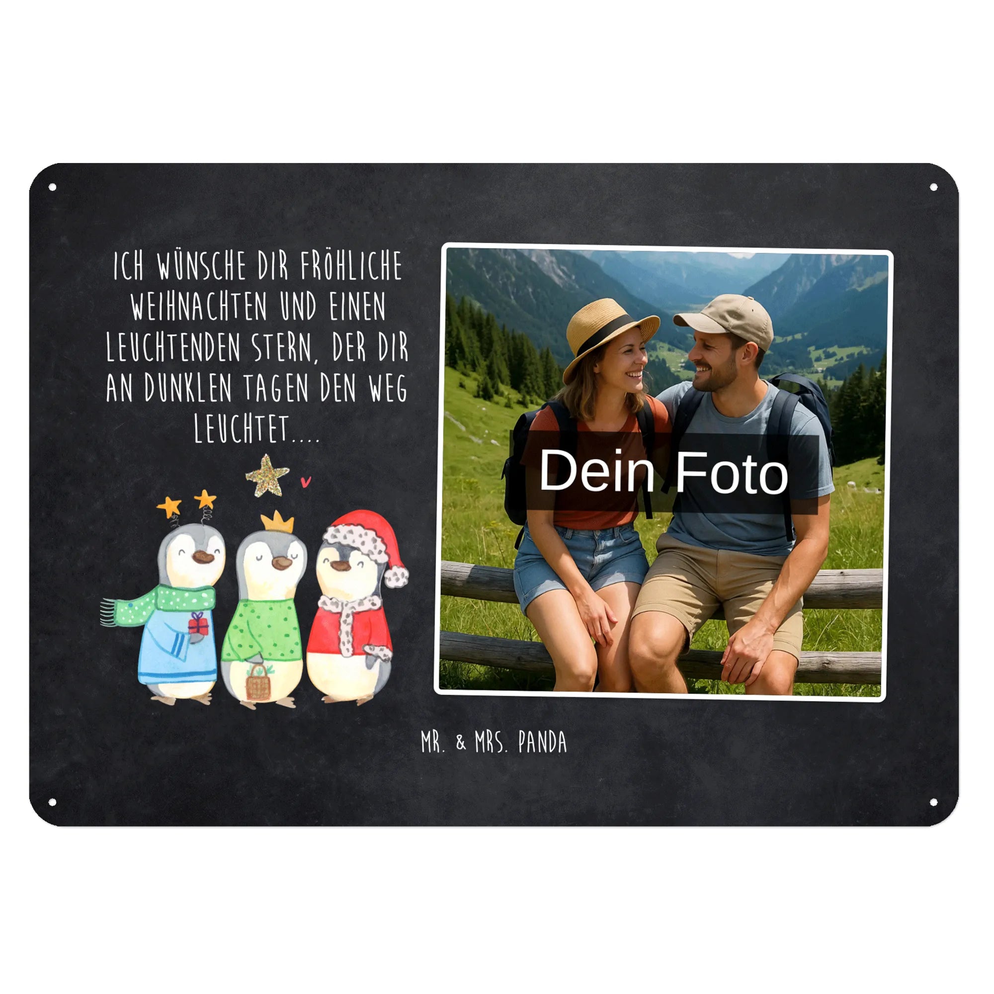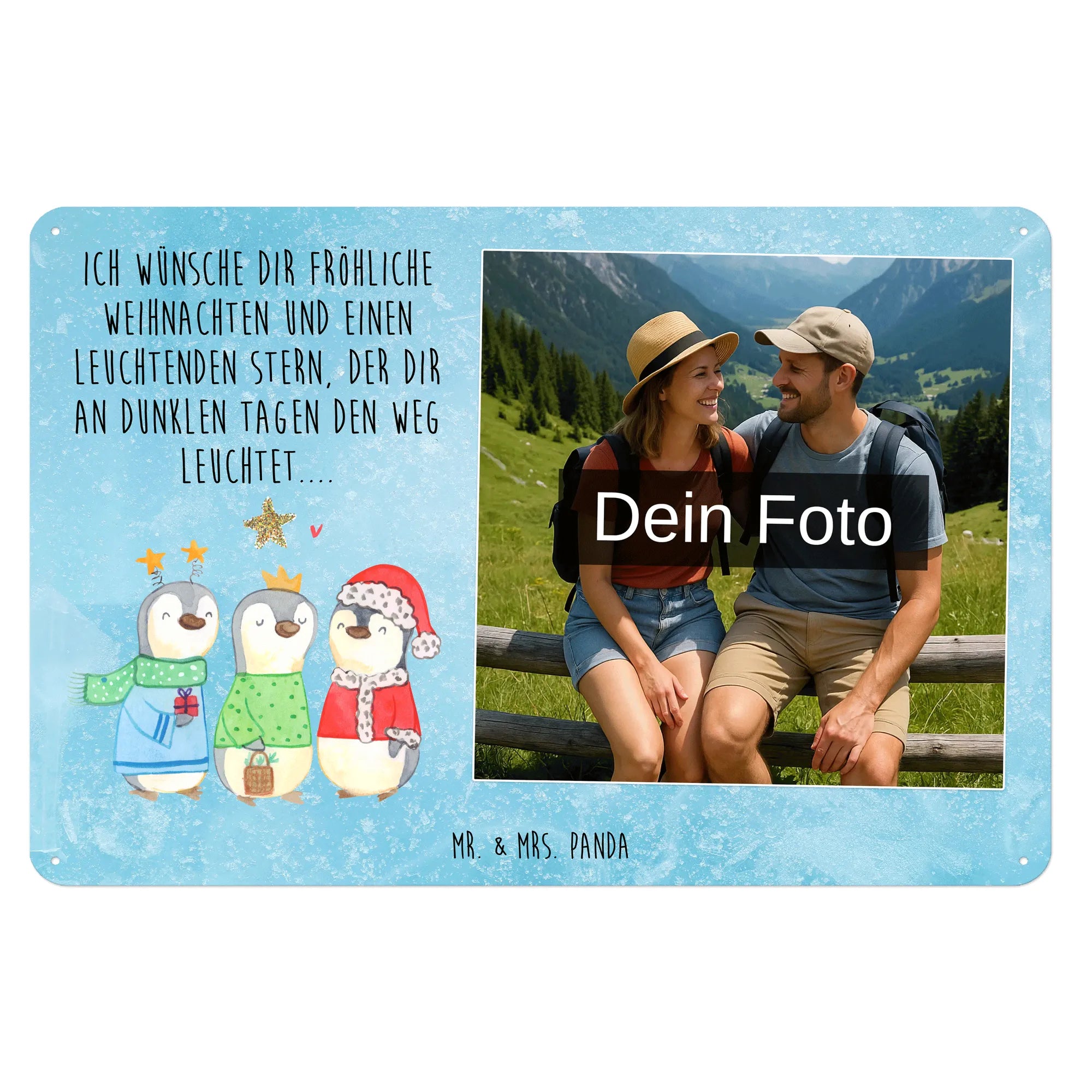 Gestalte dein persönliches Blechschild: Lade dein Foto hoch und kreiere ein einzigartiges Geschenk mit Mr. & Mrs. Panda – schnell gefertigt, liebevoll verpackt.
