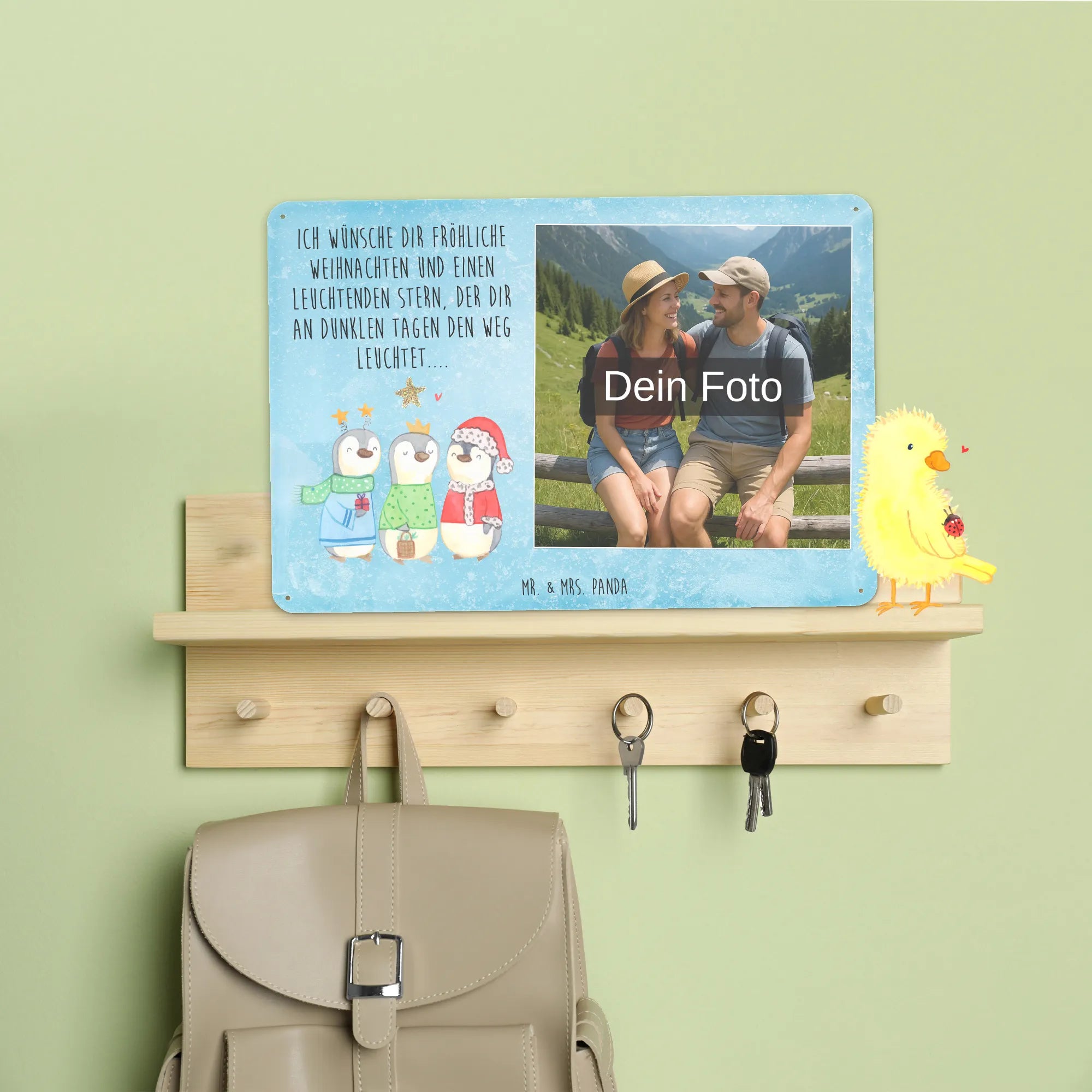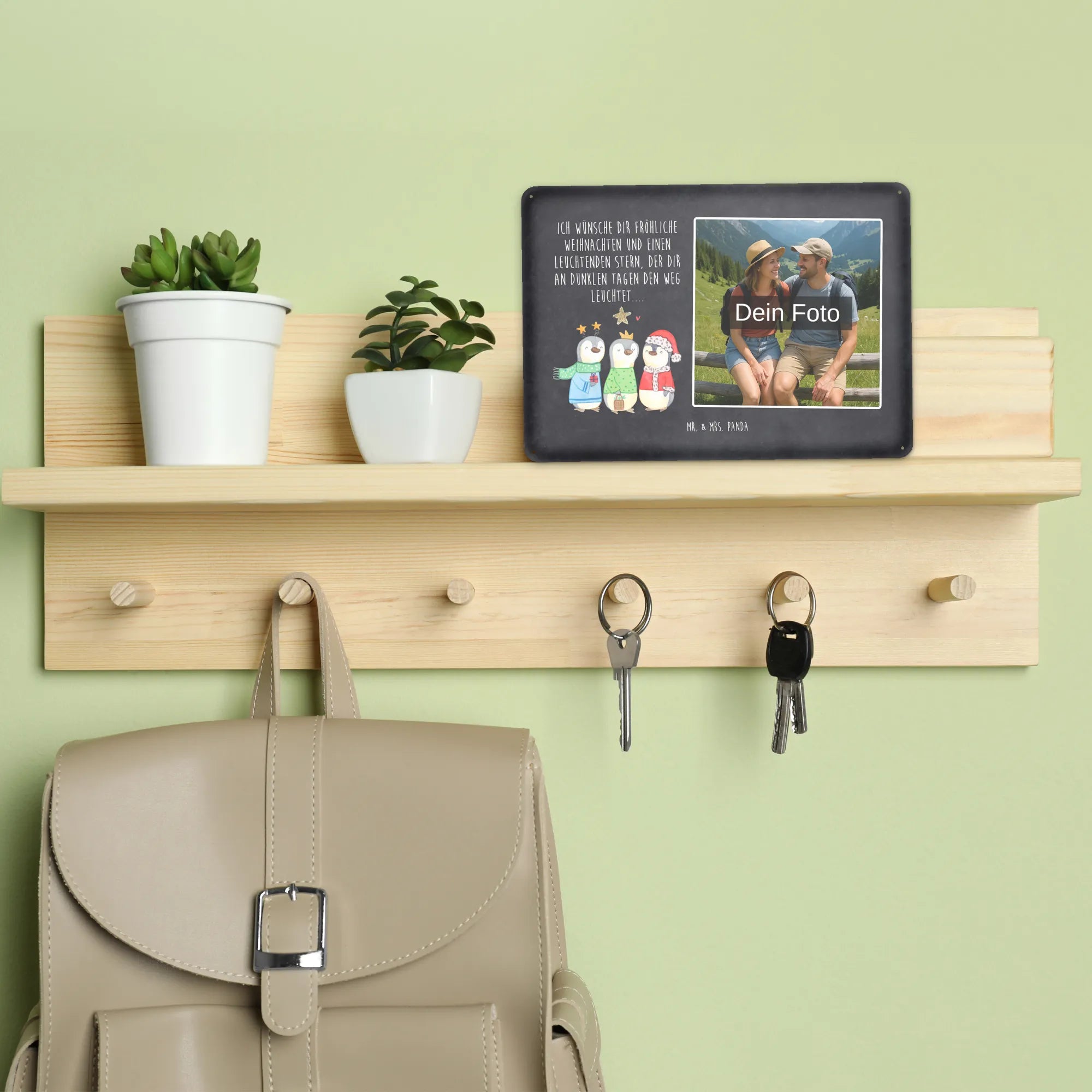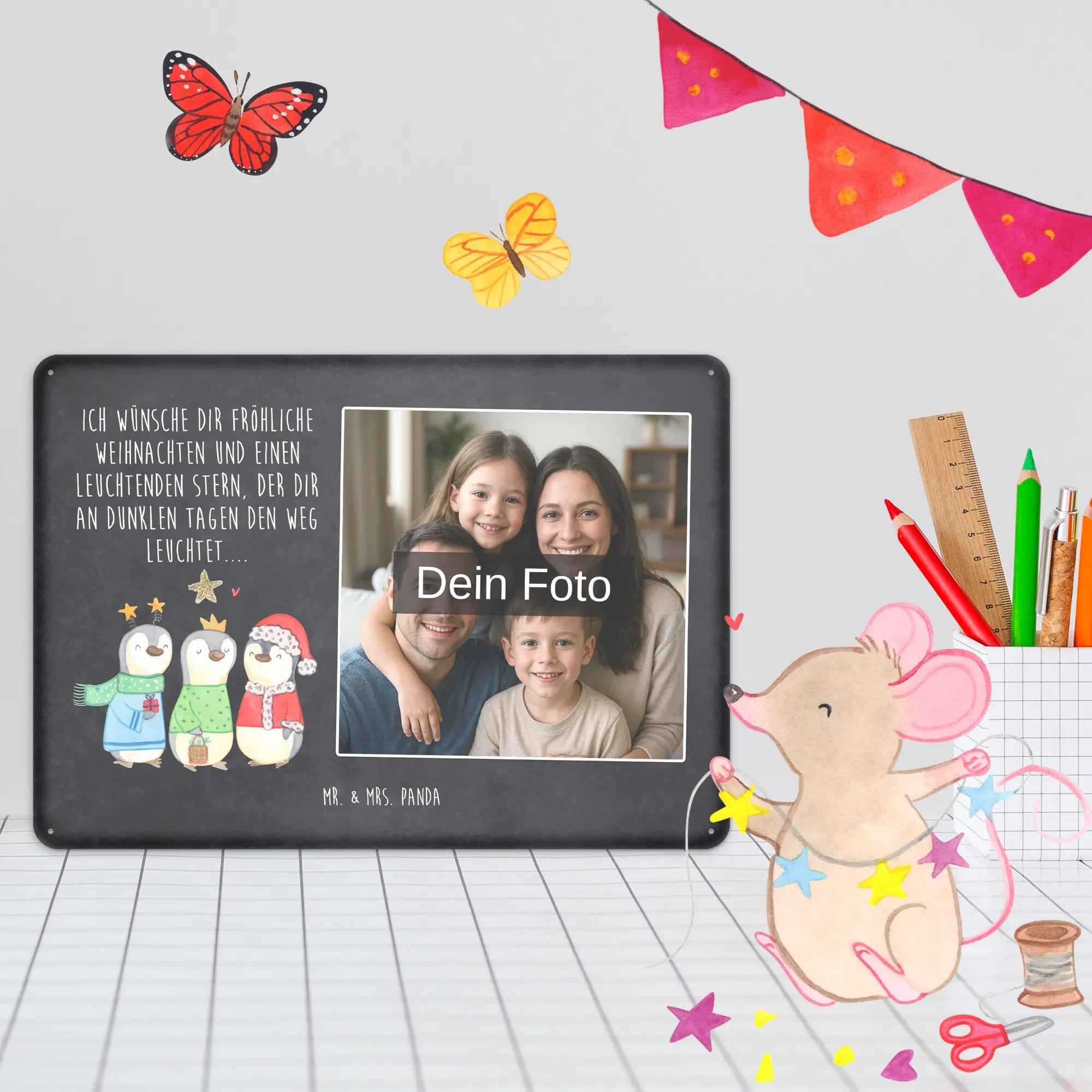 Blechschild mit eigenem Foto personalisiert – liebevoll gestaltet von Mr. & Mrs. Panda. Dieses edle Schild wird mit deinem Foto und unseren niedlichen Illustrationen bedruckt, sodass ein individuelles Dekostück entsteht. Achte unbedingt auf gute Bildqualität und geeigneten Bildausschnitt, damit das Motiv klar und harmonisch wirkt. Bitte nur eigene Bilder oder solche mit Nutzungsrecht hochladen. Gefertigt aus hochwertigem Stahlblech ohne Wölbung mit seidenmatter Oberfläche, bietet das Schild eine edle Optik. Maße: 70 mm x 297 mm x 210 mm. Der Druck ist langlebig und hochwertig verarbeitet. Für sicheren Halt gibt es vier Bohrungen, umgefalzte Kanten und abgerundete Ecken. Ideal für Innenräume, ob an der Tür, im Eingangsbereich oder an der Wohnzimmerwand. Pflegeleicht: einfach mit einem feuchten Tuch abwischen. In mehreren Größen erhältlich, so findest du garantiert die passende Variante. Verschenke Erinnerungen oder gestalte dein Zuhause persönlich — mit dem Blechschild mit eigenem Foto personalisiert von Mr. & Mrs. Panda wird jeder Raum ein Stückchen liebevoller.