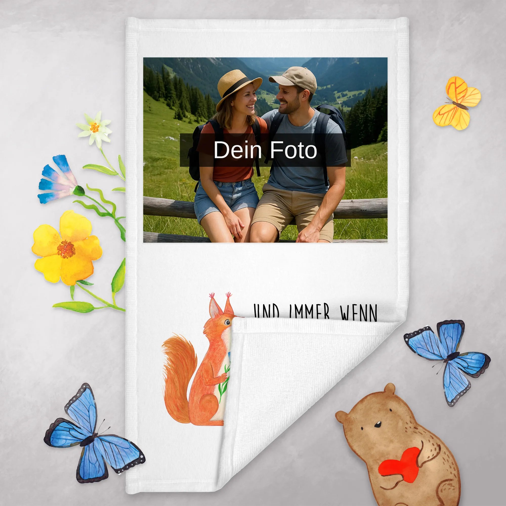 Personalisiertes Foto Gästehandtuch Eichhörnchen Blume