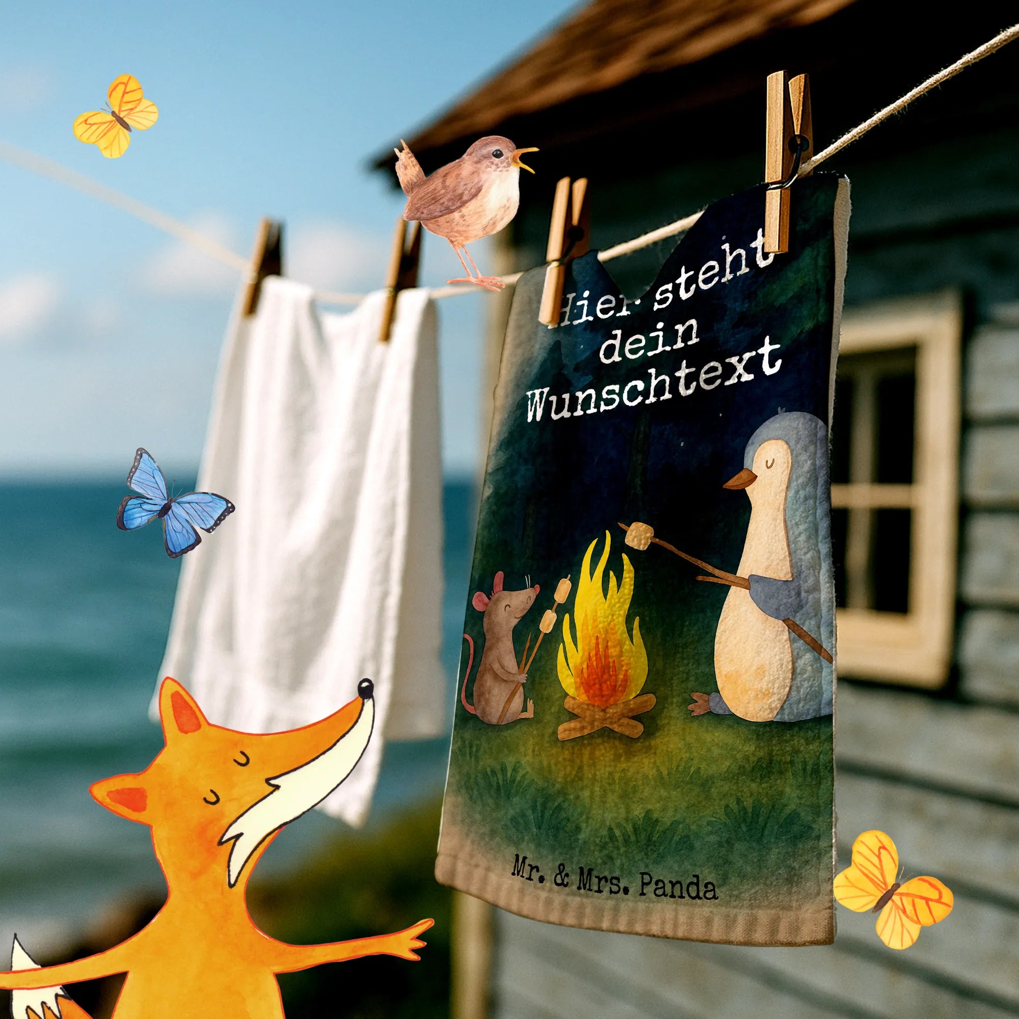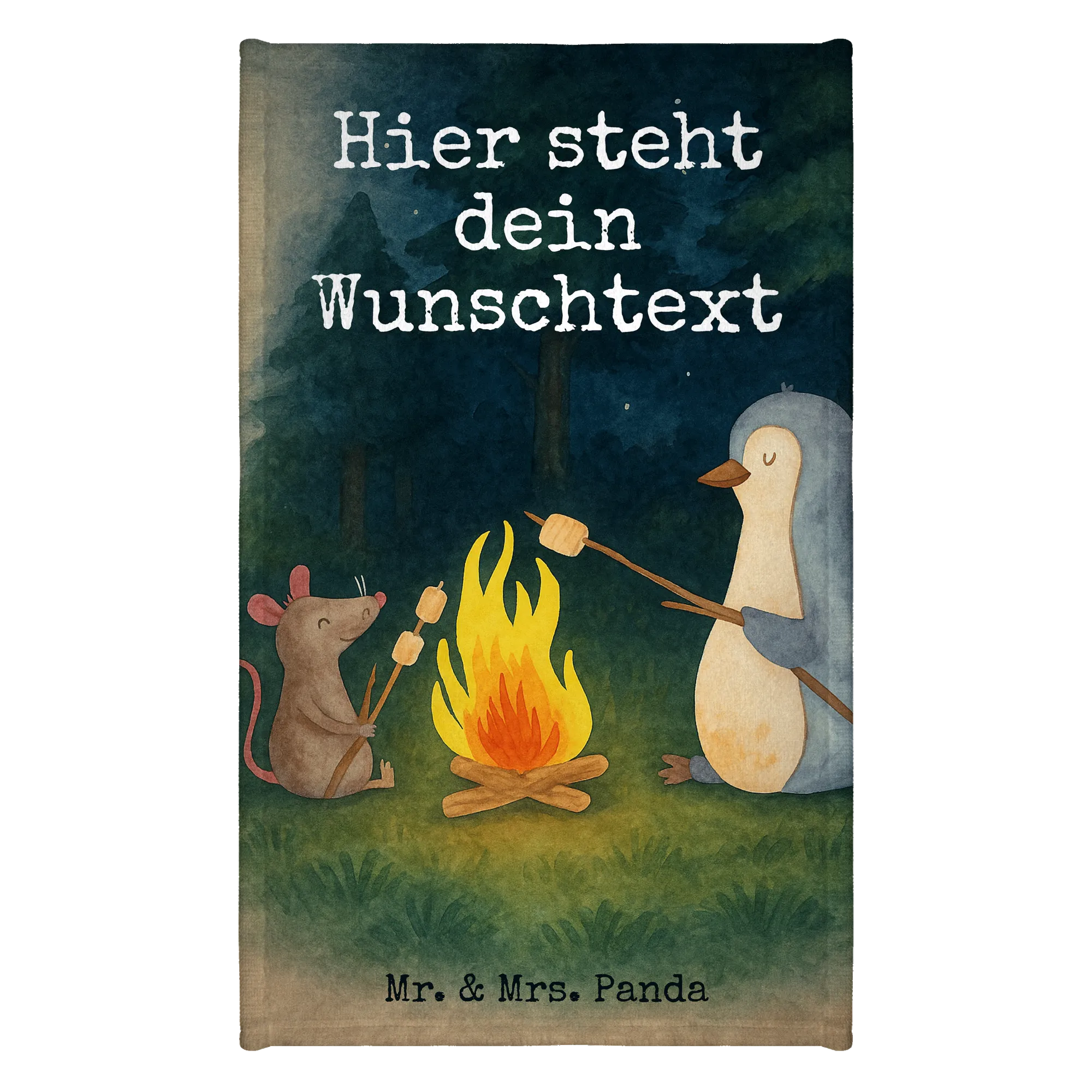 Personalisiertes Gästehandtuch Pinguin Lagerfeuer Design