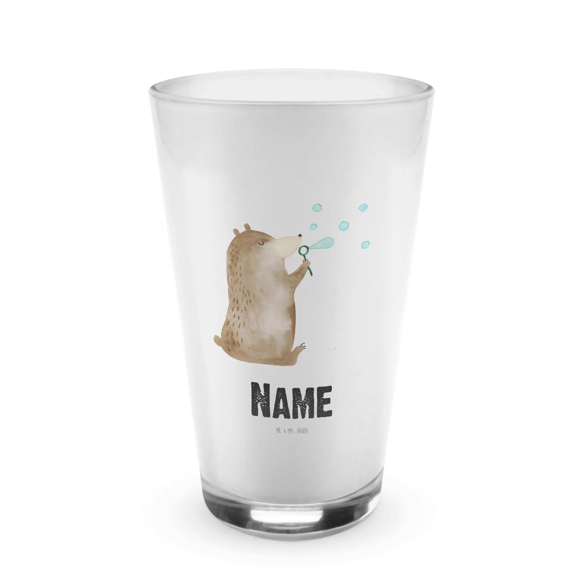 Das personalisierte Glas mit dem fröhlichen Bären und den Seifenblasen von Mr. & Mrs. Panda ist das perfekte Geschenk für große und kleine Bärenliebhaber! Es ist mehr als nur ein Glas; es ist ein liebevolles Statement, das Freude und Glück verbreitet.