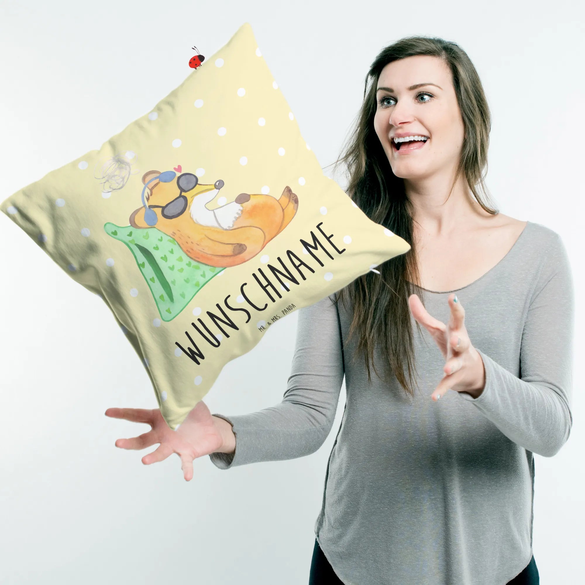 Unser wundervolles, personalisiertes Kissen von Mr. & Mrs. Panda ist der perfekte Begleiter für entspannte Abende und gemütliche Stunden. Mit einer Größe von 400 mm x 400 mm ist das Kissen nicht nur kuschelig, sondern auch praktischerweise mit einem Reißverschluss versehen, sodass die superweiche Füllung entnommen und gewaschen werden kann. Das Kissen wird liebevoll mit einzigartigen Motiven und Sprüchen bedruckt, die dein Zuhause verschönern. Ob als Sofakissen oder Dekokissen, es ist ein echter Blickfang. Du kannst dein Kissen ganz einfach mit deinem Wunschnamen oder einem persönlichen Wunschtext individuell gestalten. Damit bleibt das Kissen ein ganz persönliches Geschenk für dich oder deine Liebsten. Wasche dein Kissen bei 30° C, um die strahlenden Farben zu erhalten und den Komfort zu verlängern. Der Bezug besteht aus superflauschiger Mikrofaser, die für ein angenehmes Hautgefühl sorgt.