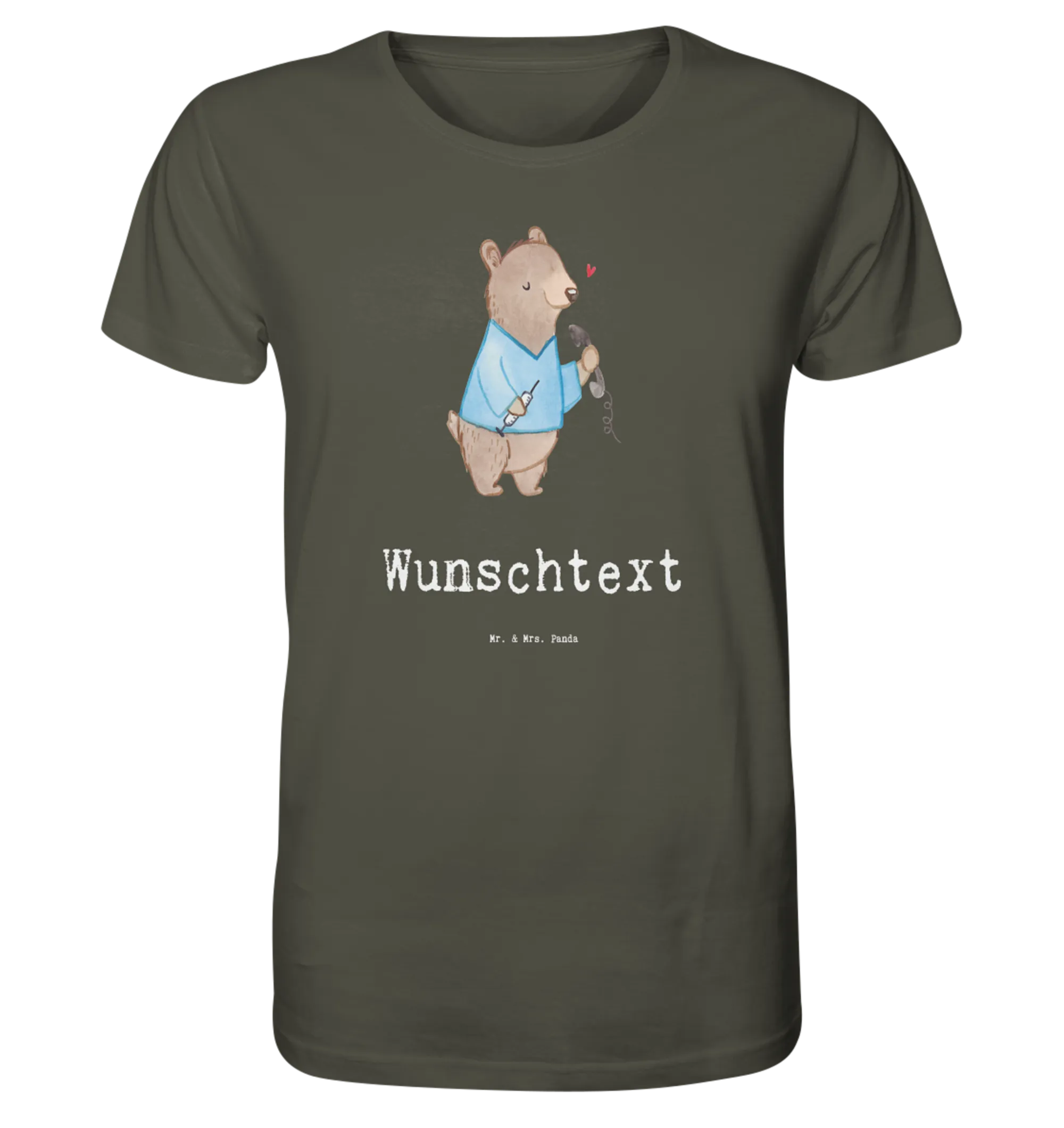 Das personalisierte Shirt Herren "Arzthelfer mit Herz" ist das ideale Geschenk für jeden, der im medizinischen Bereich arbeitet oder einen lieben Arzthelfer in seinem Leben hat. Mit einem süßen Bärchen im blauen Kittel, das in einer Hand eine Spritze und in der anderen ein Telefon hält, spricht dieses T-Shirt alle an, die das Herz am rechten Fleck haben.