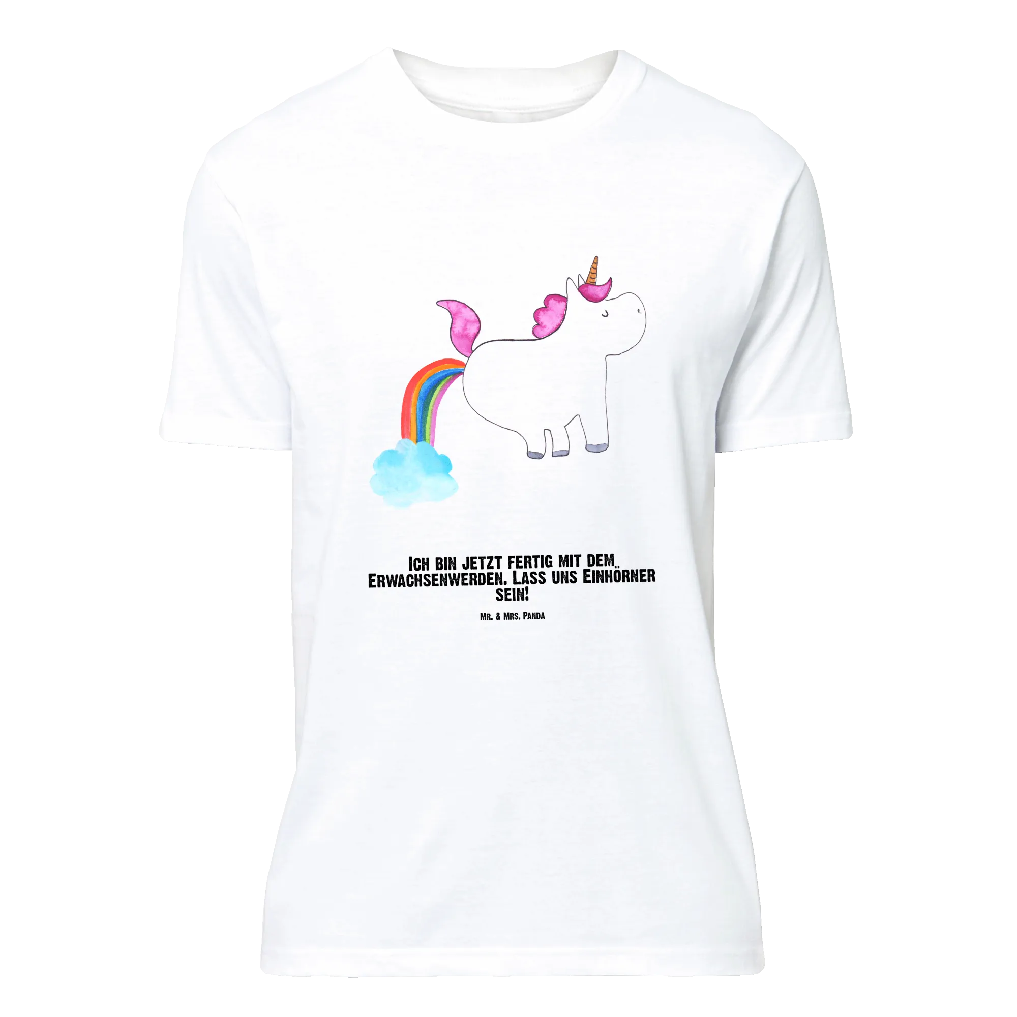 Suchst du ein Geschenk mit Humor und Herz? Dann ist das Größe L Personalisiertes T-Shirt „Einhorn Pupsend“ aus der Einhorn - Kollektion von Mr. & Mrs. Panda genau das Richtige für dich. Ein niedliches, glitzerndes Einhorn springt über einen Regenbogen und hinterlässt einen kleinen, frechen Pups – kombiniert mit dem Spruch „Ich bin jetzt fertig mit dem Erwachsenwerden. Lass uns Einhörner sein!”