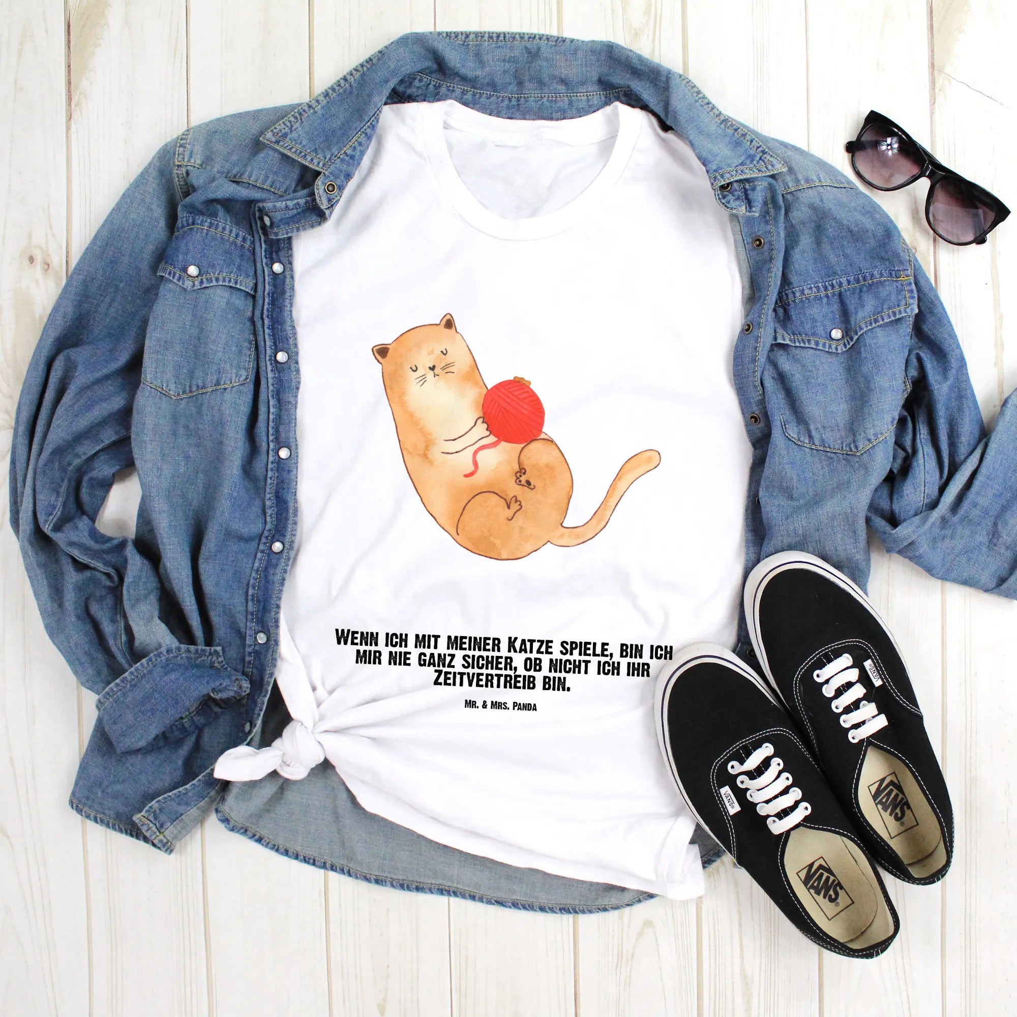 Unsere Katzen-Kollektion umfasst liebevoll gestaltete Produkte für Katzenliebhaber jeder Art. Jedes Motiv wird mit viel Leidenschaft und Hingabe von Mrs. Panda designet und bringt den unverwechselbaren Charakter unserer liebsten Haustiere zum Vorschein. Wenn du also ein echter Katzenfreund bist oder jemanden kennst, der es ist, dann ist dieses T-Shirt die perfekte Wahl! Es verbindet Stil mit einer Prise Humor, denn der Slogan „Wenn ich mit meiner Katze spiele, bin ich mir nie ganz sicher, ob nicht ich ihr Zeitvertreib bin“ bringt die Beziehung zwischen Mensch und Katze auf den Punkt.