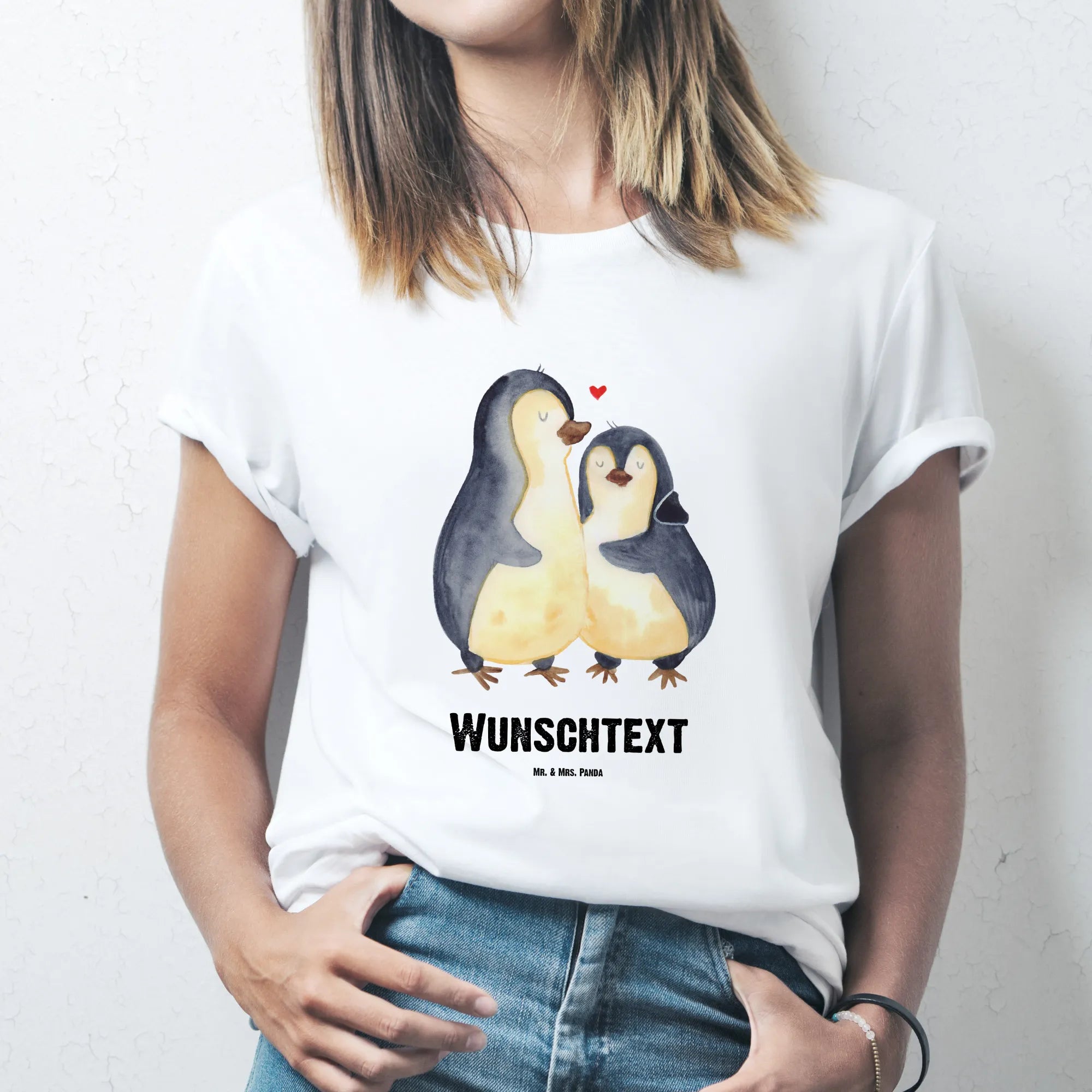 Das T-Shirt kommt in einem strahlenden Weiß, das den Pinguin und den liebevollen Spruch perfekt zur Geltung bringt. Durch die Individualisierung wird es zu einem Unikat, das mit Herz und Liebe gestaltet wurde. Egal ob als Geschenk oder für dich selbst – dieses Pinguin-T-Shirt wird zum absoluten Lieblingsstück in deinem Kleiderschrank! Es ist nicht nur ein Kleidungsstück, sondern ein wunderschönes Symbol für die besonderen Momente im Leben, die du mit deinen Liebsten teilen möchtest.