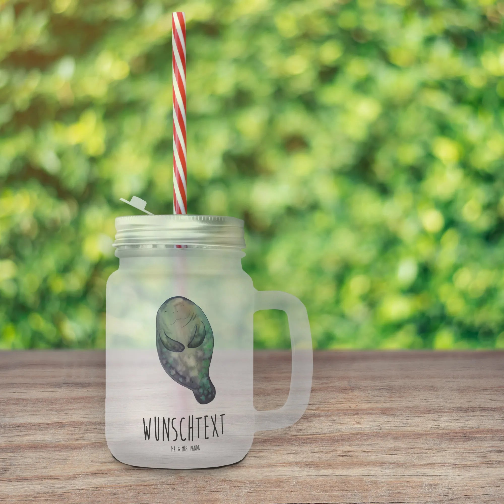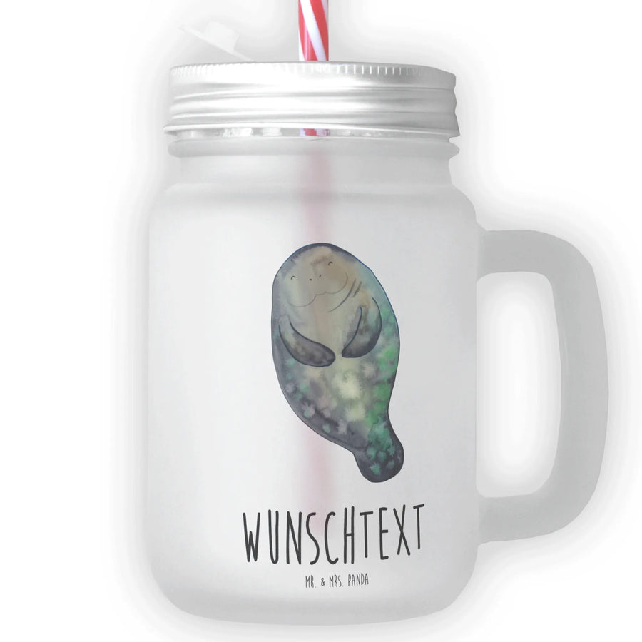 Das personalisierte Trinkglas Mason Jar mit dem süßen Motiv Seekuh happy aus der Meerestiere Kollektion von Mr. & Mrs. Panda ist das perfekte Geschenk für alle, die das Leben am Meer lieben. Ob zum Geburtstag, zum Einzug oder einfach mal so – dieses Glas bereitet jedem eine Freude!