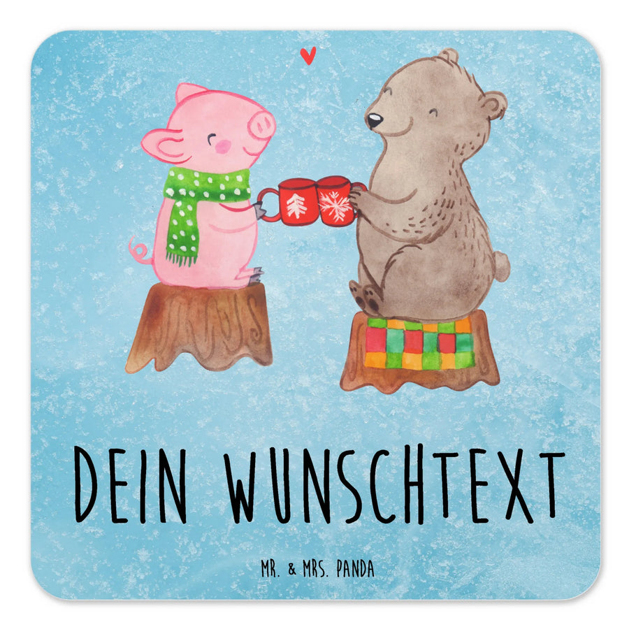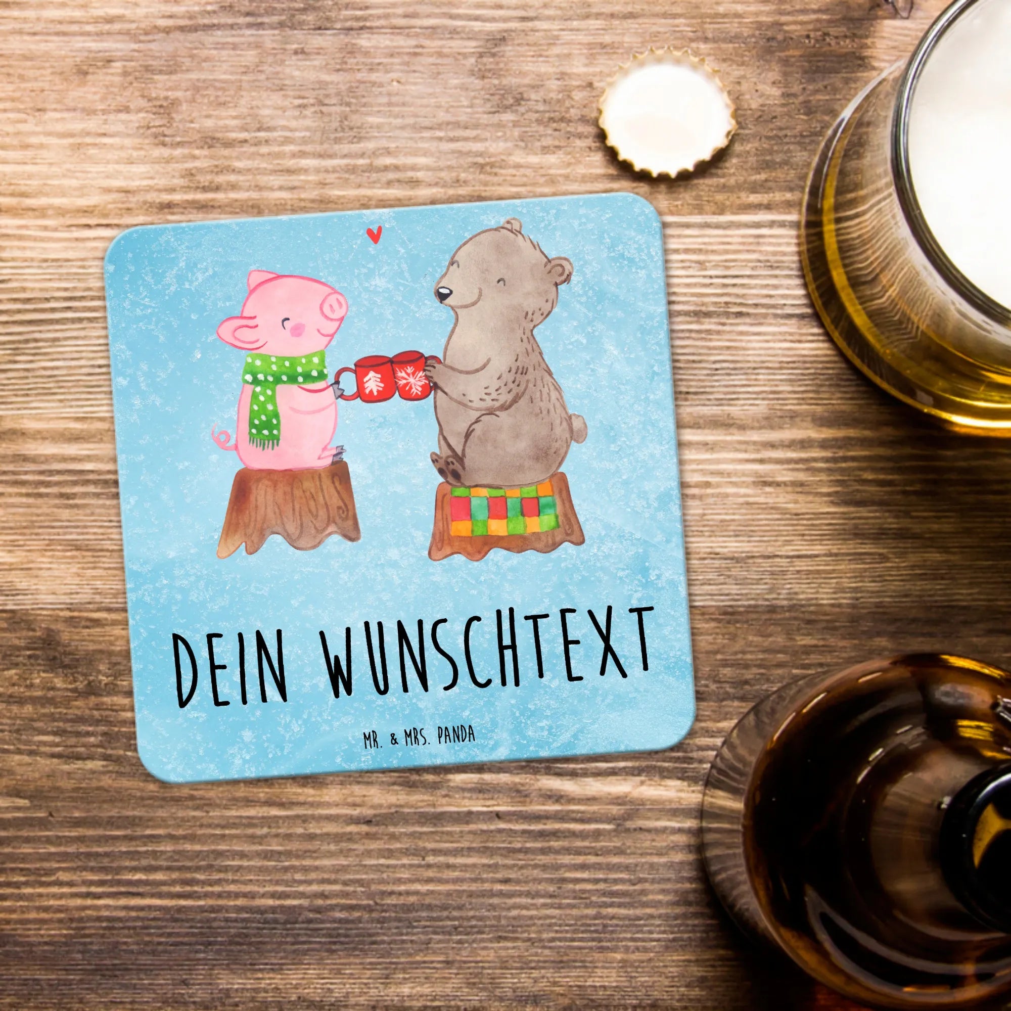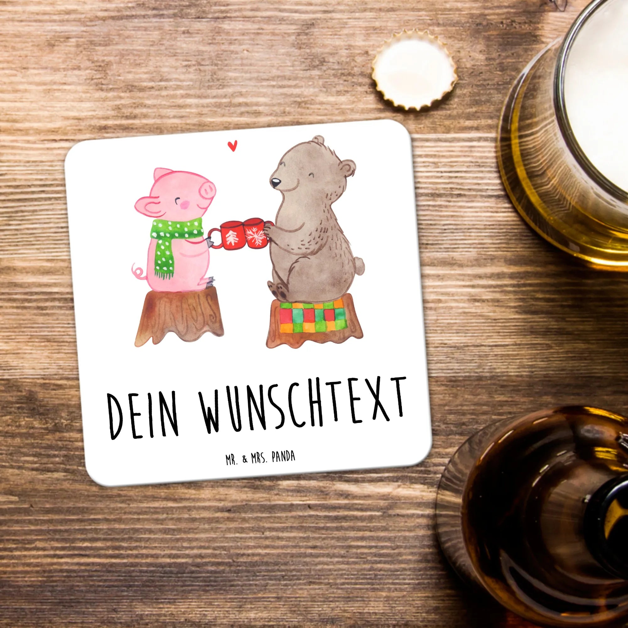 Willst du die Weihnachtszeit auf eine ganz besondere Art feiern? Dann sind die personalisierten Untersetzer mit dem Motiv "Glühschwein Sause" aus der Mr. & Mrs. Panda Winter Kollektion genau das Richtige für dich! Diese wunderschönen Untersetzer sind nicht nur praktisch, sie bringen auch eine Portion Liebe und Freude in dein Zuhause. Das niedliche Design zeigt einen Bären und ein Schweinchen, die auf einem Baumstumpf mit einem kleinen Herzchen vereint sind. Sie stoßen an und wünschen sich "Alles Gute" - eine herzliche Botschaft, die die besinnliche Zeit im Jahr perfekt einfängt.
