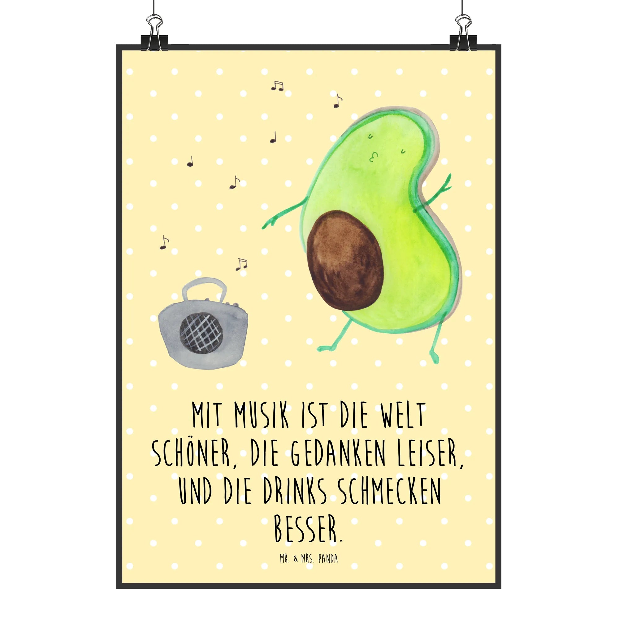 Dieses liebevoll gestaltete Kunstdruck Poster zeigt eine fröhliche Avocado, die vor einem Ghettoblaster munter zur Musik tanzt. Das Motiv aus der Avocado Kollektion von Mr. & Mrs. Panda vereint niedliche Illustration mit einem optimistischen Spruch: „Mit Musik ist die Welt schöner, die Gedanken leiser, und die Drinks schmecken besser.“