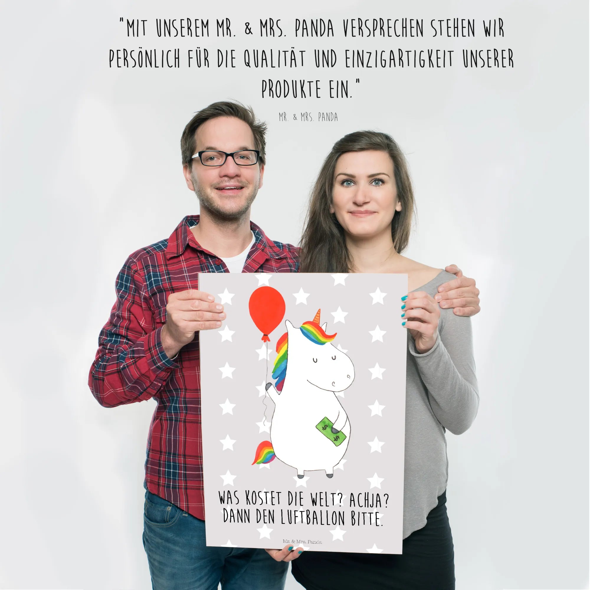 Das wunderschöne Poster 'Einhorn Luftballon' von Mr. & Mrs. Panda ist das perfekte Geschenk für alle, die die zauberhafte Welt der Einhörner lieben. Dieses handgezeichnete Kunstwerk zeigt ein niedliches Einhorn, das mit einem Luftballon in der einen Hand und Geldscheinen in der anderen Hand strahlt. Mit dem Spruch 'Was kostet die Welt? Achja? Dann den Luftballon, bitte.' bringt es Lebensfreude und ein Lächeln in jeden Raum.