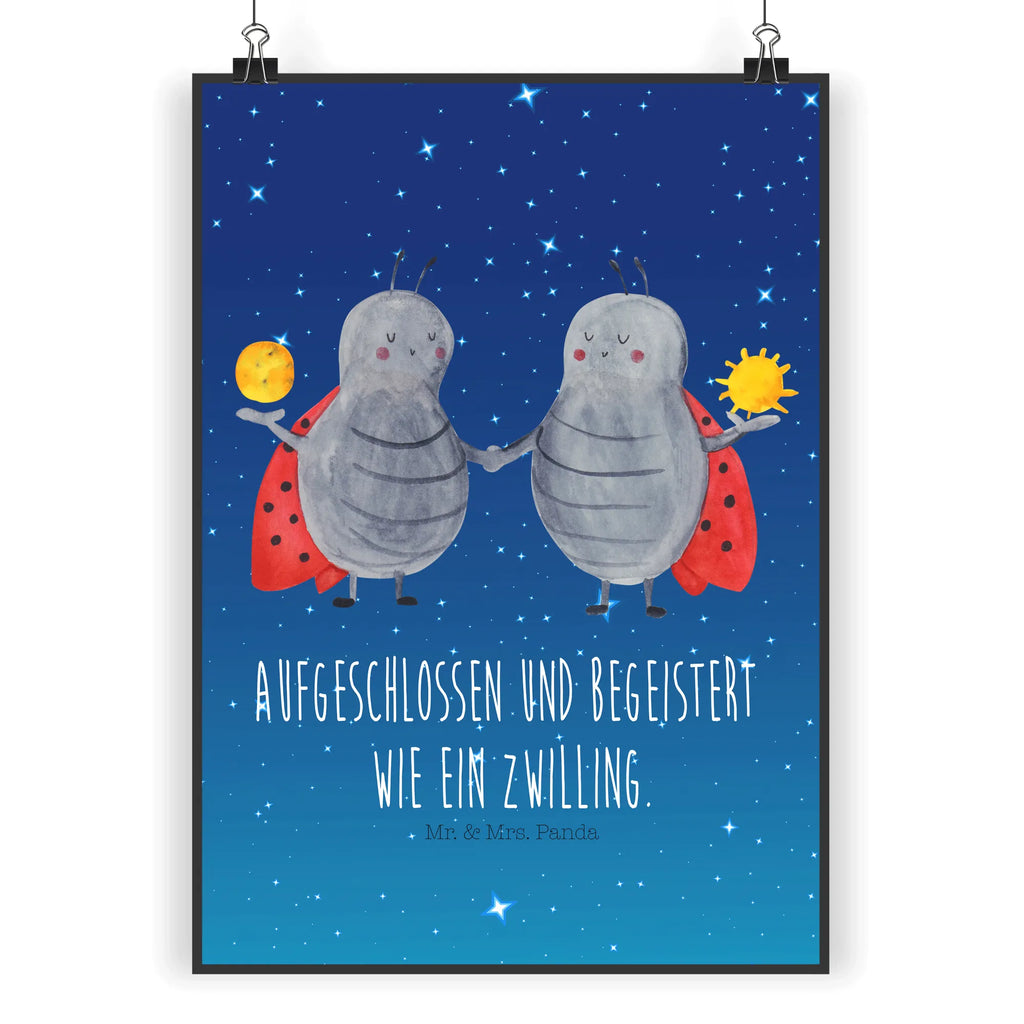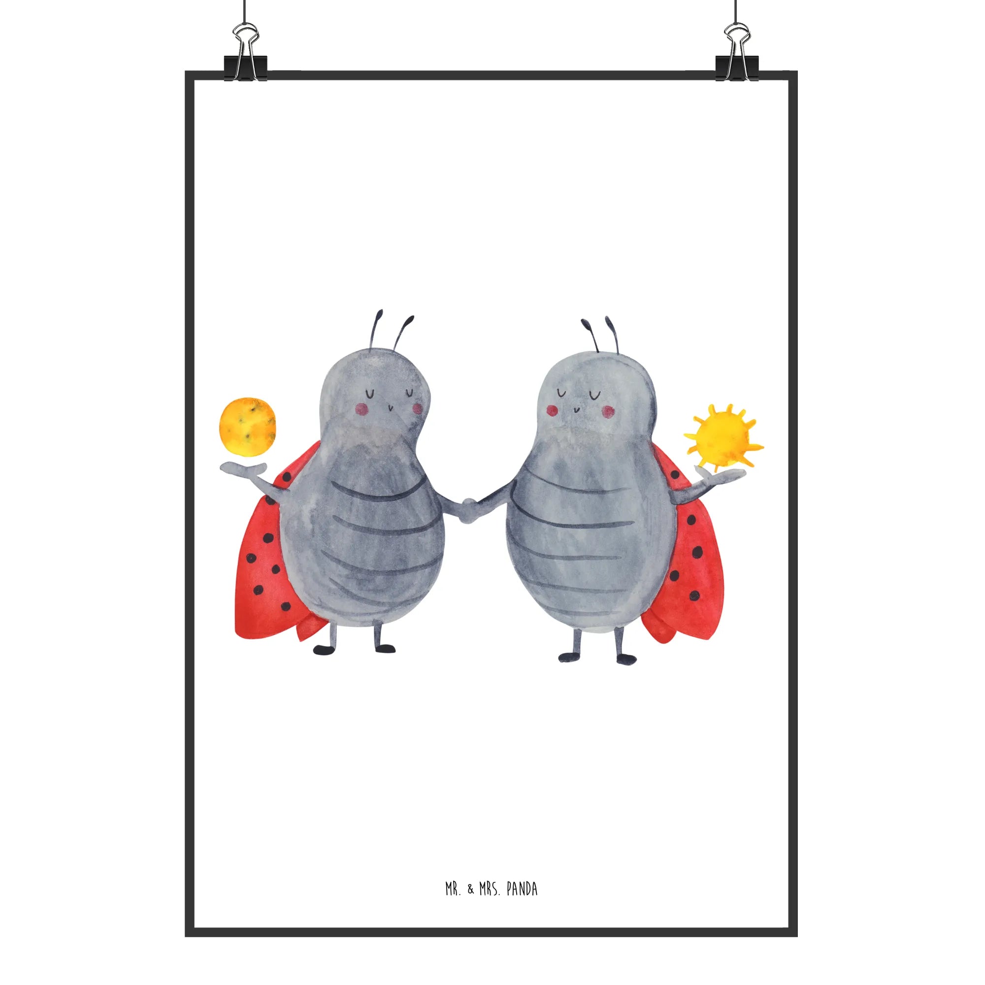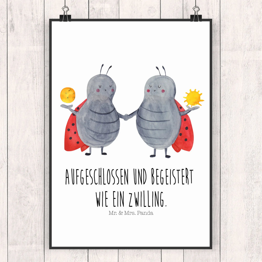 Entdecke das perfekte Geschenk für echte Zwillinge oder diejenigen, die das Glücksgefühl eines Zwillings in sich tragen! Unser handgezeichnetes Poster zum Sternzeichen Zwilling von Mr. & Mrs. Panda begeistert mit einem charmanten Design und fröhlichen Farben. Egal, ob zum Geburtstag im Mai oder Juni, als Geburtstagsgeschenk für Zwillingsbrüder und Zwillingsschwestern oder als süße Wanddeko für das Kinderzimmer – dieses Poster ist ein echter Hingucker! Es zeigt zwei niedliche Marienkäfer, die die Dynamik und Lebensfreude der Zwillinge perfekt verkörpern.