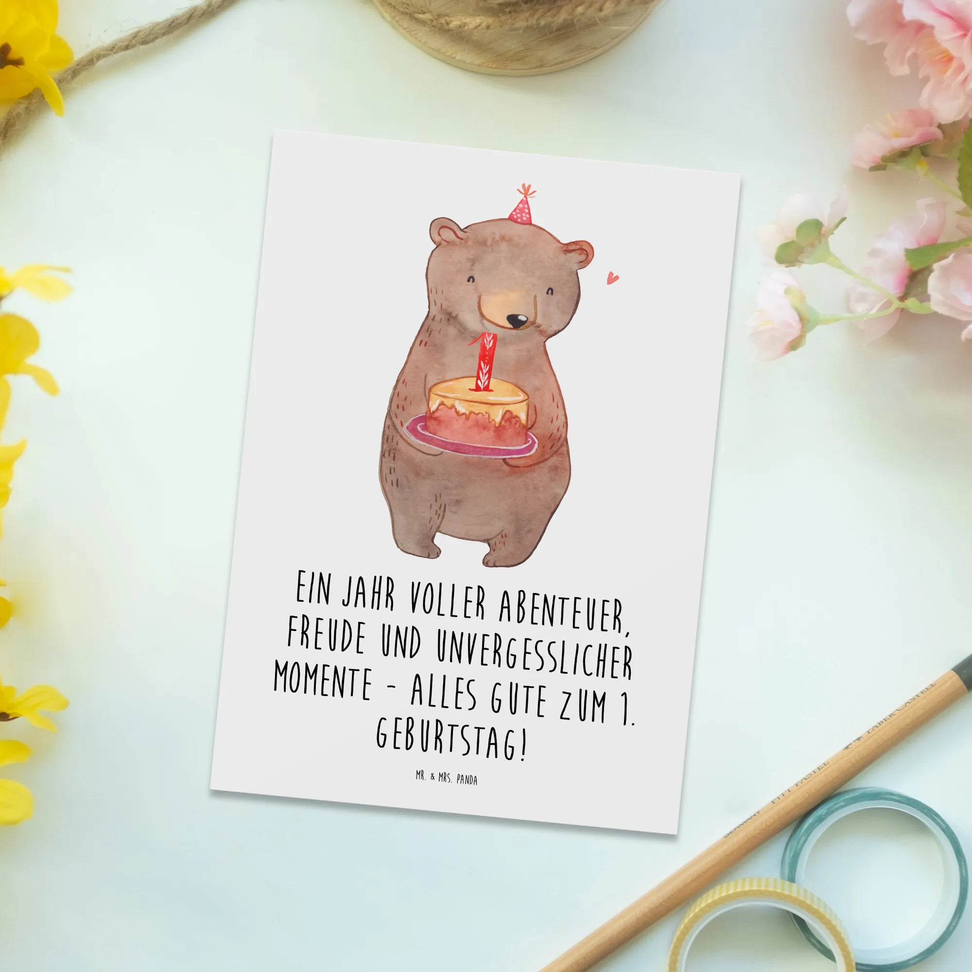 Die einzigartige Postkarte von Mr. & Mrs. Panda zum 1. Geburtstag ist das perfekte Geschenk für alle, die diesen besonderen Tag feiern möchten! Mit dem fröhlichen Motto "Ein Jahr voller Abenteuer, Freude und unvergesslicher Momente - alles Gute zum 1. Geburtstag!" strahlt die Karte pure Lebensfreude aus und lässt Herzen höher schlagen.