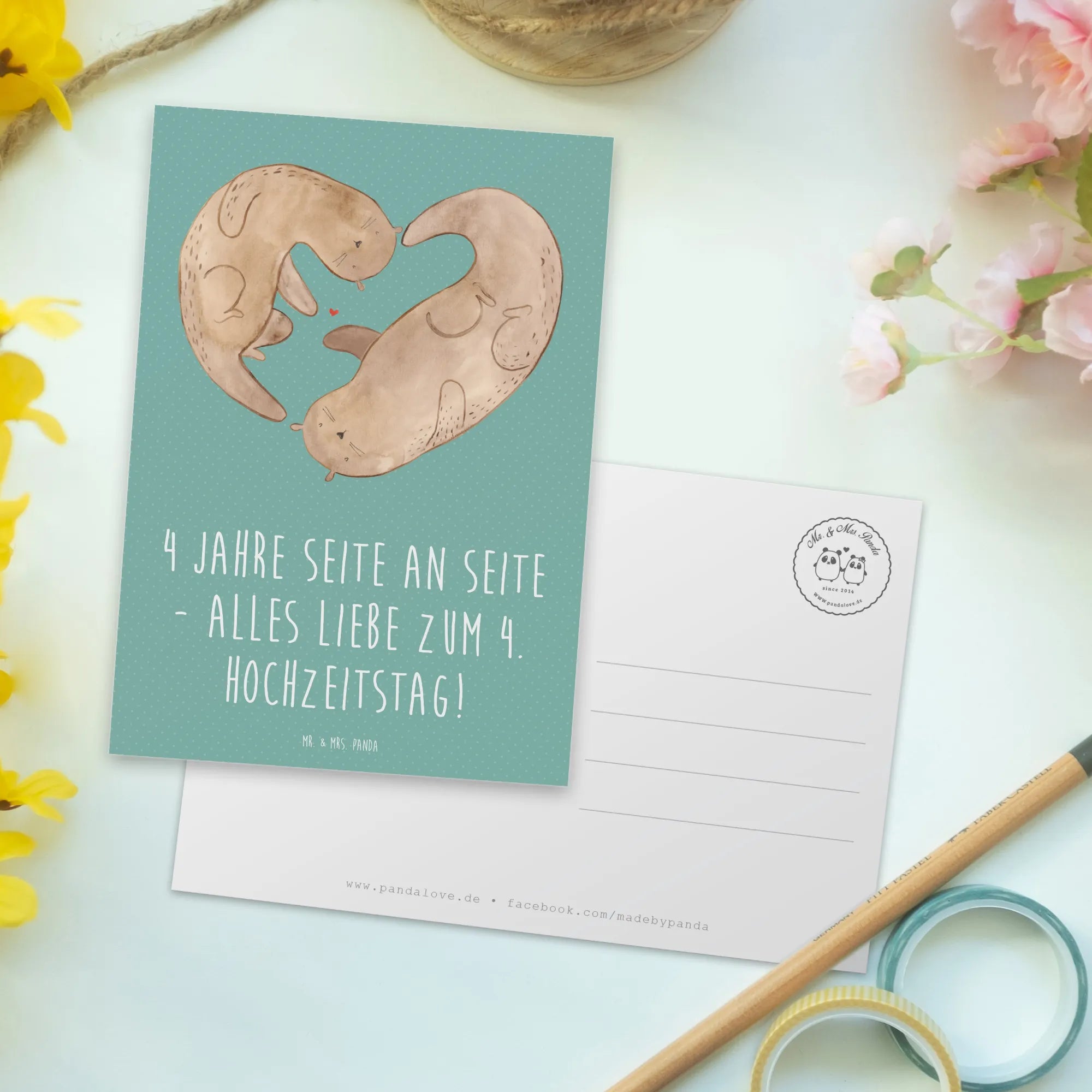 Die einzigartige Postkarte "4 Jahre Seite an Seite - alles Liebe zum 4. Hochzeitstag!" von Mr. & Mrs. Panda ist das perfekte Geschenk, um diesen besonderen Moment in der Liebe zu feiern. Sie ist ideal für Verliebte, die ihre 4. Hochzeitstagsfeier unvergesslich machen möchten oder für Freunde, die nach einem herzlichen Gruß suchen. Mit ihrem niedlichen, romantischen Design und dem liebevollen Spruch wird sie sicher jeden in ihren Bann ziehen. Die Karte hat eine hochglänzend veredelte Vorderseite, die ein echter Blickfang ist, und eine matte Rückseite, die sich perfekt zum Beschriften eignet.