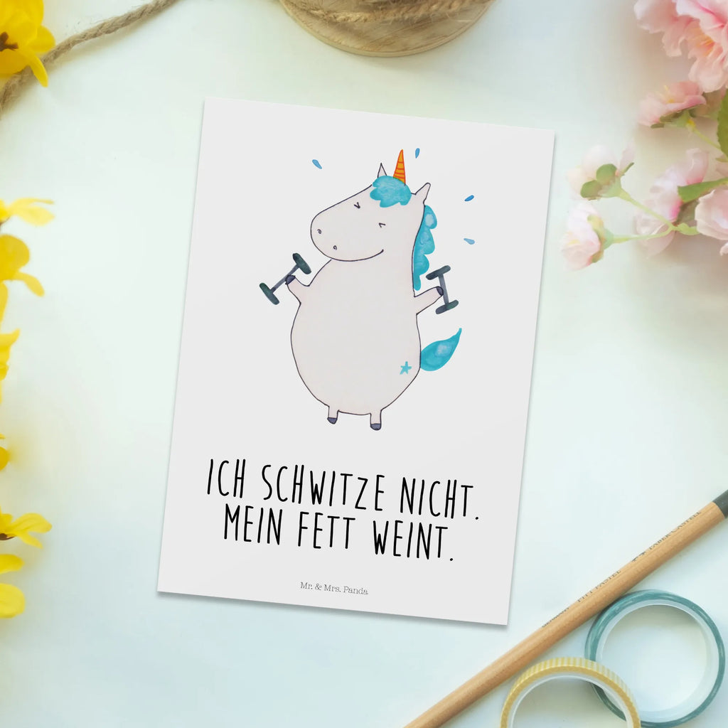 Postkarte Einhorn Fitness - mit Spruch - Weiß
