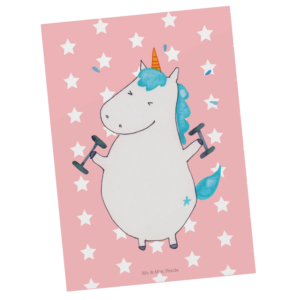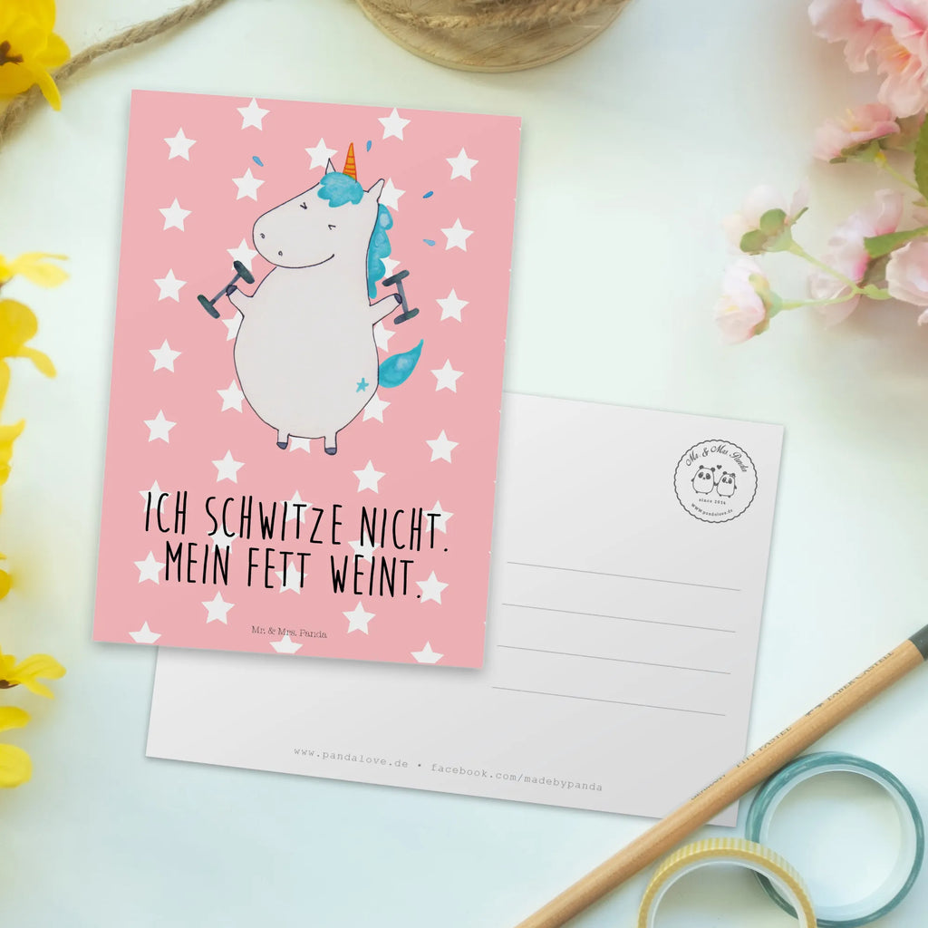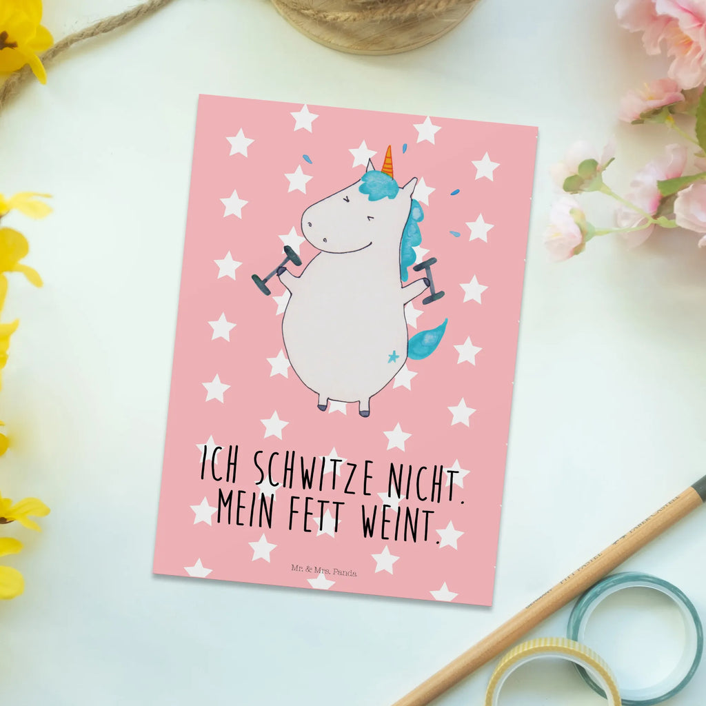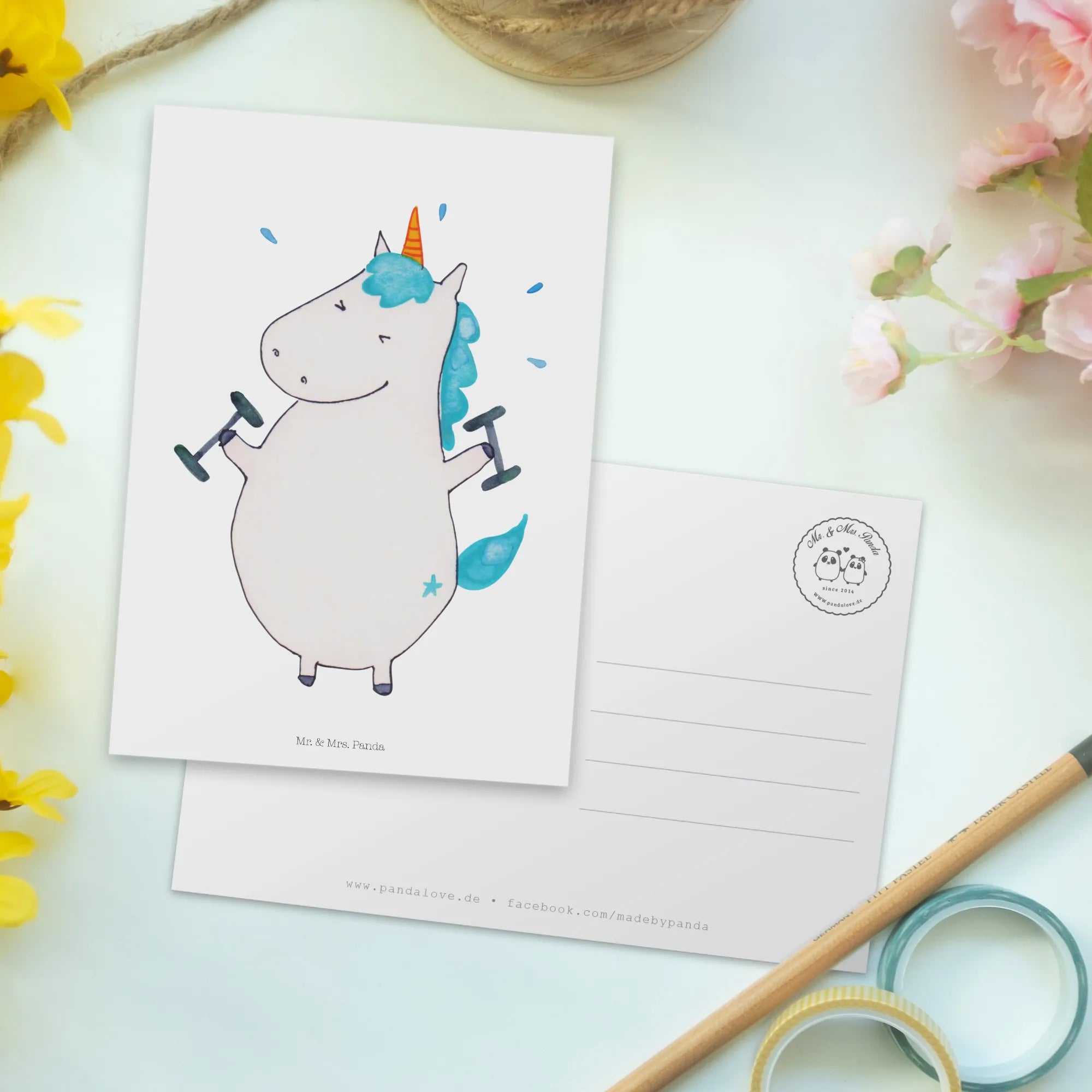 Die perfekte Postkarte für alle Fitness-Fans und Einhorn-Liebhaber! Diese einzigartige Postkarte von Mr. & Mrs. Panda zeigt ein süßes Einhorn, das mit zwei Hanteln trainiert und dabei spritzt. Ob du gerade ins Fitnessstudio gehst oder dich einfach nur aufraffen willst, unser Fitness-Einhorn ist die ideale Motivation!