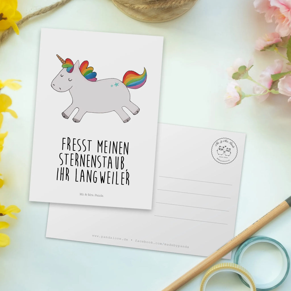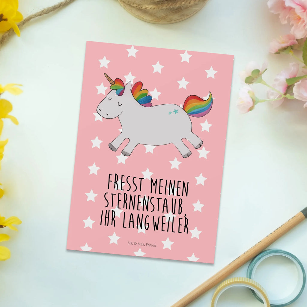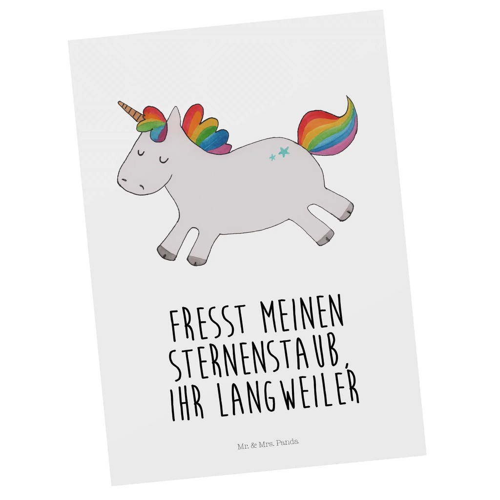 Mit einem maßgeschneiderten Slogan wie "Fresst meinen Sternenstaub, ihr Langweiler" zieht die Karte die Aufmerksamkeit auf sich und ist eine spaßige Möglichkeit, um Grüße, Einladungen oder auch einfach nur kleine Nachrichten zu überbringen. Egal, ob du sie an Freunde, Familie oder Kollegen versendest, jeder wird von der Fröhlichkeit und dem Charme des Einhorns verzaubert sein.