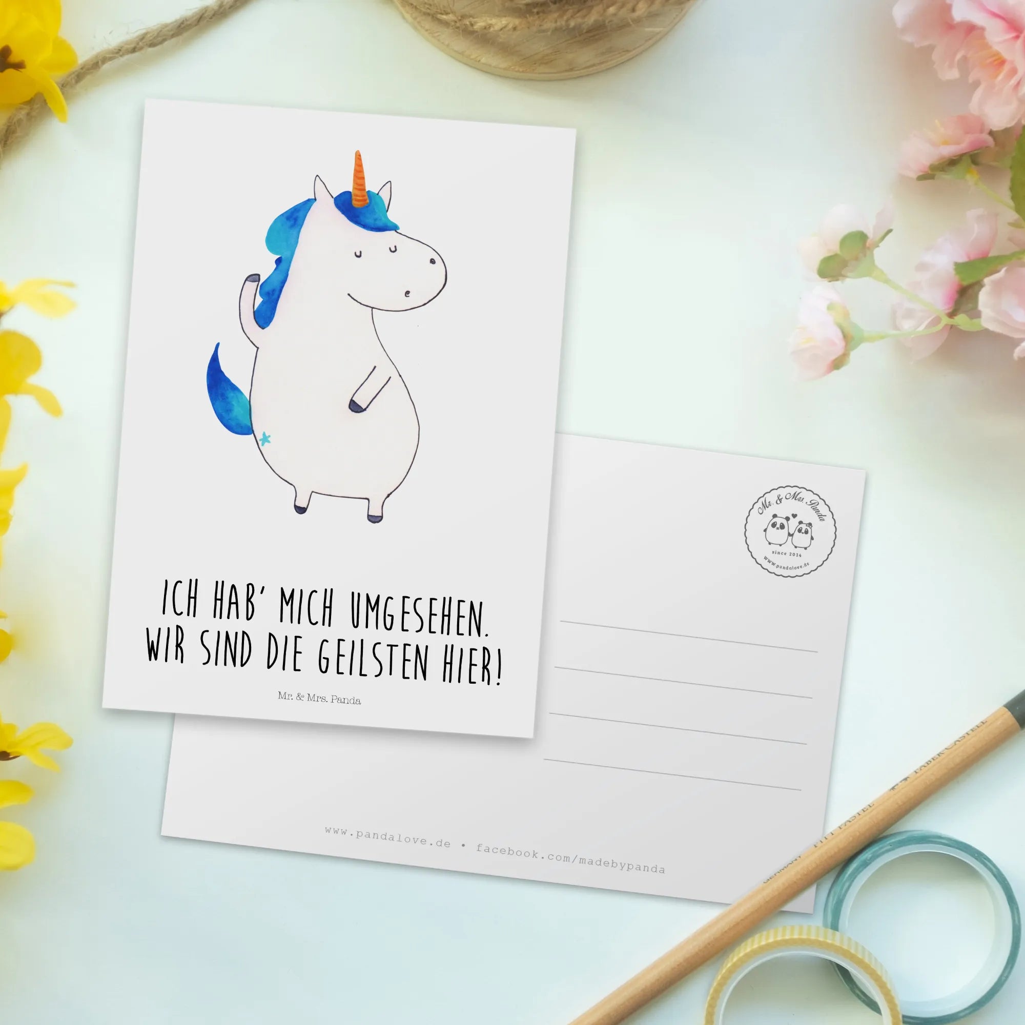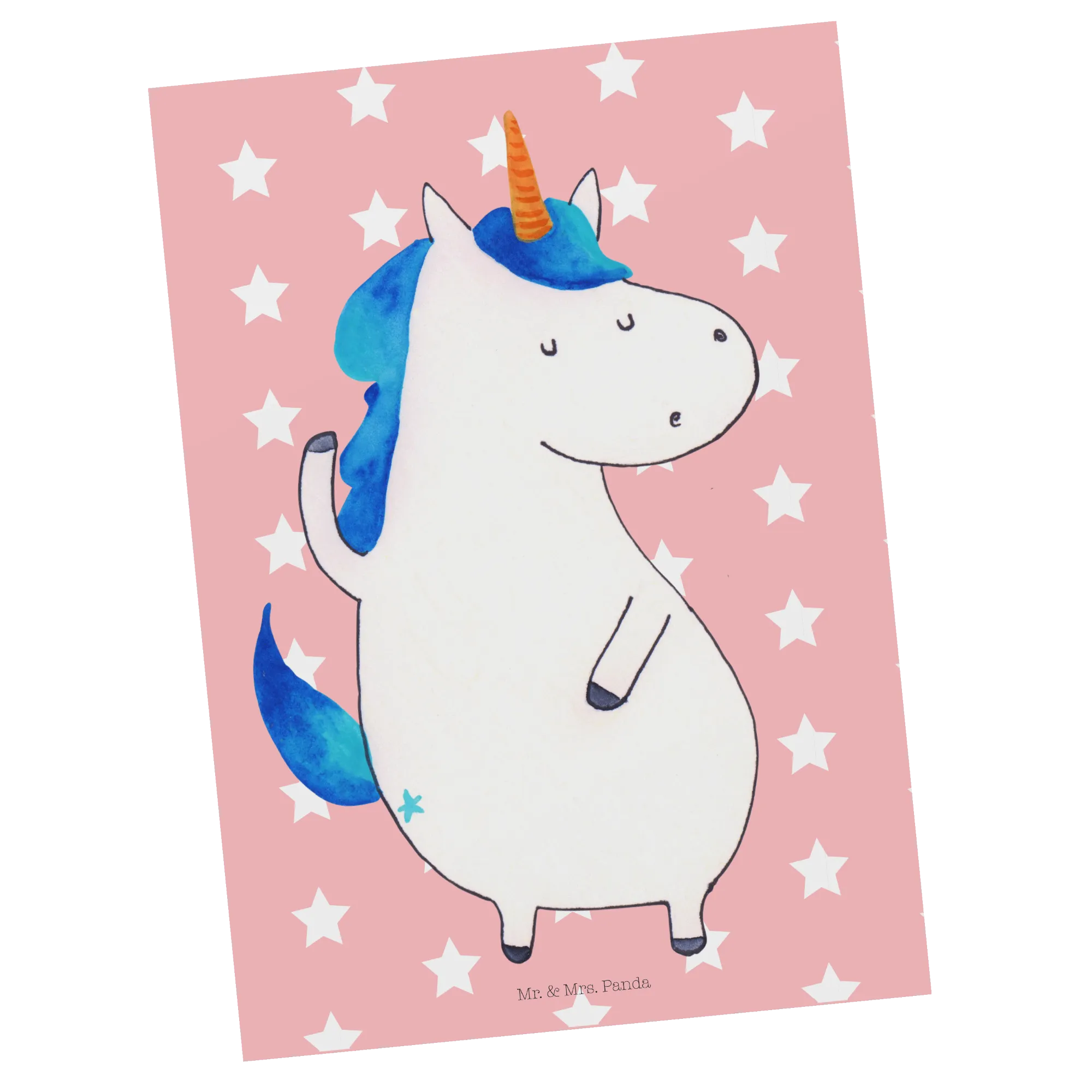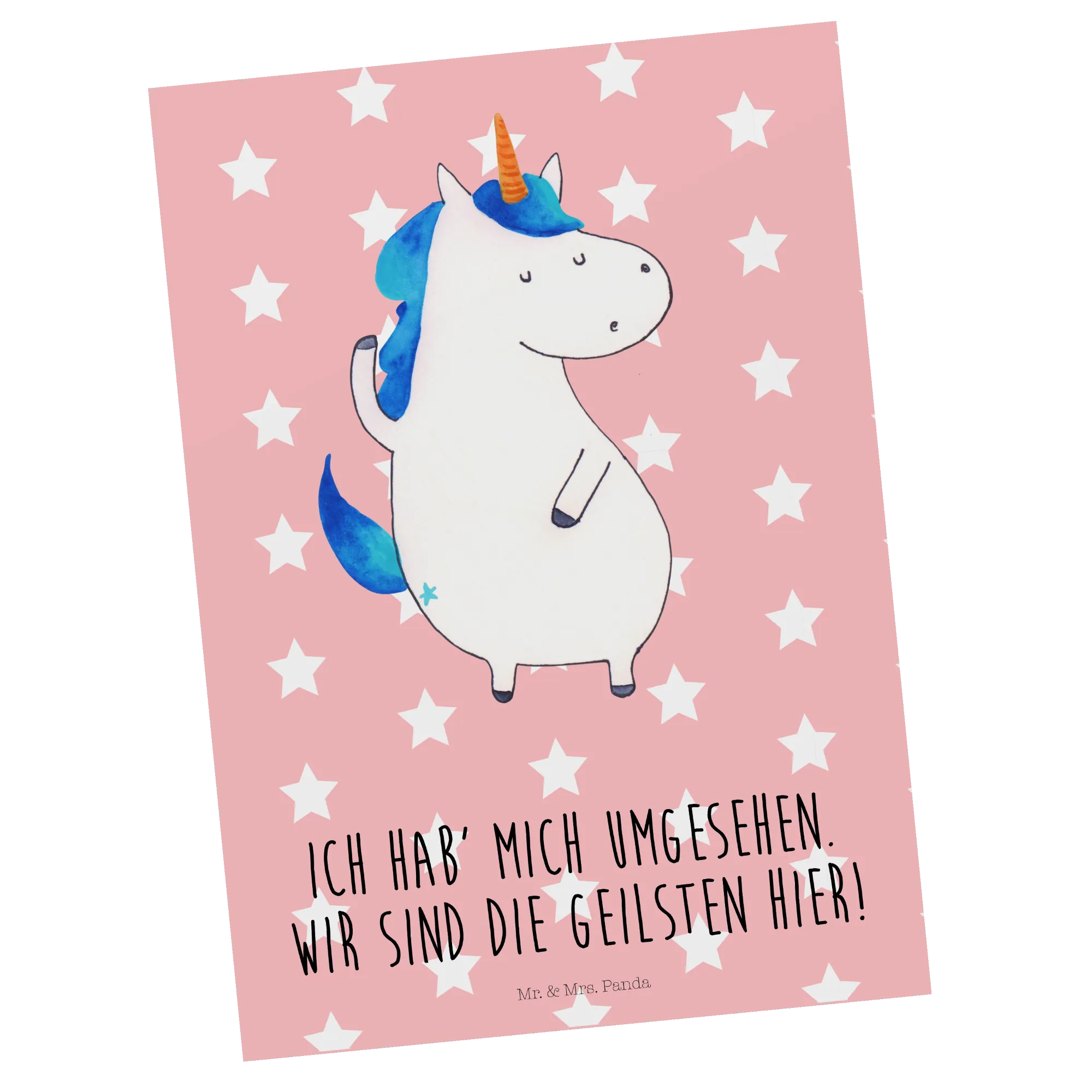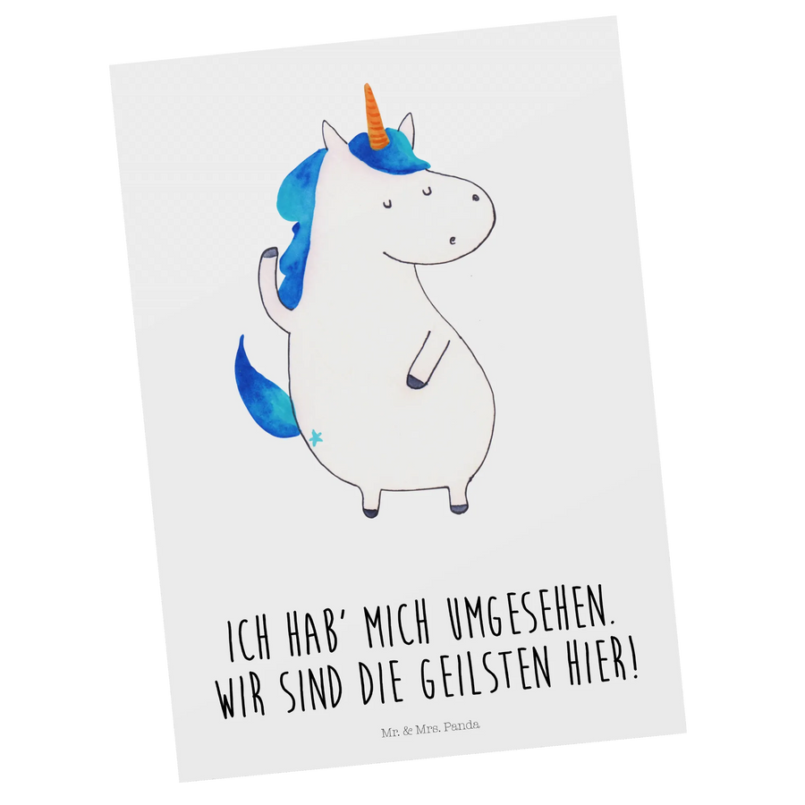 Entdecke die zauberhafte Postkarte "Einhorn Mann" aus unserer einzigartigen Einhorn-Kollektion von Mr. & Mrs. Panda! Diese wunderschöne Karte besticht durch das süße, selbstbewusste Einhorn, das stolz sein Horn zeigt.