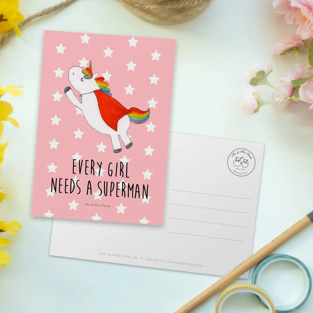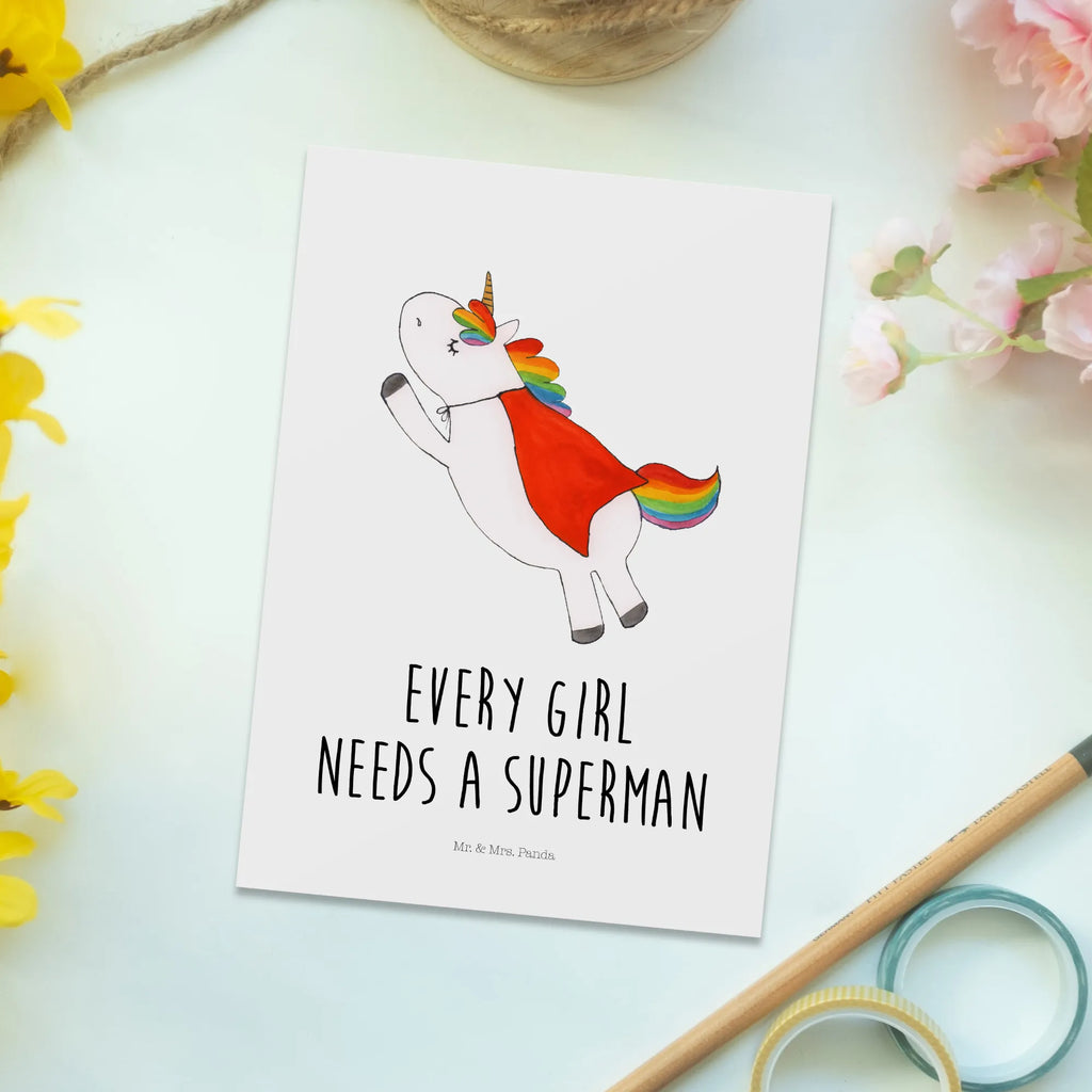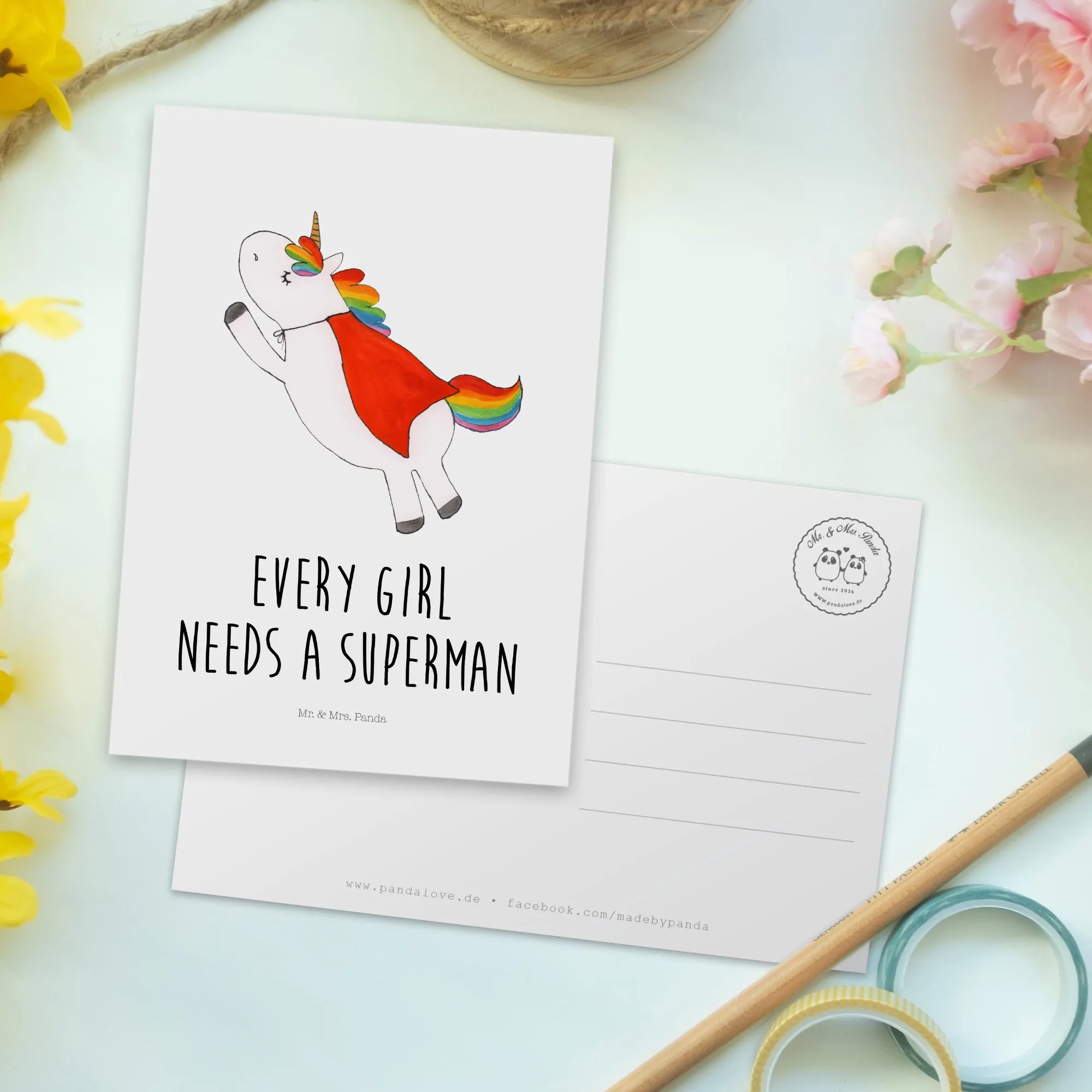 Die Postkarte Einhorn Super aus der Einhorn-Kollektion von Mr. & Mrs. Panda ist das perfekte Geschenk für alle Mädchen und Frauen, die an die Magie von Einhörnern glauben. Sie strahlt pure Lebensfreude aus und trägt den witzigen Spruch "Every girl needs a superhero". Ob zum Geburtstag, als Einladung oder einfach nur als liebevolle Geste – diese Karte wird mit Sicherheit ein Lächeln auf das Gesicht der Beschenkten zaubern.