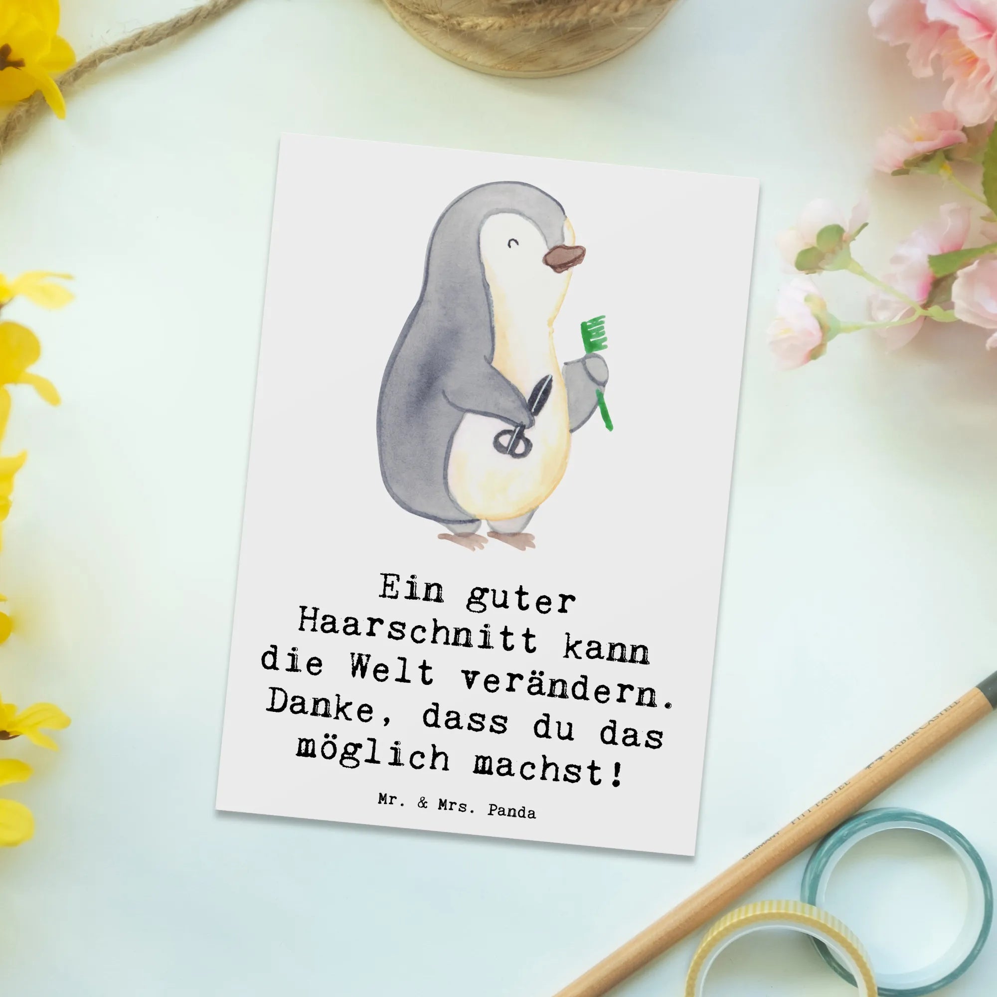 Diese einzigartige Postkarte ist nicht nur schön gestaltet, sondern enthält auch den inspirierenden Slogan: "Ein guter Haarschnitt kann die Welt verändern. Danke, dass du das möglich machst!"