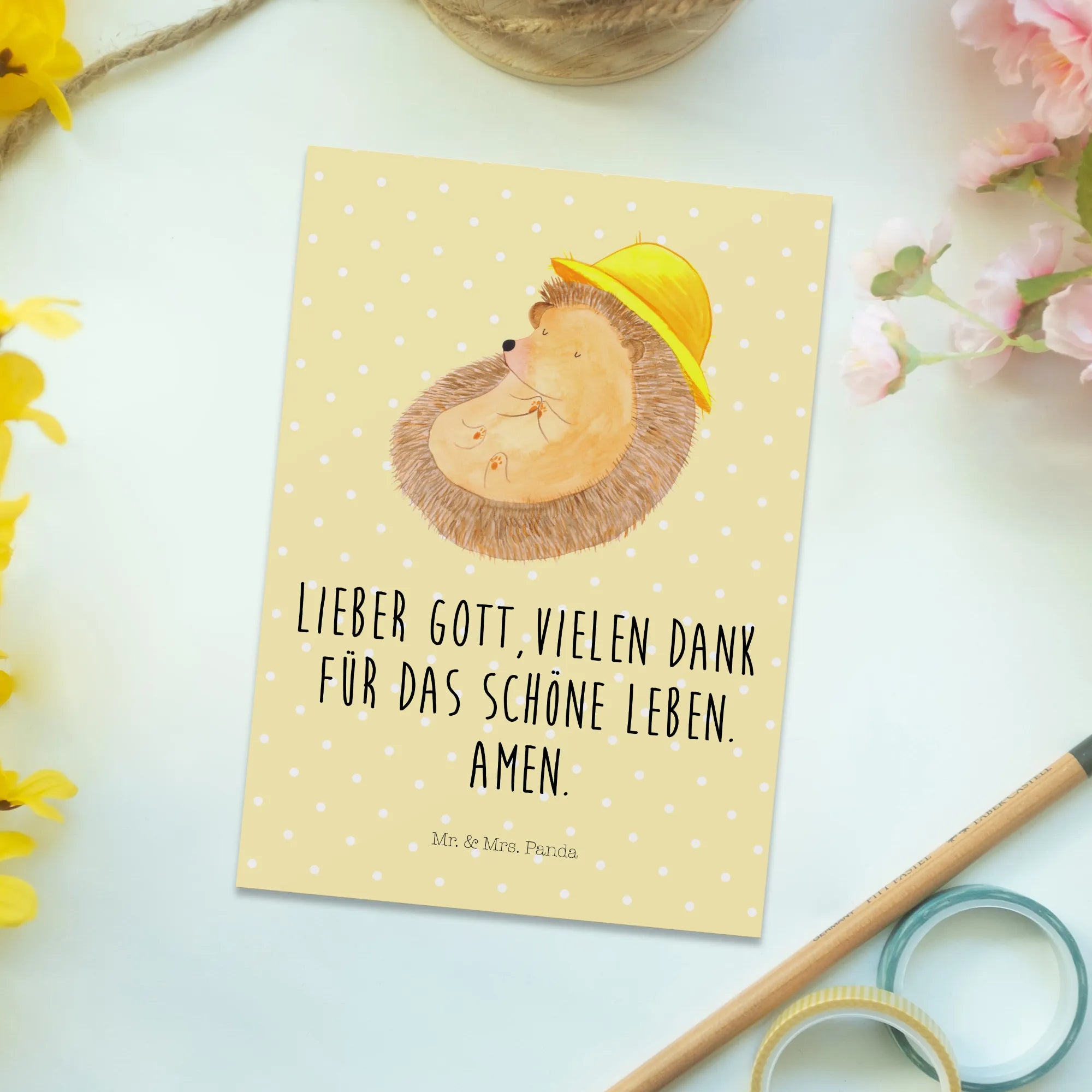 Postkarte Igel betet - mit Spruch - Gelb Pastell