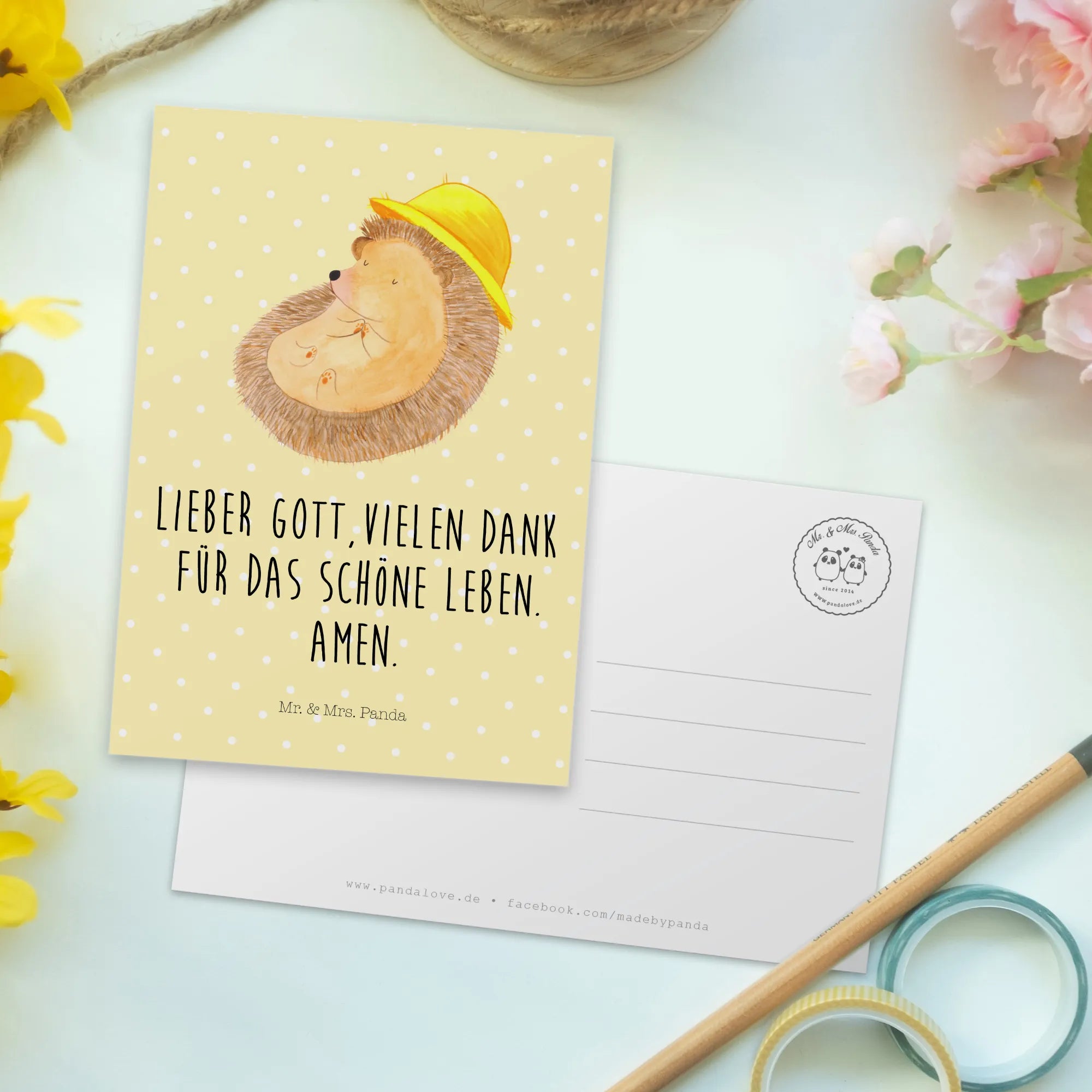 Entdecke die bezaubernde Postkarte "Igel betet" aus der beliebten Small World Kollektion von Mr. & Mrs. Panda. Mit einem liebevoll gezeichneten Igel, der seine kleinen Hände zum Gebet faltet, verzaubert diese Karte jeden Betrachter.