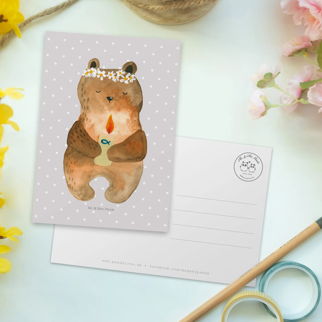 Die einzigartige Postkarte "Kommunion-Bär" von Mr. & Mrs. Panda ist das perfekte Geschenk zur Kommunion. Dieses süße Motiv zeigt einen niedlichen Bären mit einer Blumenkrone und einer Kerze in der Hand – ein Symbol für das Licht deiner Seele.