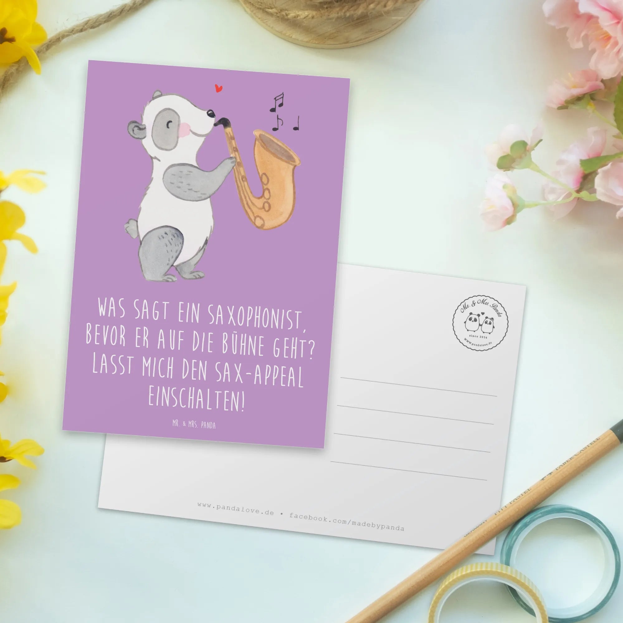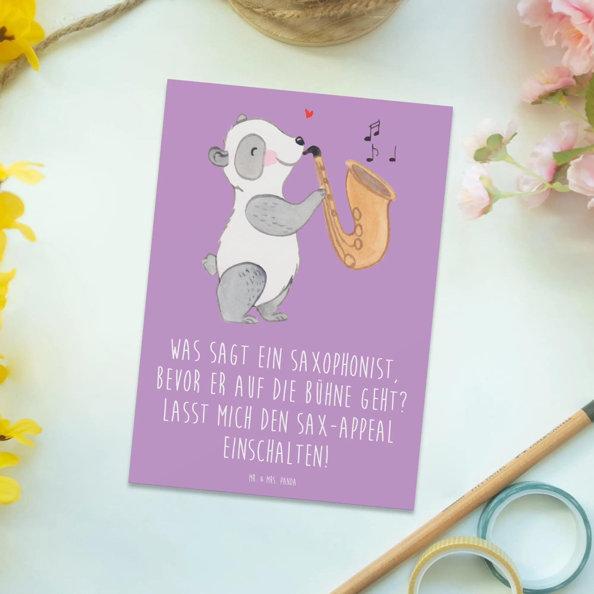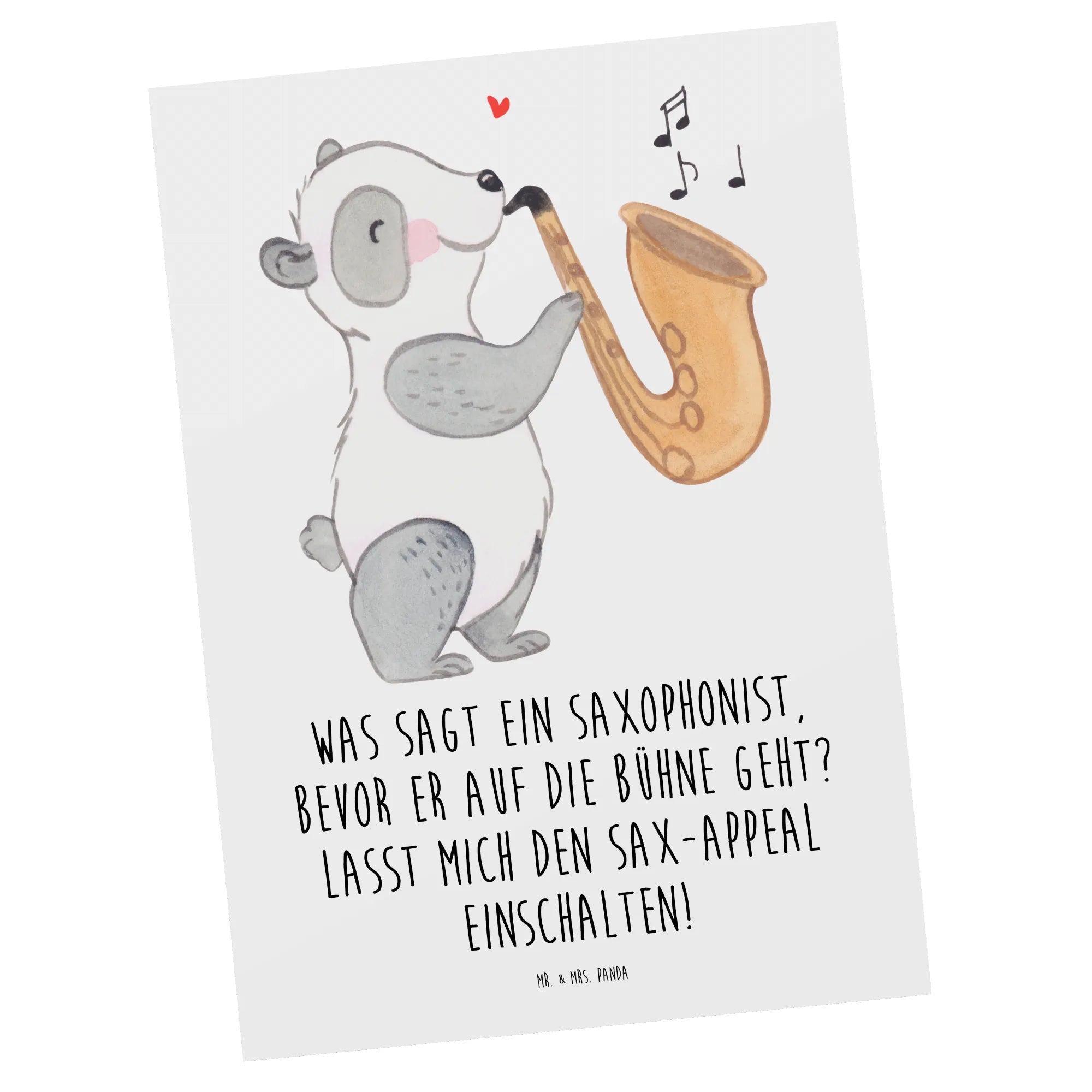 Die wunderschöne Postkarte mit dem Saxophonmotiv aus der Mr. & Mrs. Panda Kollektion „Musizieren & Instrumente“ ist ein ganz besonderes Geschenk für alle Musikliebhaber und Saxophonspieler! Egal ob zur Geburtstagsfeier eines Jazz-Fans, zur Einladung zu einer musikalischen Veranstaltung oder einfach als liebevolle Geste für einen Freund - diese Karte wird garantiert für Freude sorgen!