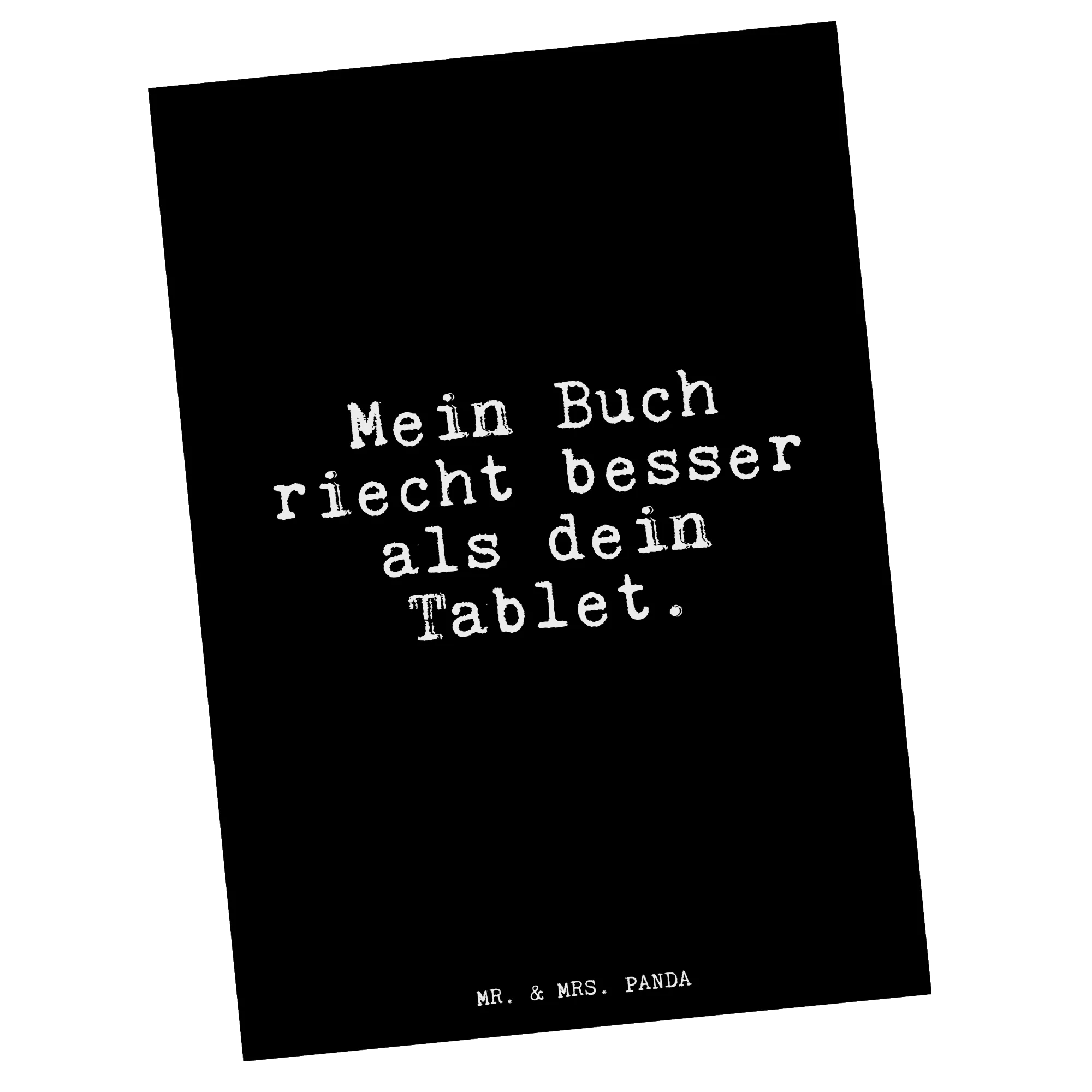 Die perfekte Postkarte für alle Bücherwürmer und Leseratten! Unsere Postkarte mit dem witzigen Spruch "Mein Buch riecht besser als dein Tablet" bringt garantiert ein Lächeln auf die Gesichter von Freunden und Familie.