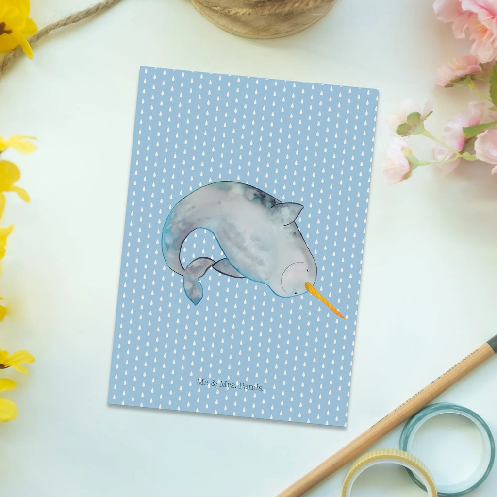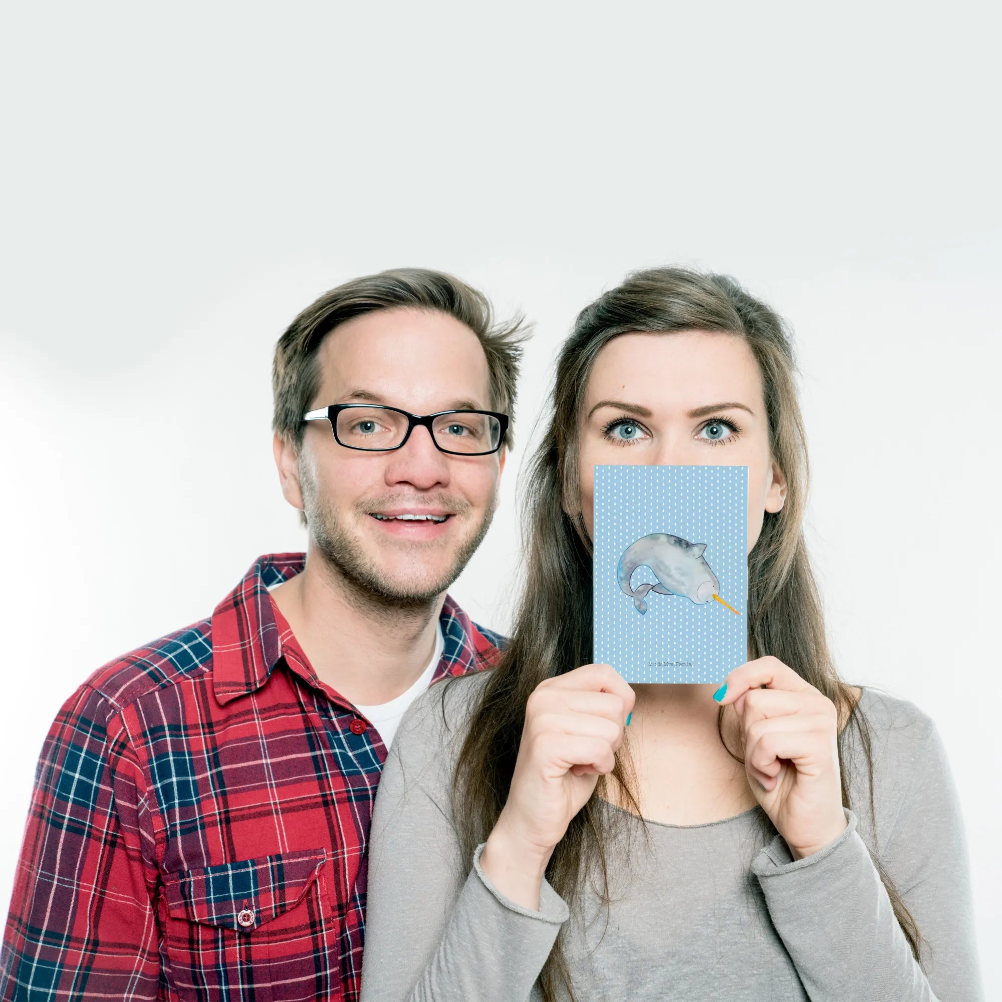 Die typisch sanfte Erscheinung des Narwals, der mit verschiedenen Blau- und Grautönen kunstvoll gestaltet wurde, verleiht der Karte eine fröhliche und entspannte Atmosphäre. Die Karte misst 150 mm x 1 mm und ist aus hochwertigem 300 Gramm Karton gefertigt. Der matt glänzende Druck sorgt für eine edle Optik, während die matte Rückseite die Möglichkeit bietet, eigene persönliche Nachrichten zu hinterlassen.