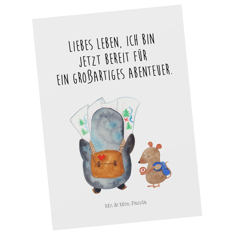 Mit viel Liebe von Mr. & Mrs. Panda handgezeichnet, zeigt dieses Motiv einen neugierigen Pinguin, der in eine Landkarte blickt, und eine schlaue Maus, die den Kompass prüft. Der inspirierende Spruch „Liebes Leben, ich bin jetzt bereit für ein großartiges Abenteuer.“ macht die Karte zur perfekten Grußkarte für alle, die aufbrechen, träumen oder Neues wagen möchten.