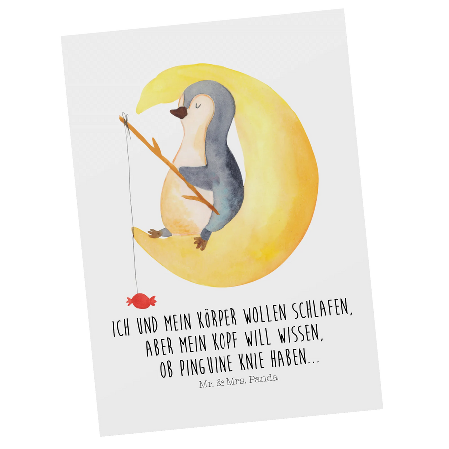 Die Wahl für die Pinguin Mond Postkarte ist ideal für Freunde, Familie oder Kollegen, die den besonderen Humor und die charmanten Designs von Mr. & Mrs. Panda schätzen. Der Spruch "Ich und mein Körper wollen schlafen, aber mein Kopf will wissen, ob Pinguine Knie haben..." sorgt dafür, dass diese Karte nicht nur schön anzusehen, sondern auch zum Schmunzeln bringt. Sie ist perfekt, um sie als Einladung oder Ansichtskarte zu verwenden.