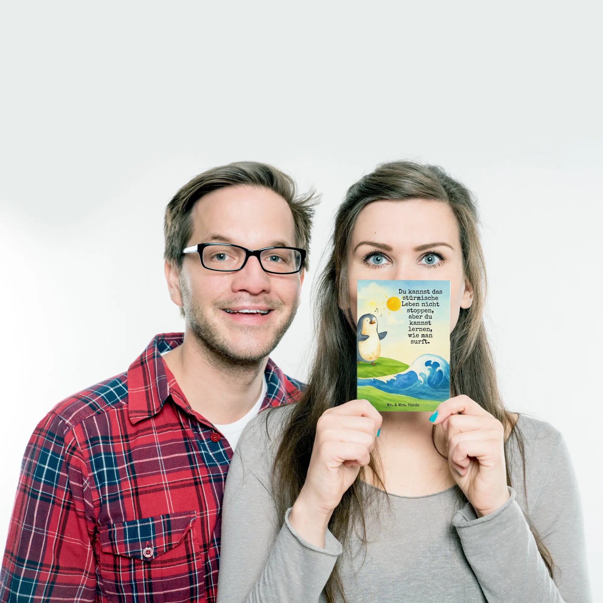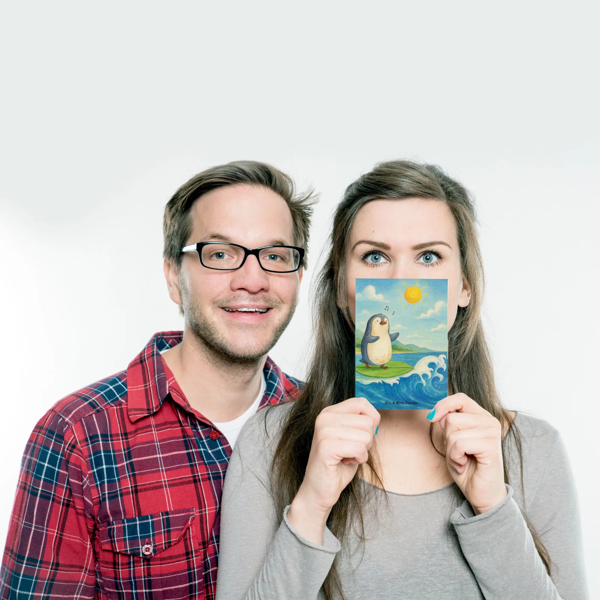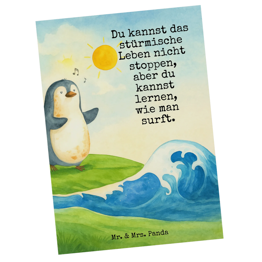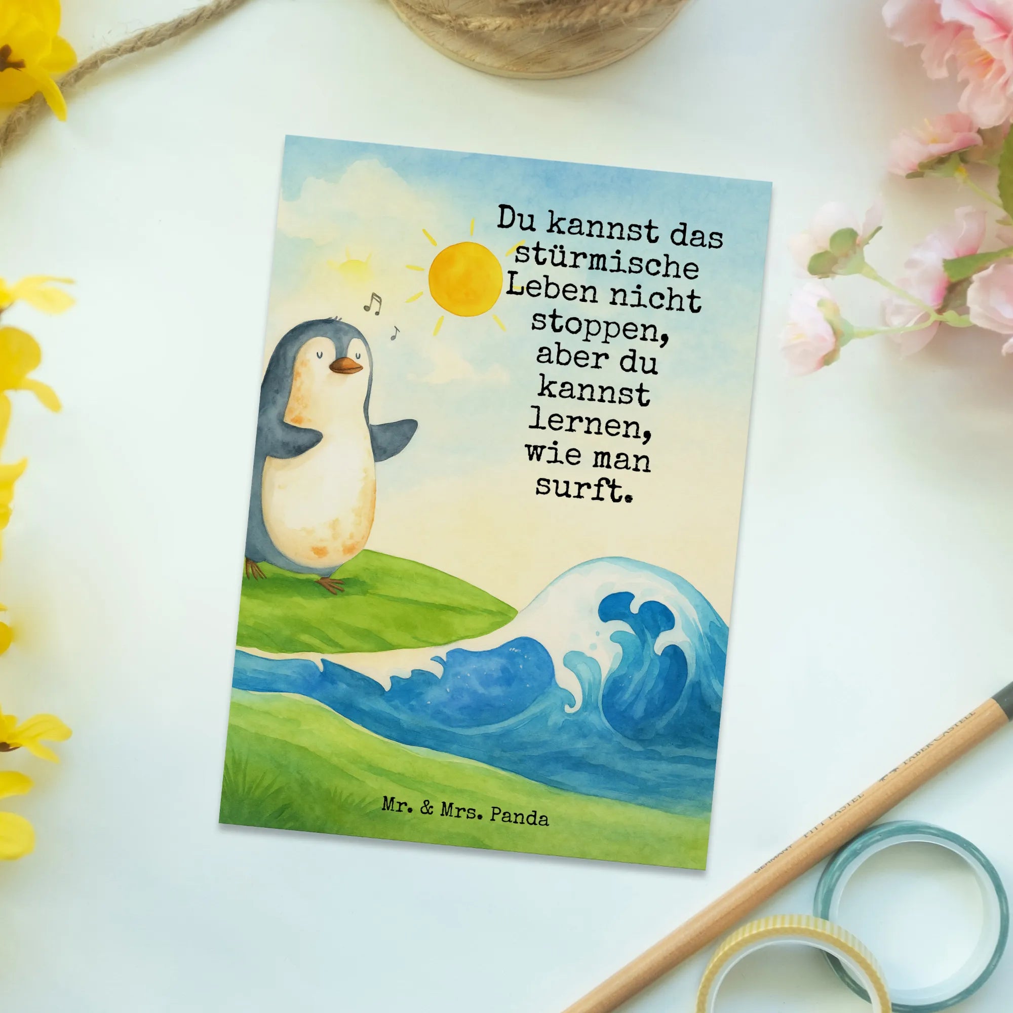 Mr. & Mrs. Panda präsentiert: Postkarte „Pinguin Surfer“ – ein kleiner Sonnenschein für Meer- und Surf-Fans 🌊🐧