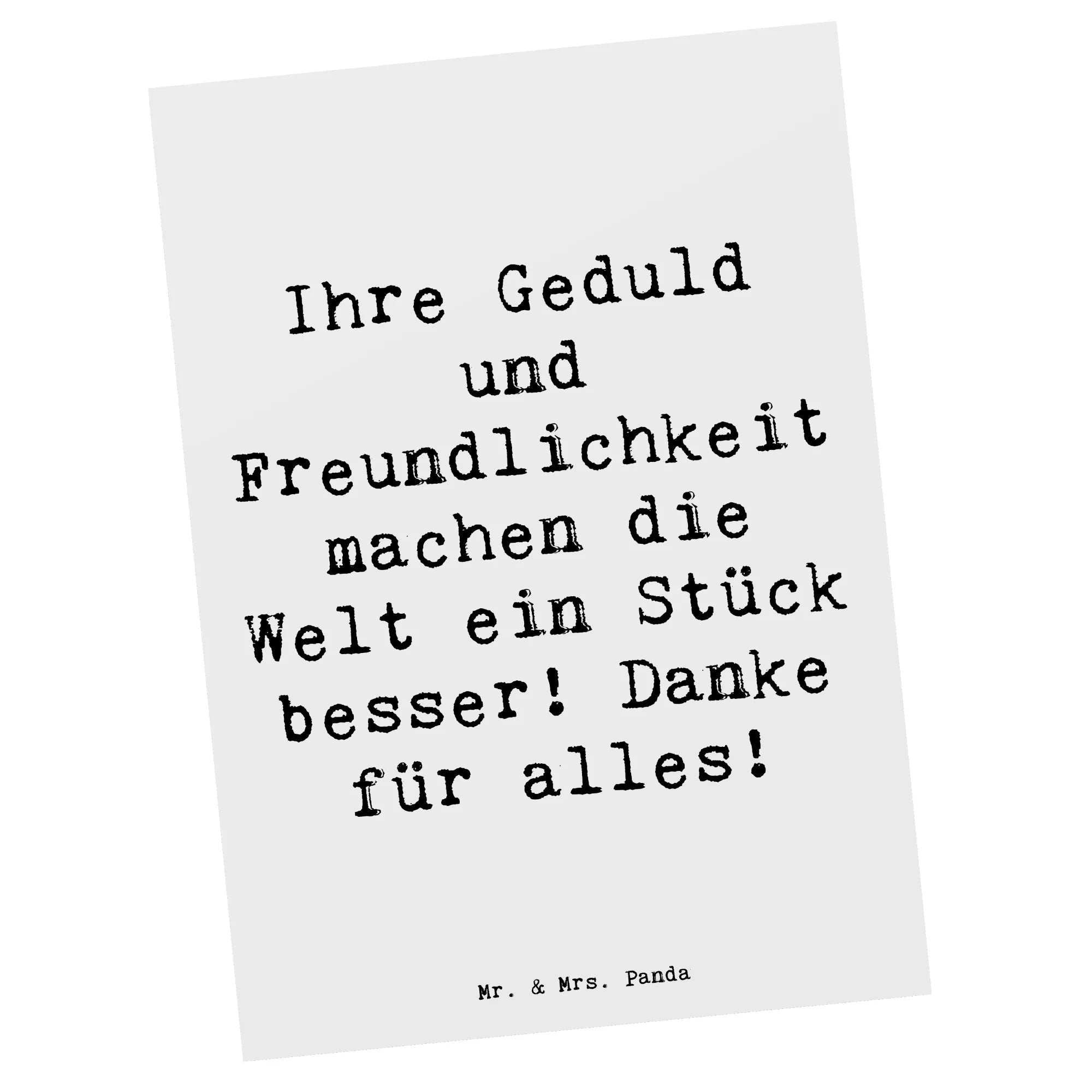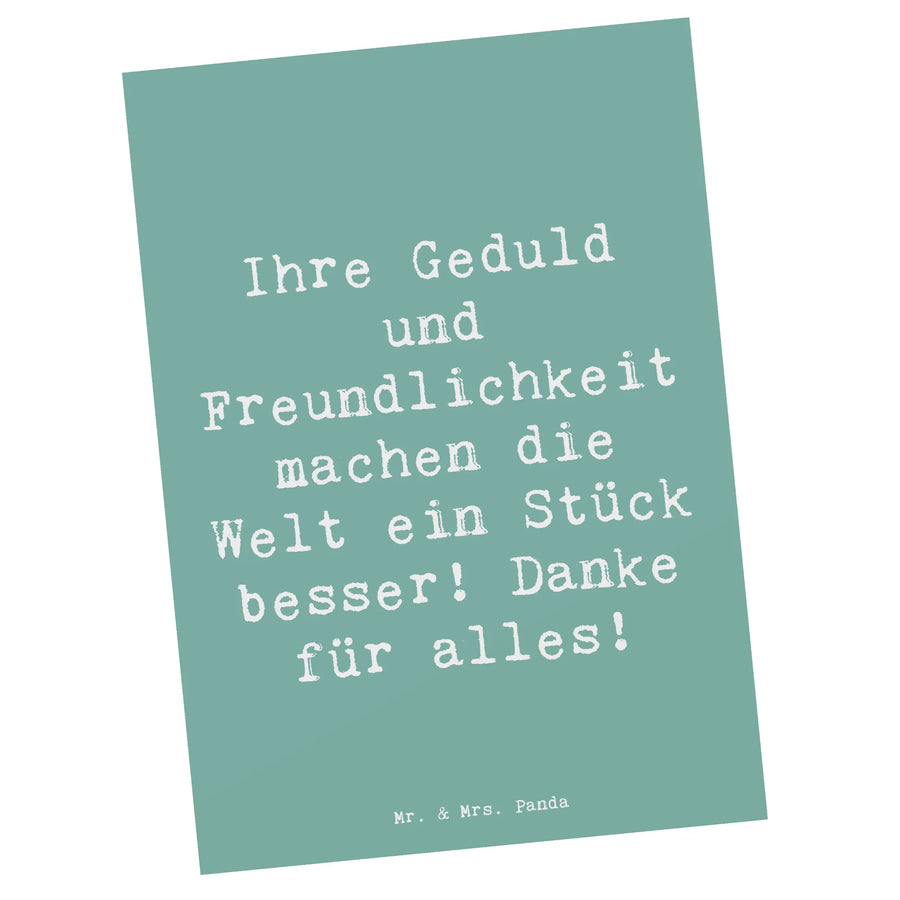 Die Postkarte 'Erzieher' aus der einzigartigen Danke-Kollektion von Mr. & Mrs. Panda ist das perfekte Geschenk, um deine Dankbarkeit auf eine herzliche und unvergessliche Art auszudrücken. Ob für Erzieher, Lehrer oder Freunde – diese Karte eignet sich für jeden Anlass, bei dem ein großes Danke verdient ist! Mit dem liebevollen Slogan "Ihre Geduld und Freundlichkeit machen die Welt ein Stück besser! Danke für alles!" bringt sie ein Lächeln auf die Gesichter der Beschenkten.