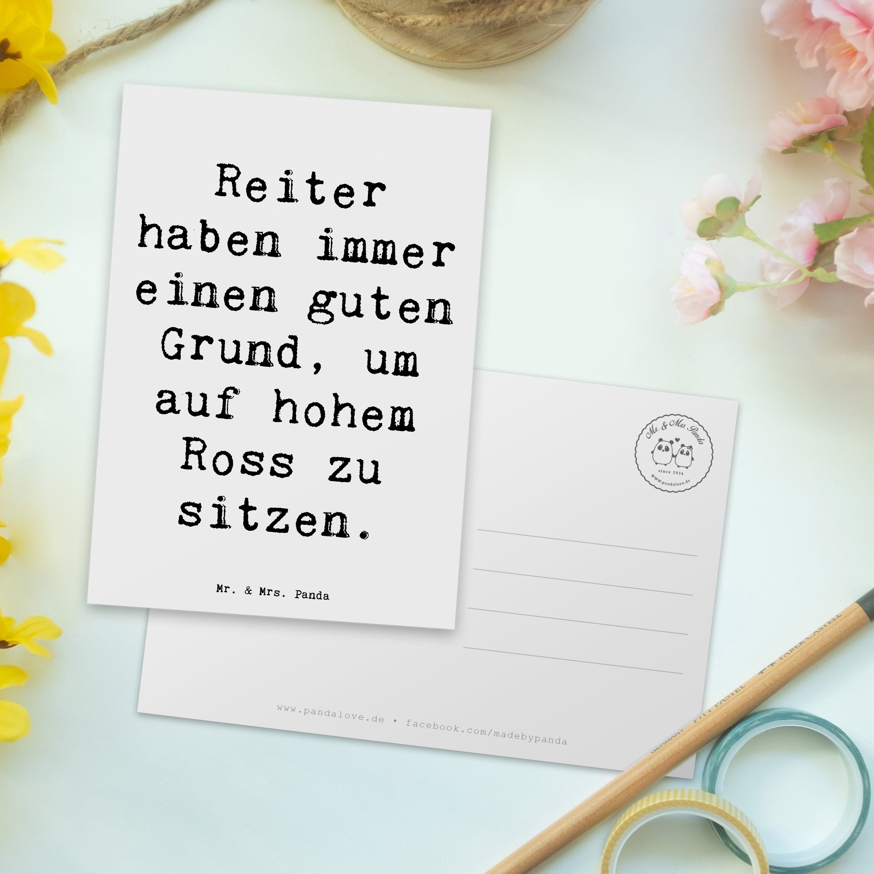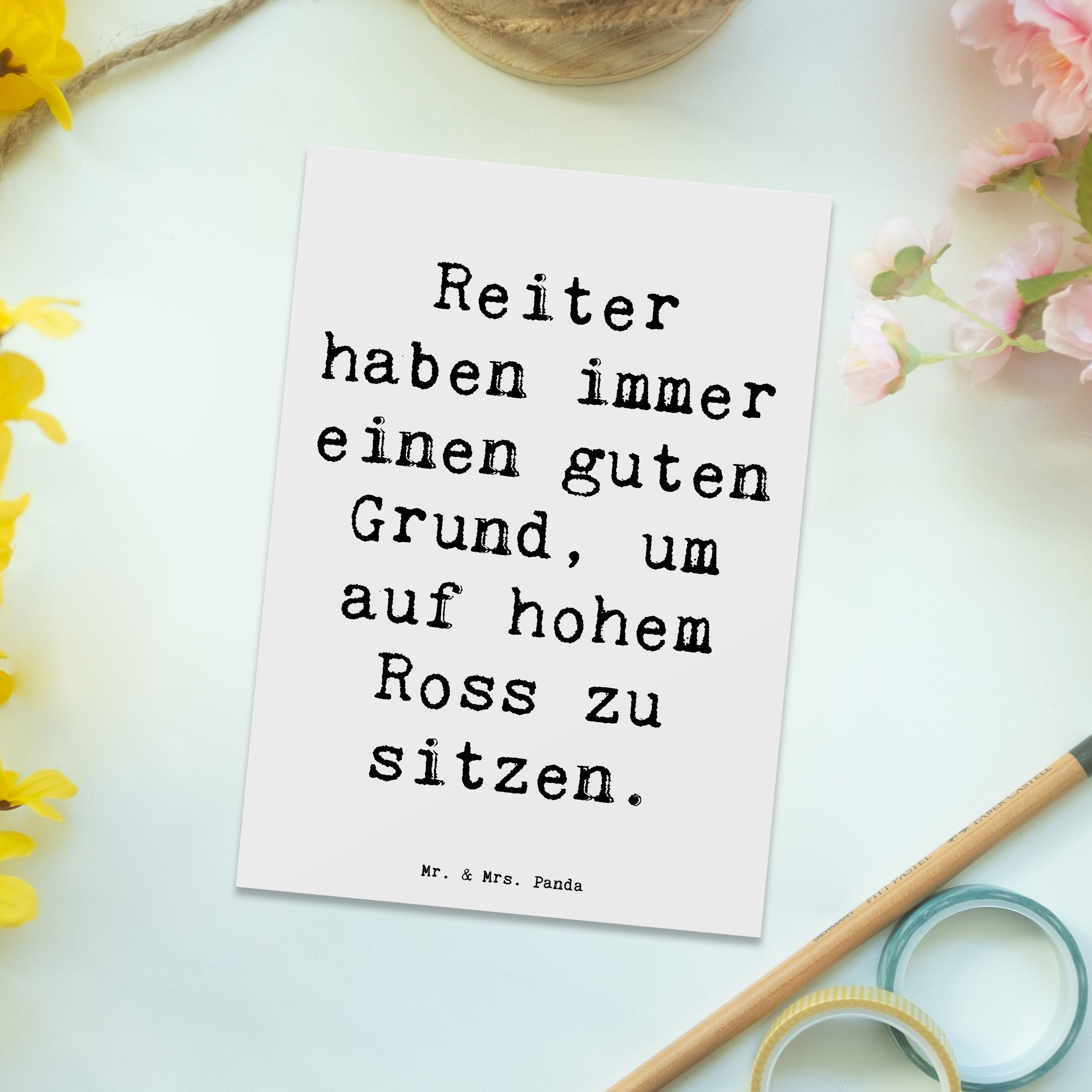 Entdecke unsere zauberhafte Postkarte im Reitsport-Motiv aus der Kollektion Sportarten von Mr. & Mrs. Panda! Diese Postkarte ist nicht nur ein einfaches Stück Karton, sondern ein liebevolles Geschenk für alle Pferdefreunde und Reitsportbegeisterte. Mit dem charmanten Spruch 'Reiter haben immer einen guten Grund, um auf hohem Ross zu sitzen' bringt diese Karte ein Lächeln auf die Gesichter Deiner Liebsten.