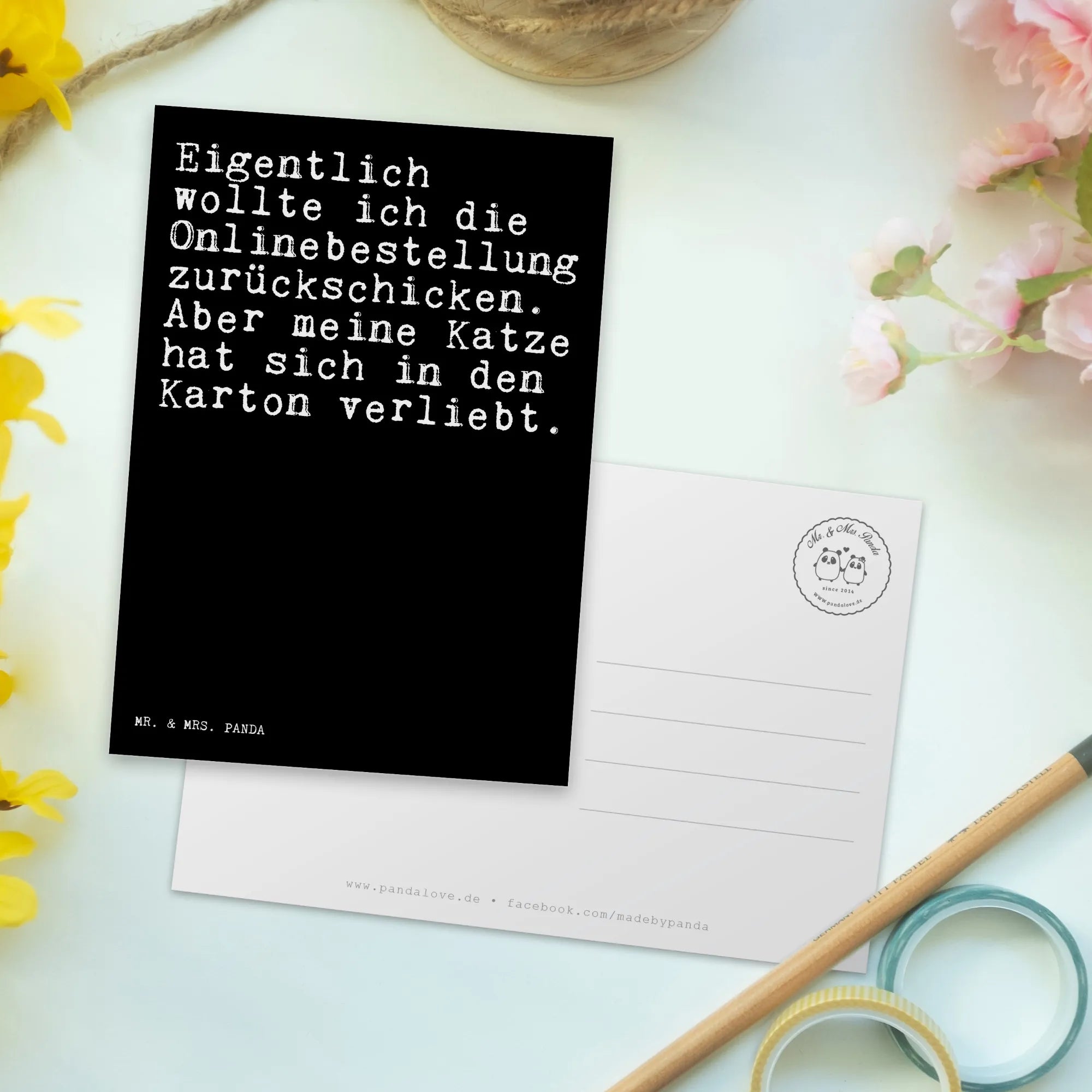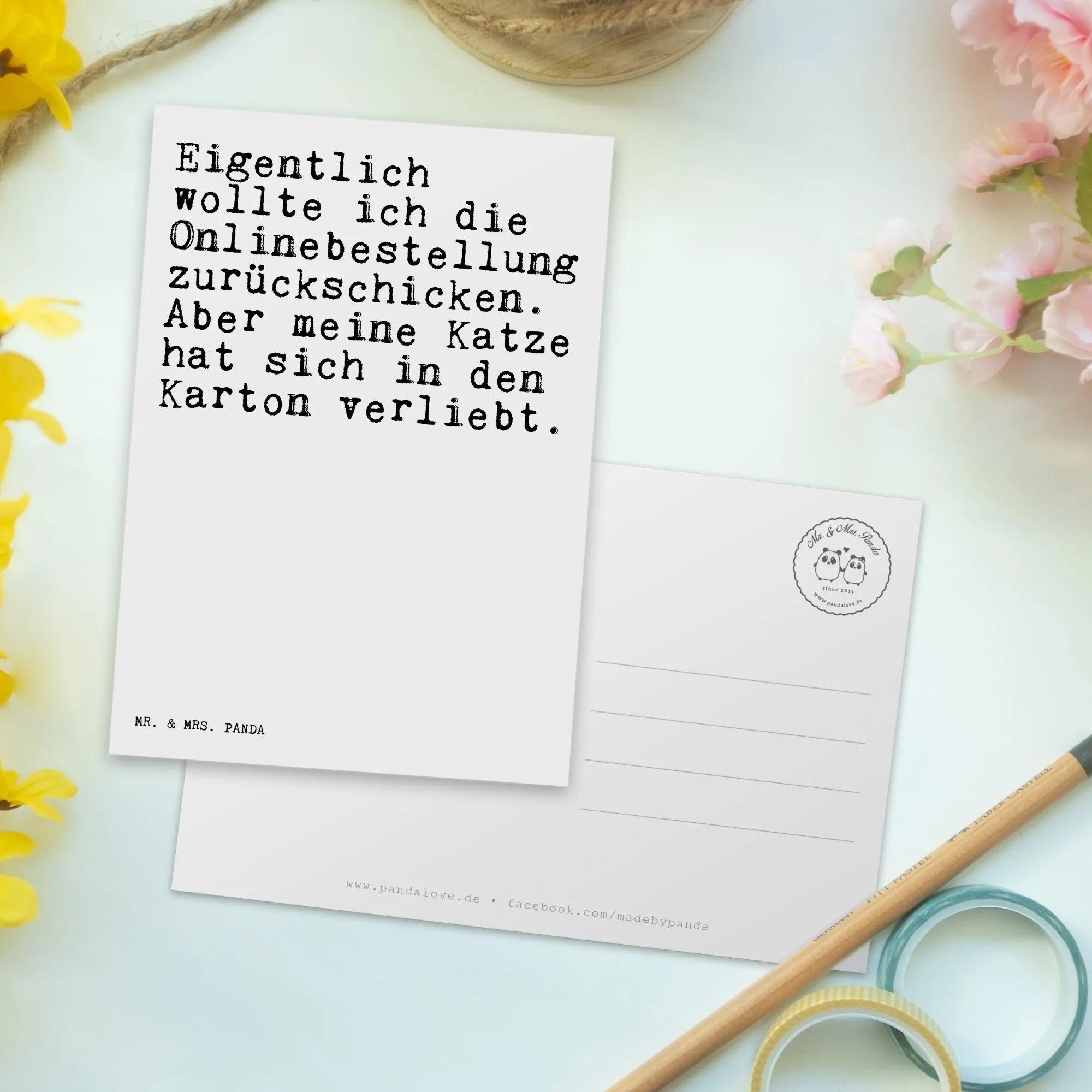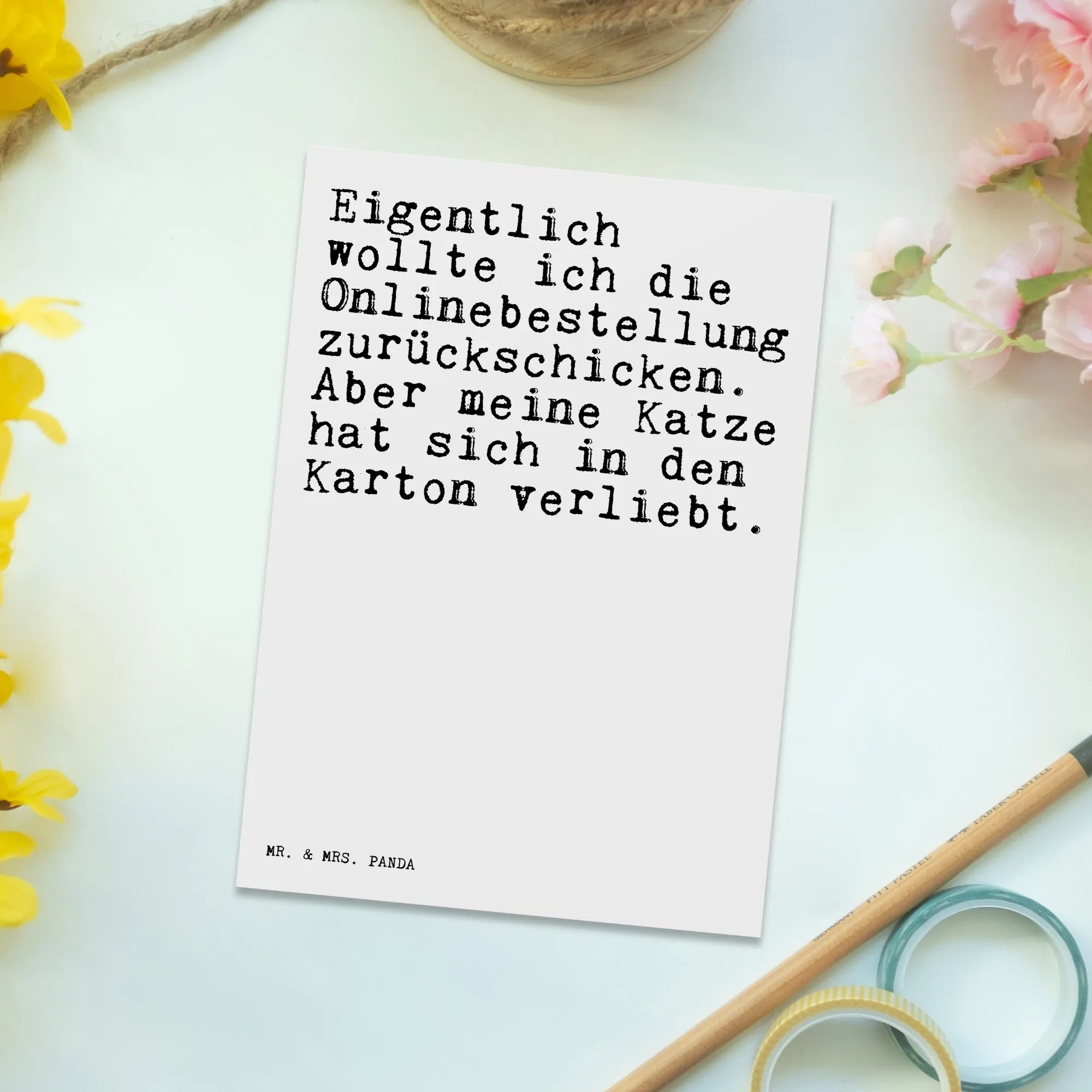 Du suchst das perfekte Geschenk für Katzenliebhaber? Dann ist die Postkarte von Mr. & Mrs. Panda genau das Richtige für dich! Mit dem witzigen Spruch 'Eigentlich wollte ich die Onlinebestellung zurückschicken. Aber meine Katze hat sich in den Karton verliebt.' bringt sie jedes Katzenherz zum Lachen. Diese einzigartige Postkarte ist ideal für viele Anlässe – sei es ein Geburtstag, ein Dankeschön oder einfach als kleine Freude zwischendurch.