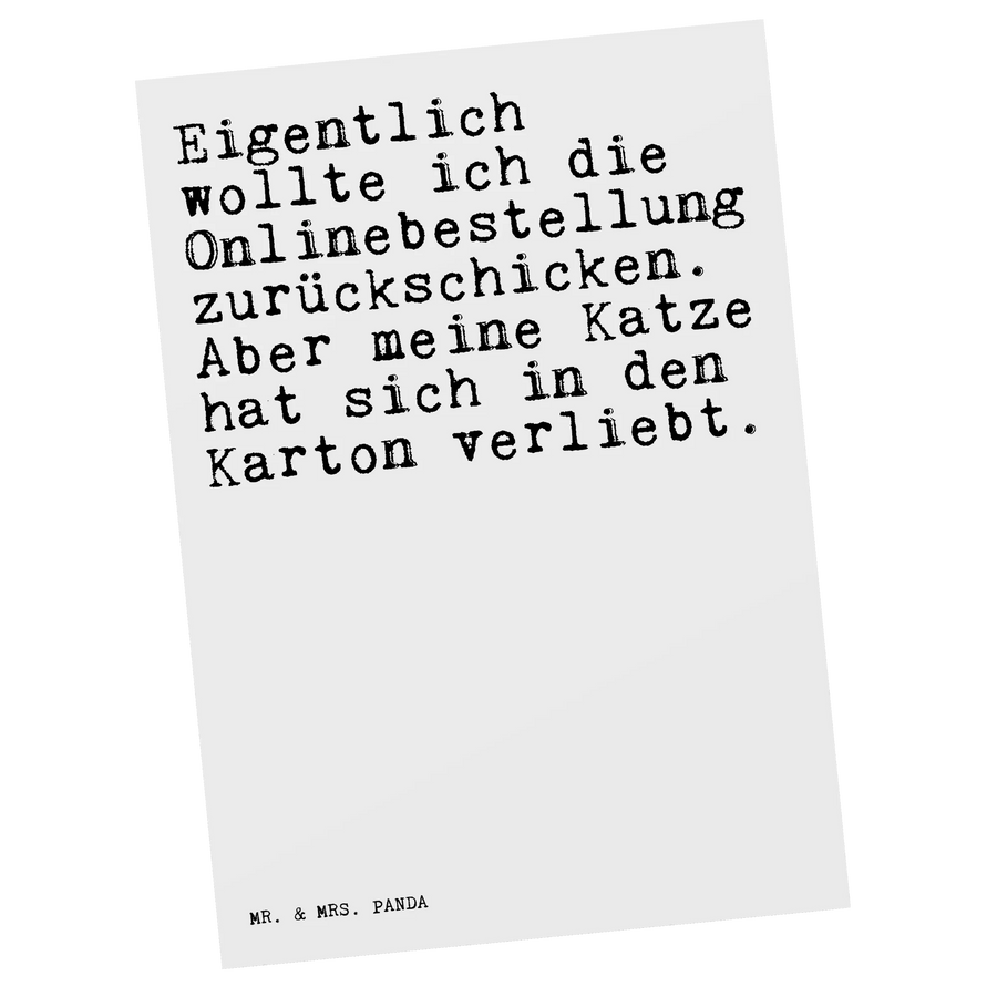 Entdecke die zauberhafte Postkarte mit dem Spruch "Eigentlich wollte ich die Onlinebestellung zurückschicken. Aber meine Katze hat sich in den Karton verliebt." Die charmante Postkarte von Mr. & Mrs. Panda ist perfekt für alle Katzenliebhaber und eignet sich hervorragend, um einem lieben Menschen ein Lächeln ins Gesicht zu zaubern. Ob zum Geburtstag, als Dankeskarte oder einfach nur so – diese Karte bringt Freude und ein Stückchen Humor in den Alltag.