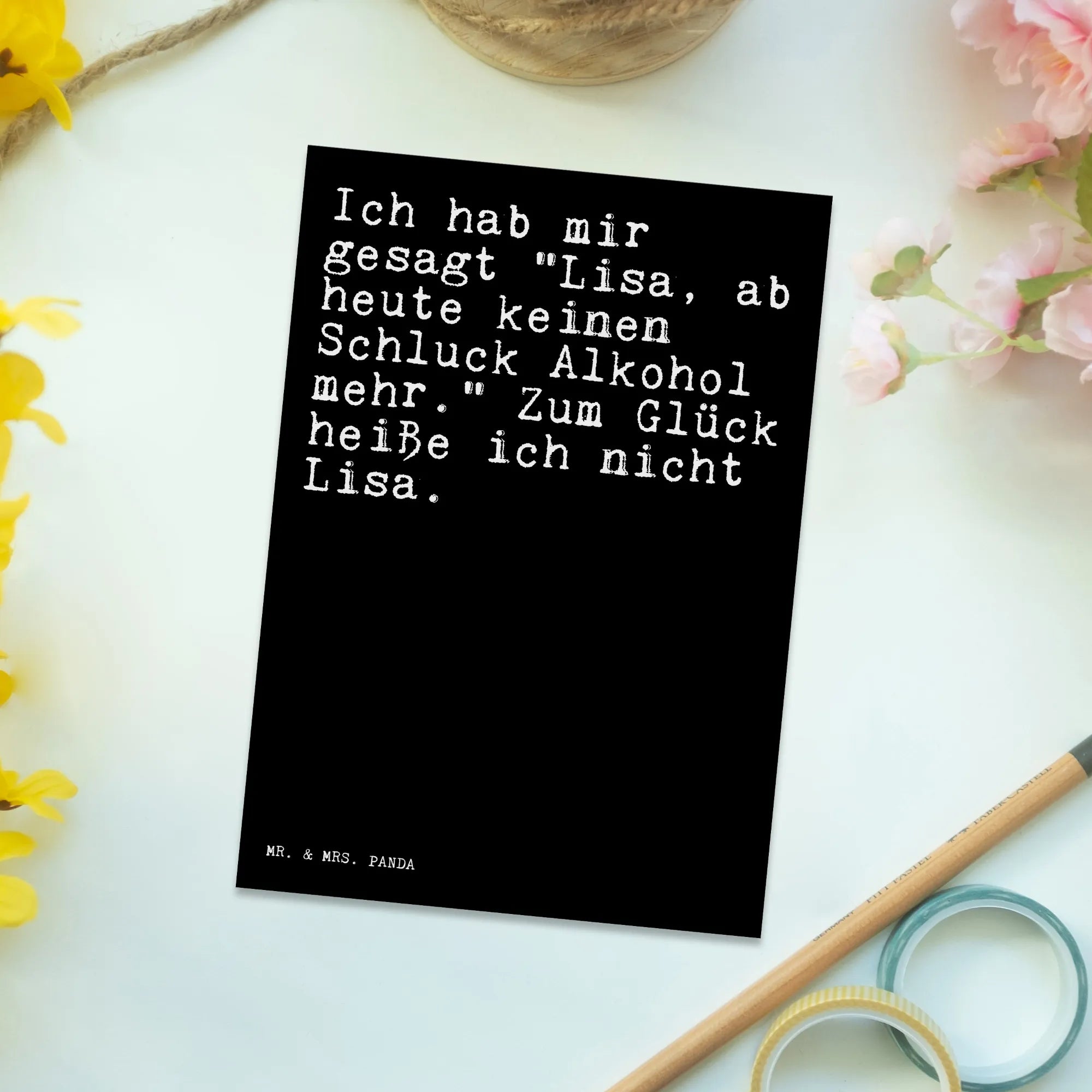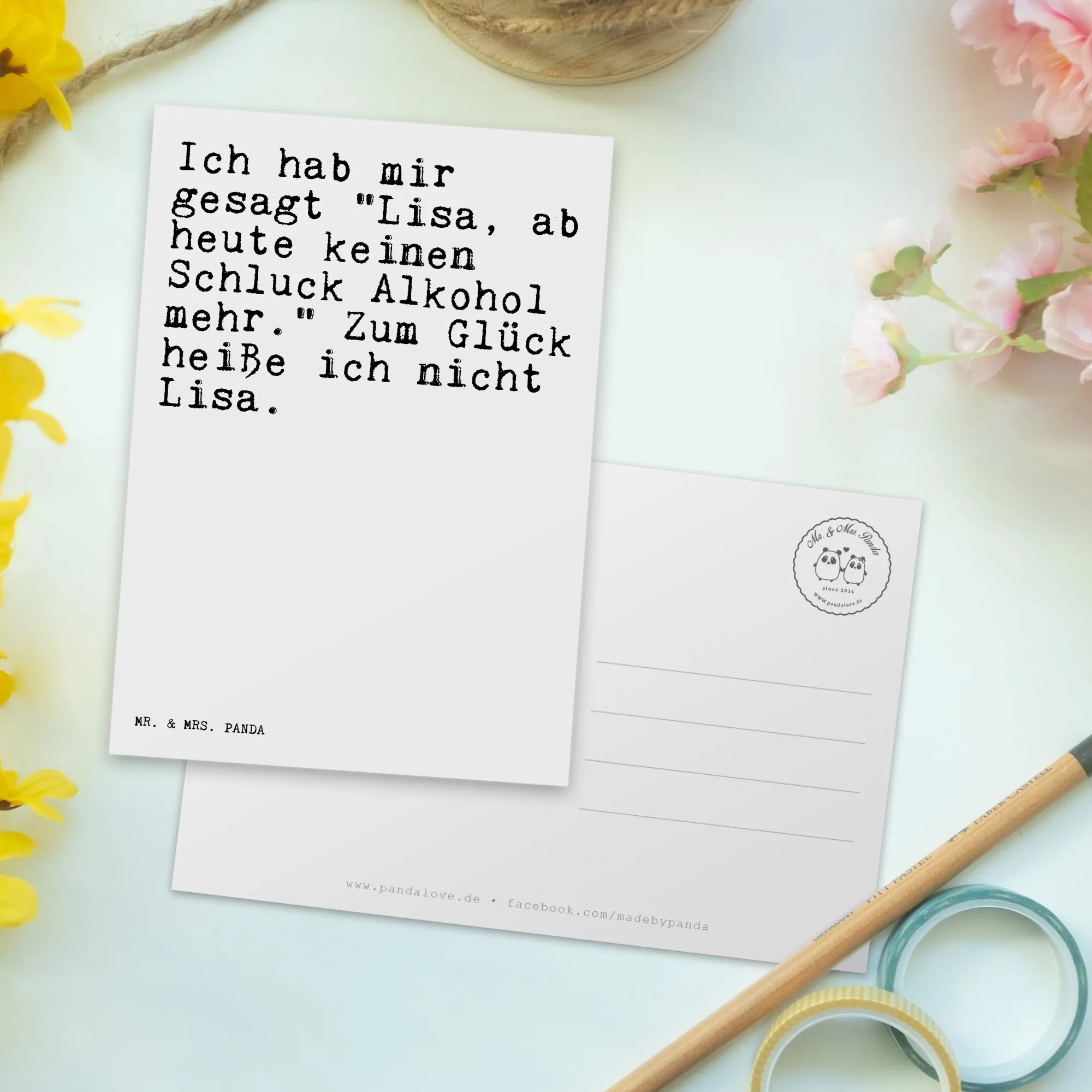 Die perfekte Postkarte für alle, die gerne das Leben mit einem Augenzwinkern betrachten! Diese einzigartige Postkarte von Mr. & Mrs. Panda ist ein ganz besonderes Geschenk für Freunde, die miterleben, wie jemand beschließt, weniger oder keinen Alkohol mehr zu konsumieren. Mit dem witzigen Spruch "Ich hab mir gesagt 'Lisa, ab heute keinen Schluck Alkohol mehr.' Zum Glück heiße ich nicht Lisa!" bringt sie ein Lächeln auf die Gesichter deiner Lieben.
