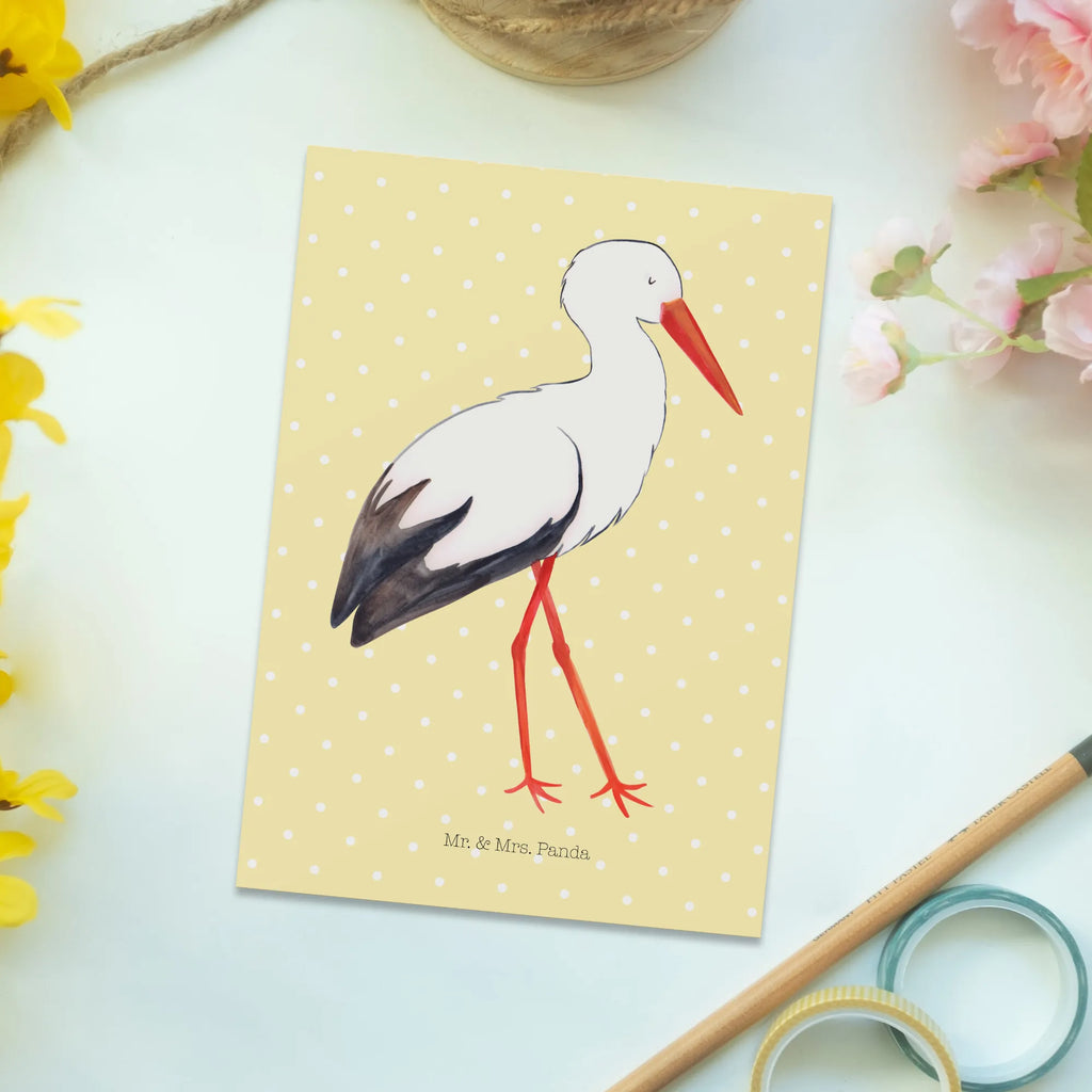 Postkarte Storch - mit Spruch - Gelb Pastell
