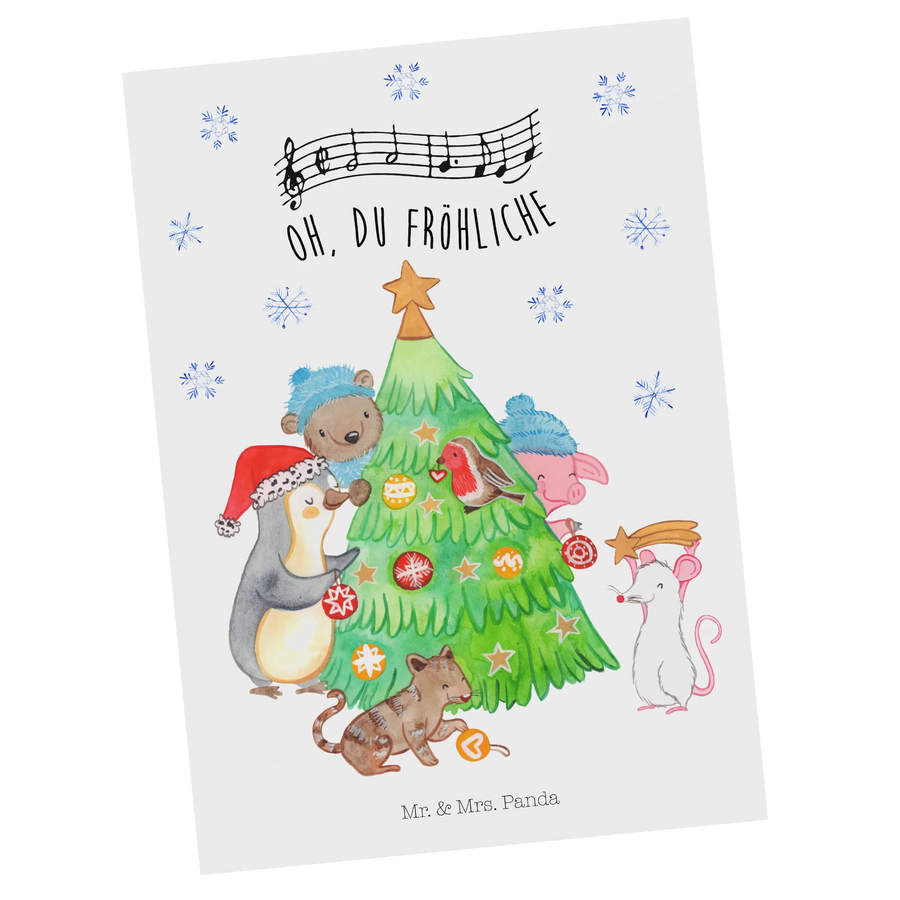 Juhuu – die Winterzeit ist da! Unsere liebevoll gestaltete Postkarte „Weihnachtsbaum schmücken“ aus der Winter Kollektion von Mr. & Mrs. Panda bringt Weihnachtsstimmung pur. Auf der Vorderseite siehst Du ein zauberhaftes Motiv: Ein Pinguin, ein Schwein, eine Maus, eine Katze und ein Bär stehen fröhlich um einen Weihnachtsbaum und schmücken ihn gemeinsam. Der Slogan „Oh, du fröhliche“ macht die Karte besonders herzlich.