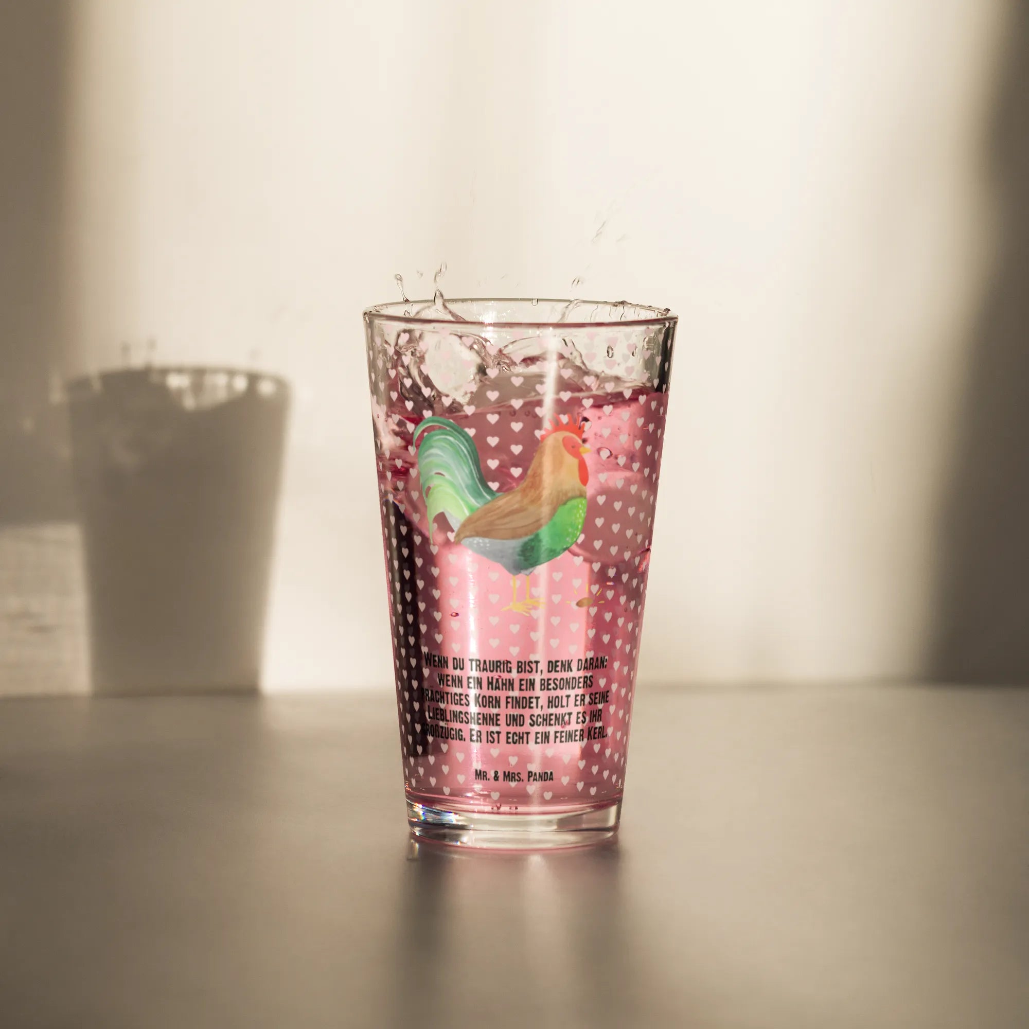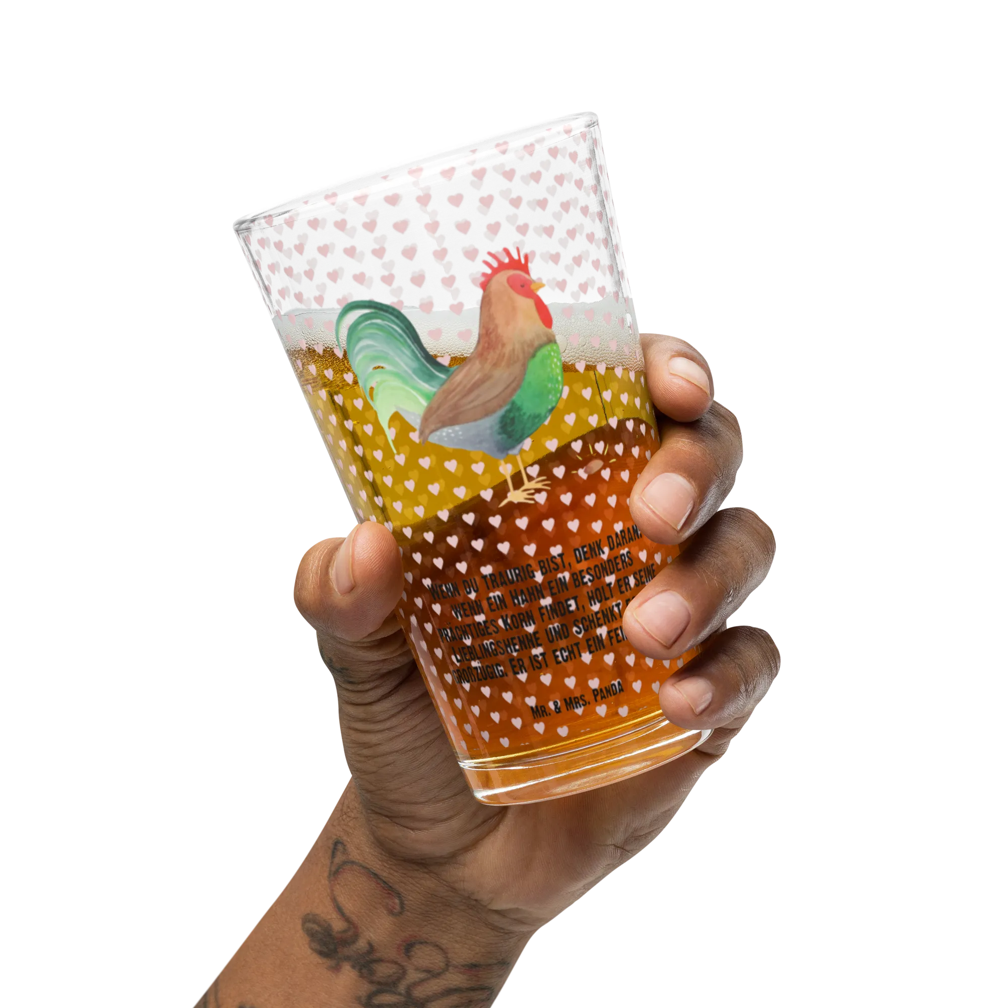 Das Premium Trinkglas "Hahn mit Korn" aus der Bauernhof Kollektion von Mr. & Mrs. Panda ist das perfekte Geschenk für Tierliebhaber und Naturfreunde! Mit seinem liebevoll gestalteten Motiv eines stolzen Hahns, der großzügig ein prächtiges Korn teilt, bringt dieses Glas Freude und eine Portion ländlichen Charme in jeden Haushalt.