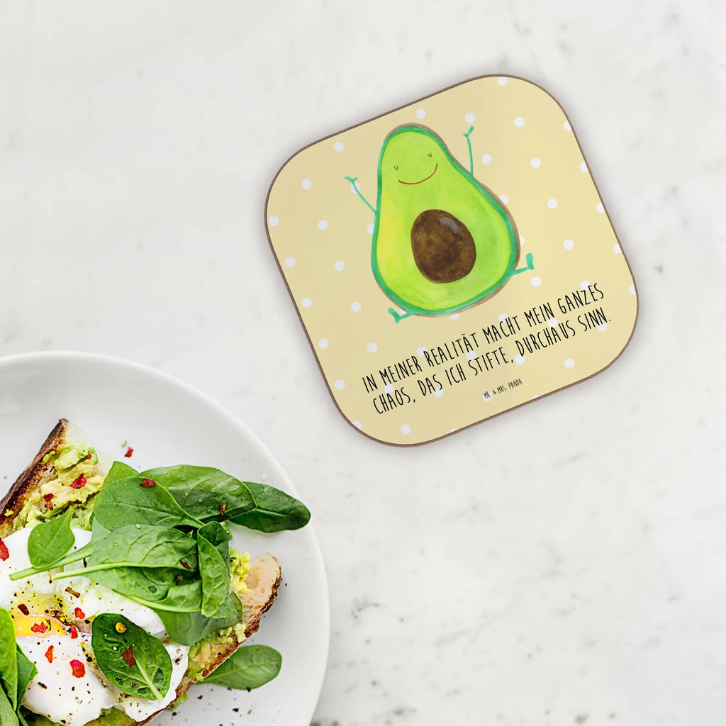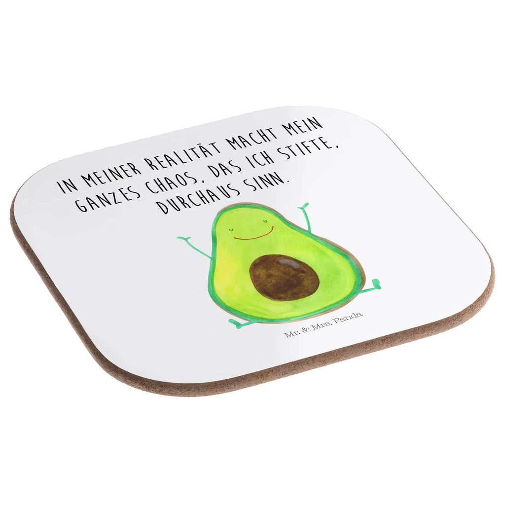Bring Farbe und gute Laune auf deinen Tisch! Unser quadratischer Untersetzer „Avocado Happy" aus der Avocado-Kollektion von Mr. & Mrs. Panda vereint Design, Humor und Funktionalität. Die fröhliche Avocado mit erhobenen Armen und der liebevolle Spruch "In meiner Realität macht mein ganzes Chaos, das ich stifte, durchaus Sinn." sorgen für ein Lächeln bei jedem Getränk. 🥑😊