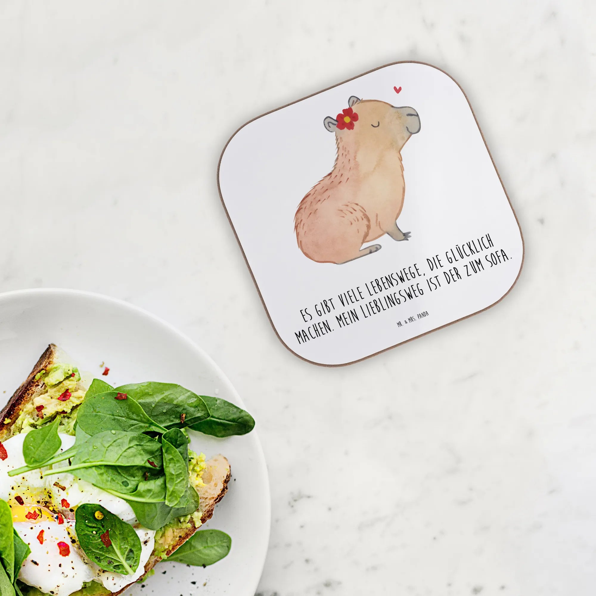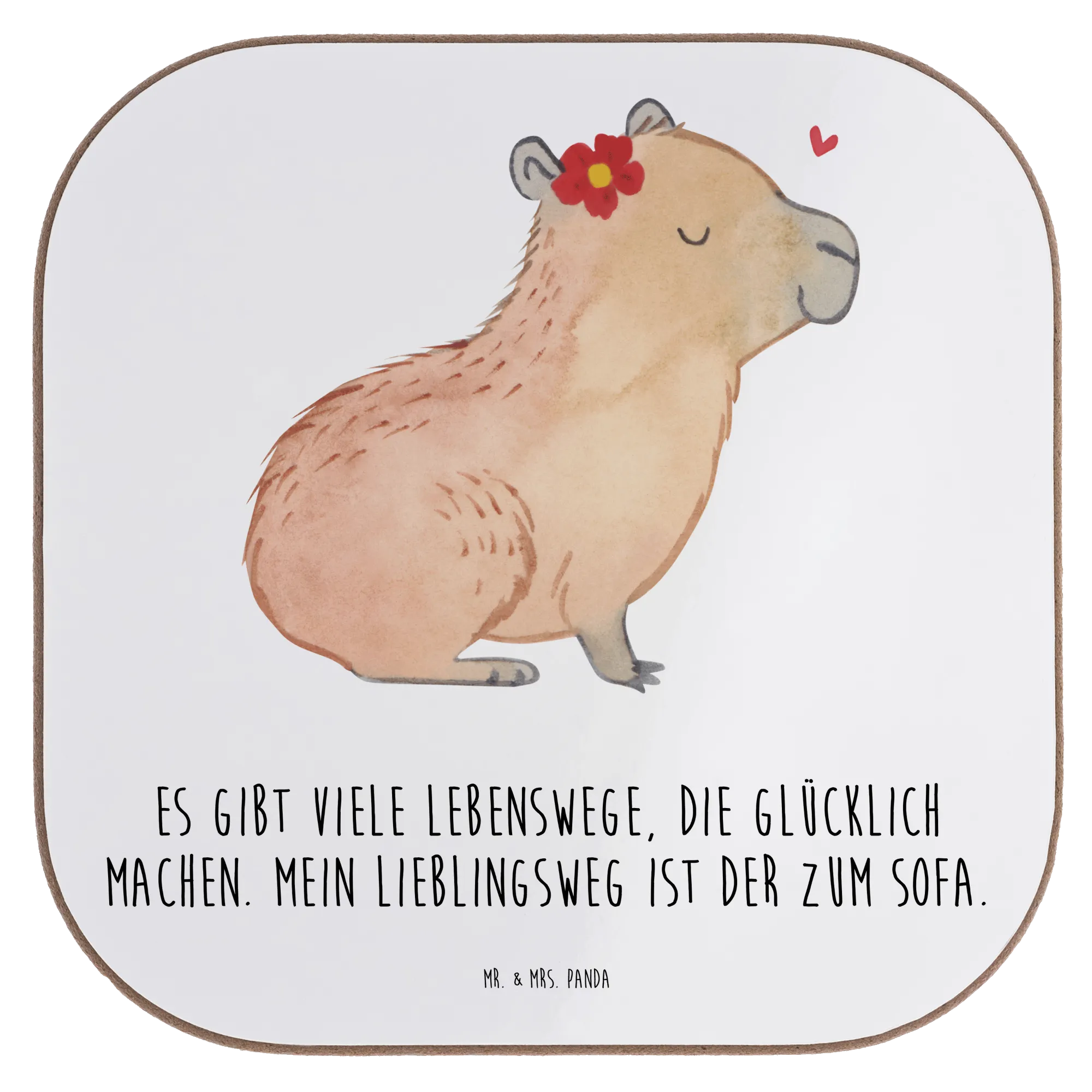 Das liebevoll gestaltete Motiv zeigt ein entspanntes Capybara mit einer fröhlichen roten Blume im Haar und einem kleinen Herzchen, das einen Hauch von Wärme und Gemütlichkeit verströmt. Ob beim entspannten Drink auf dem Sofa oder beim geselligen Abendessen mit Freunden – dieser Untersetzer ist nicht nur funktional, er bringt auch Freude in dein Zuhause!